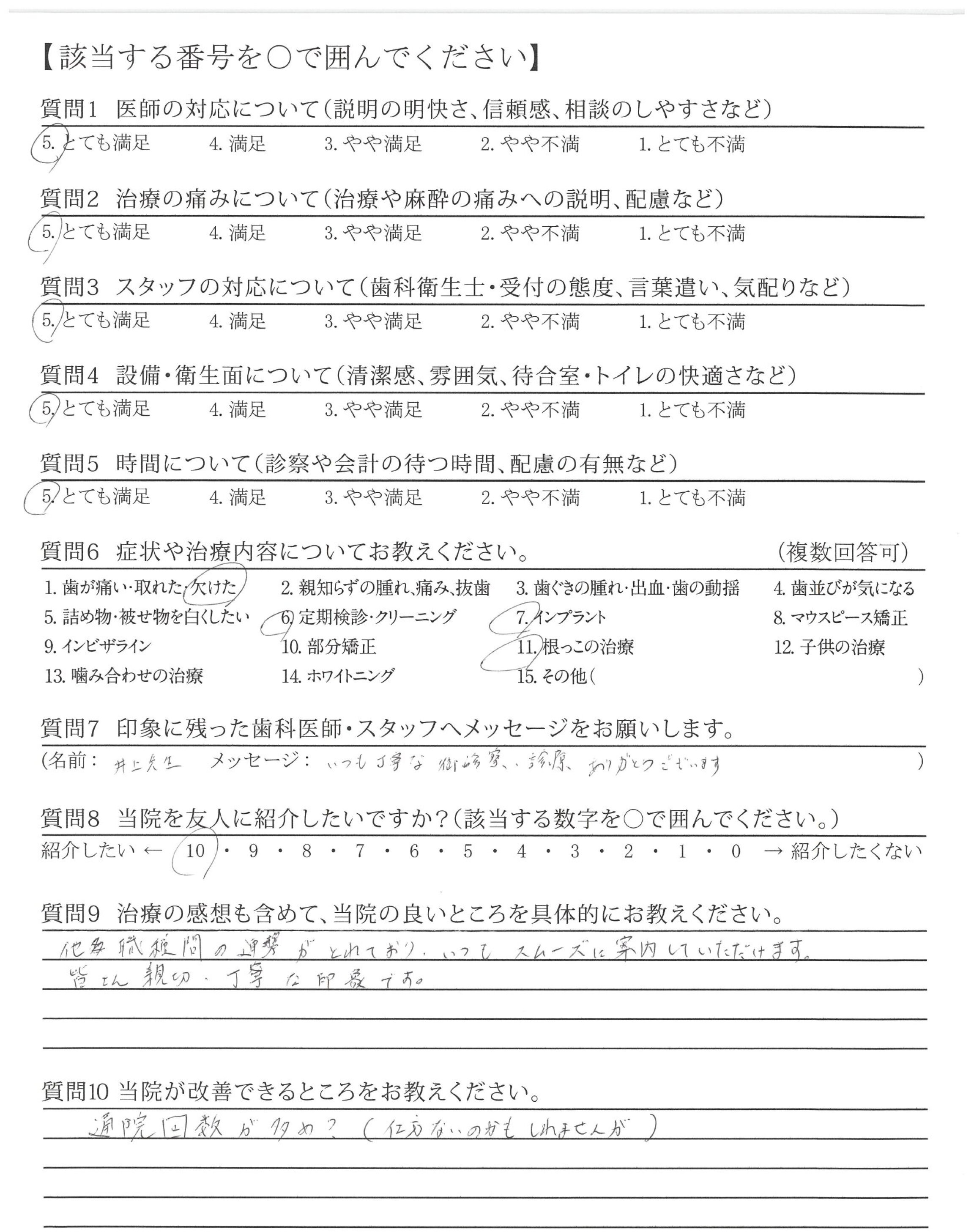 ・歯の治療に関して、予約の日程によっては、いろいろな先生方に、治療にあたって頂いているのですが、申し送りが出来ていれば安心ですが、出来れば1つの治療については、同じ先生であれば、安心します。