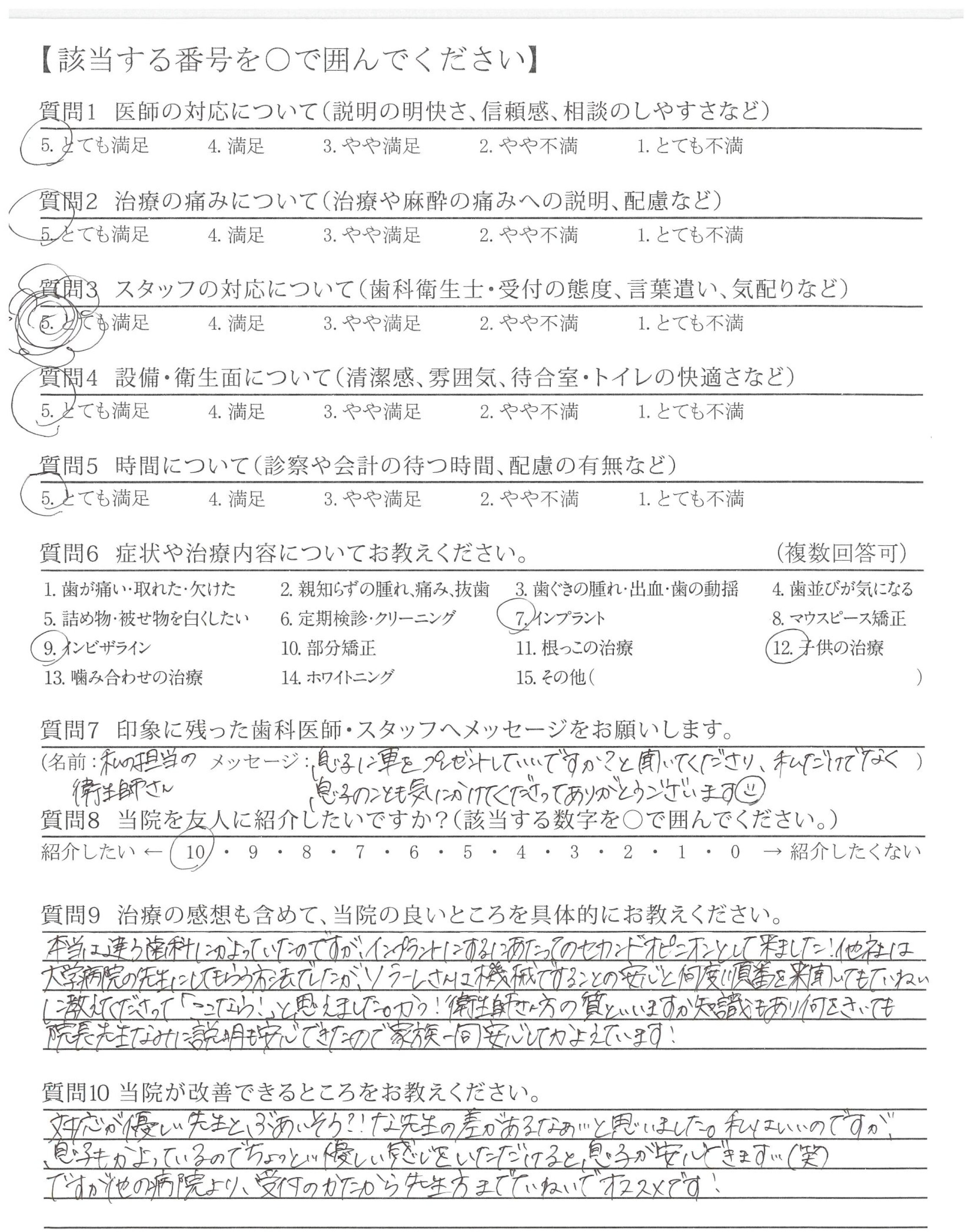 本当は違う歯科にかよっていたのですが、インプラントにするにあたってのセカンドオピニオンとして来ました!他社は大学病院の先生にしてもらう方法でしたが、ソラーレさんは機械ですることの安心と何度順番を聞いてもていねいに教えてくださって「ここなら!」と思えました。かつ!衛生師さん方の質といいますか知識もあり何をきいても院長先生なみに説明も安心できたので家族一同安心してかよています!