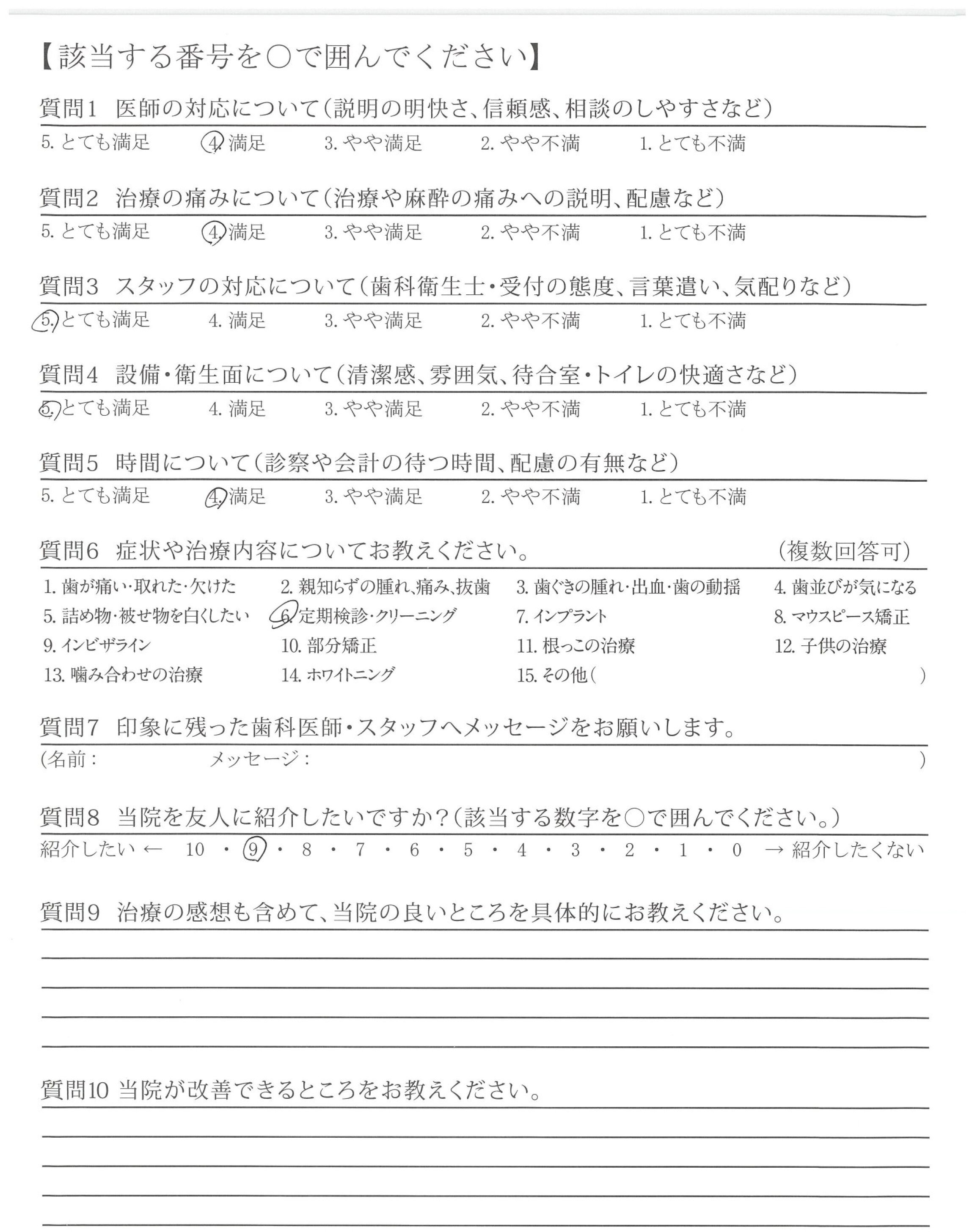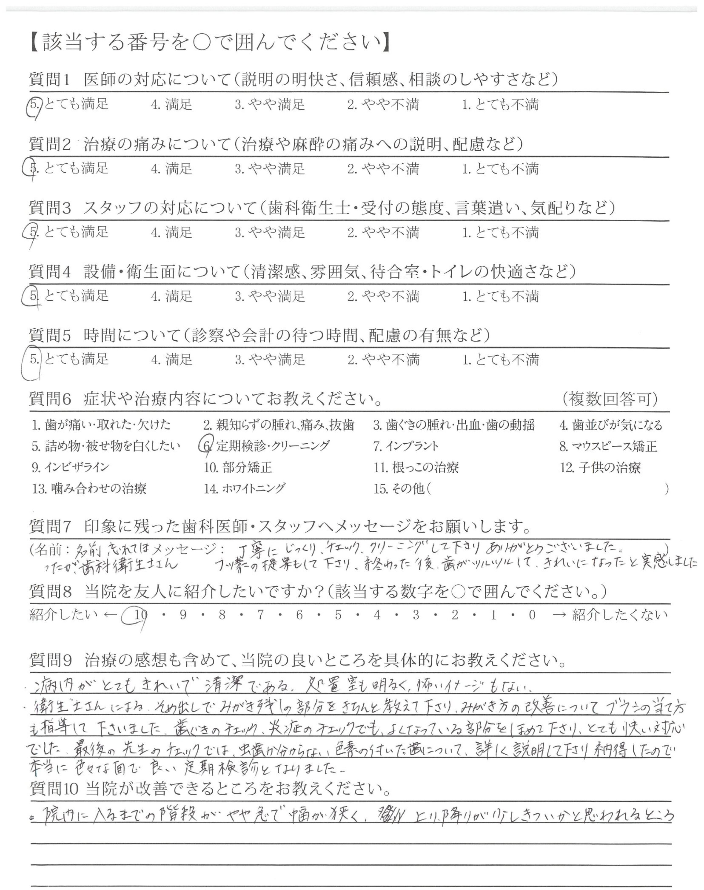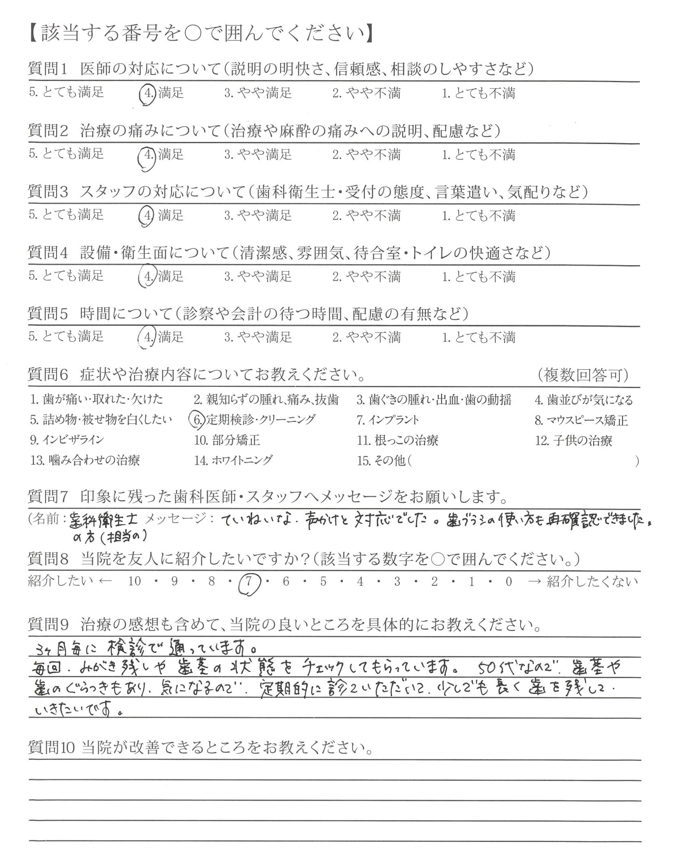 歯ぐきのチェック、炎症のチェックでも、よくなっている部分をほめて下さり、とても快い対応でした。