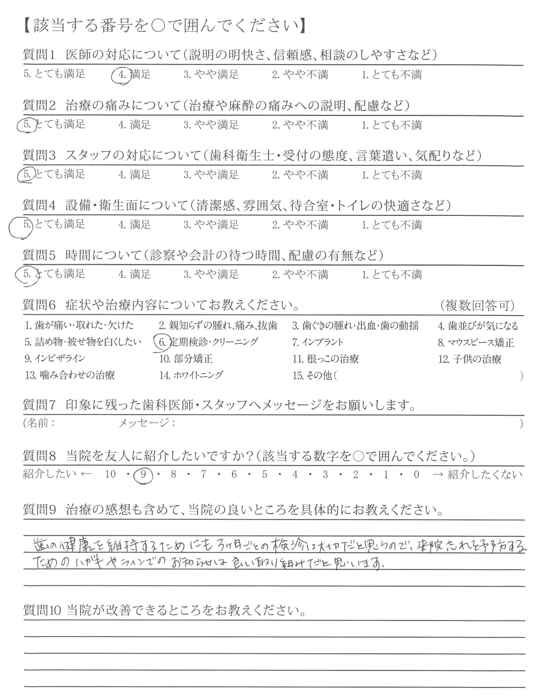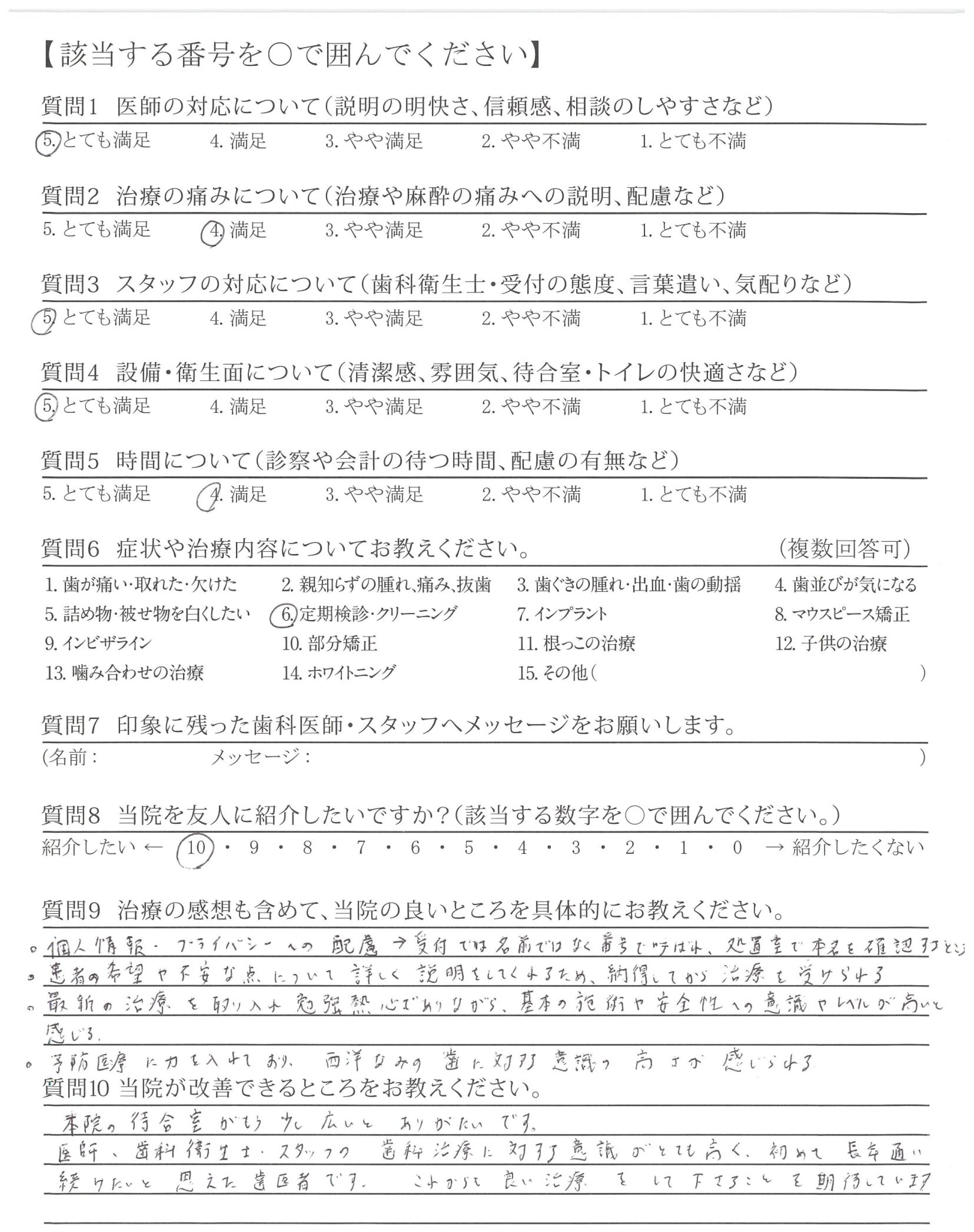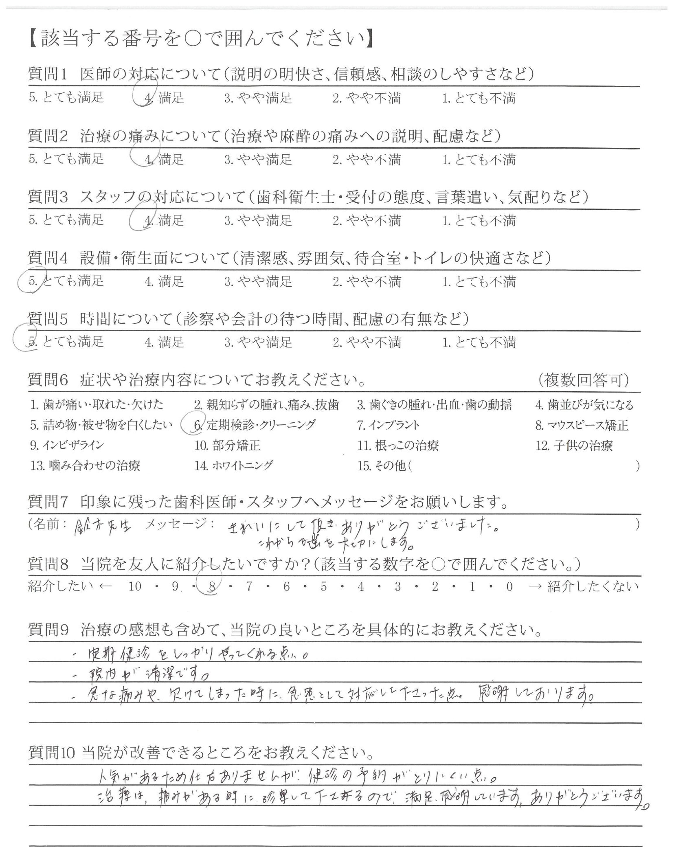 歯ぐきのチェック、炎症のチェックでも、よくなっている部分をほめて下さり、とても快い対応でした。