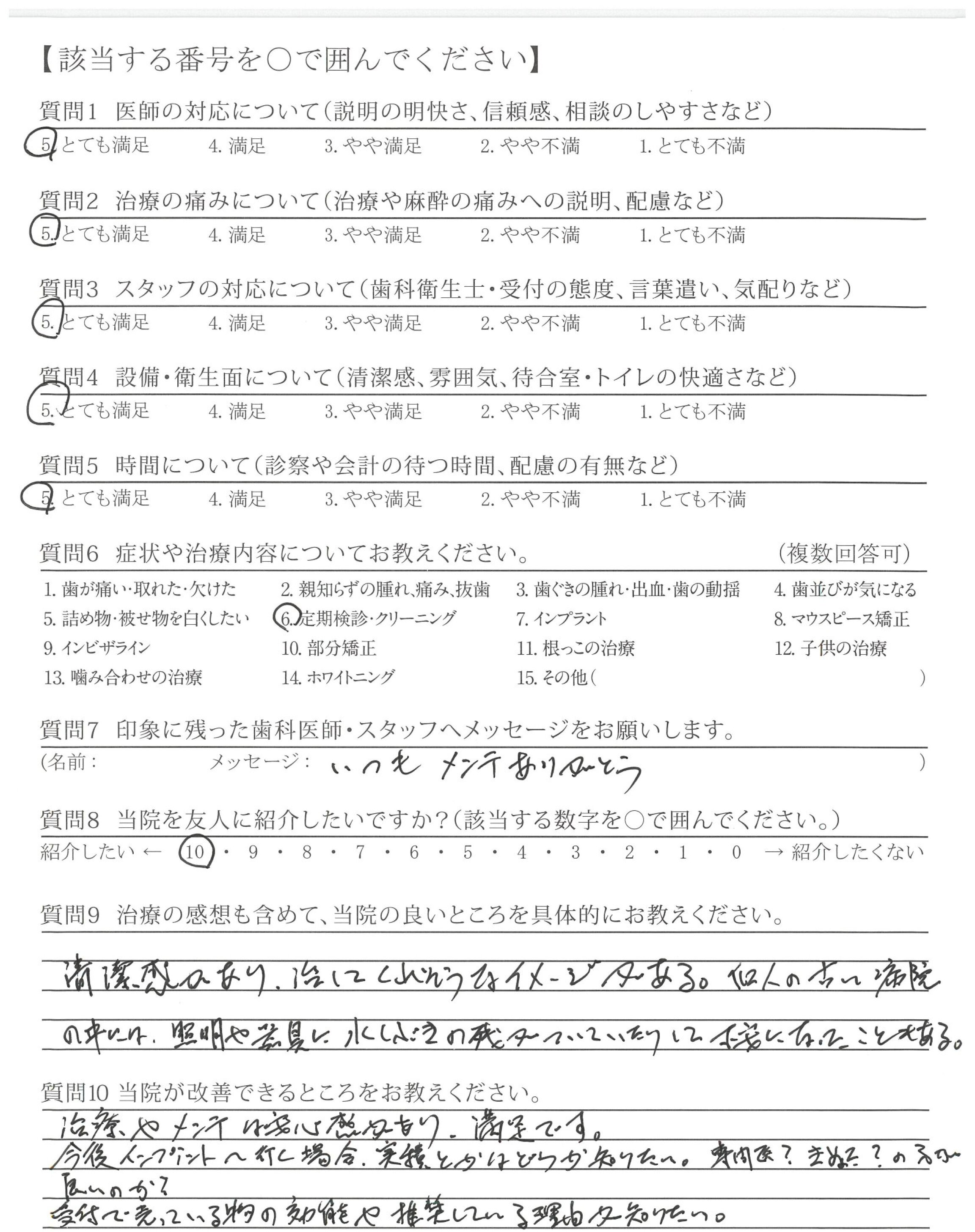 丁寧にじっくり、チェック、クリーニングして下さりありがとうございました。フッ素の提案もして下さり、終わった後、歯がツルツルして、きれいになったと実感しました