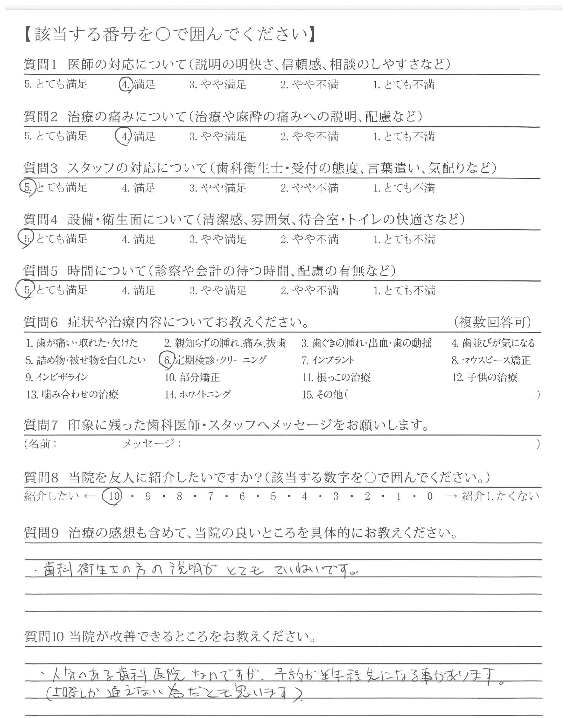 歯みがきのポイント、方法、や歯のケア全般について、クリーニング後に時間をとって説明や今後気をつける必要のあることなどがあれば、聞きたい。