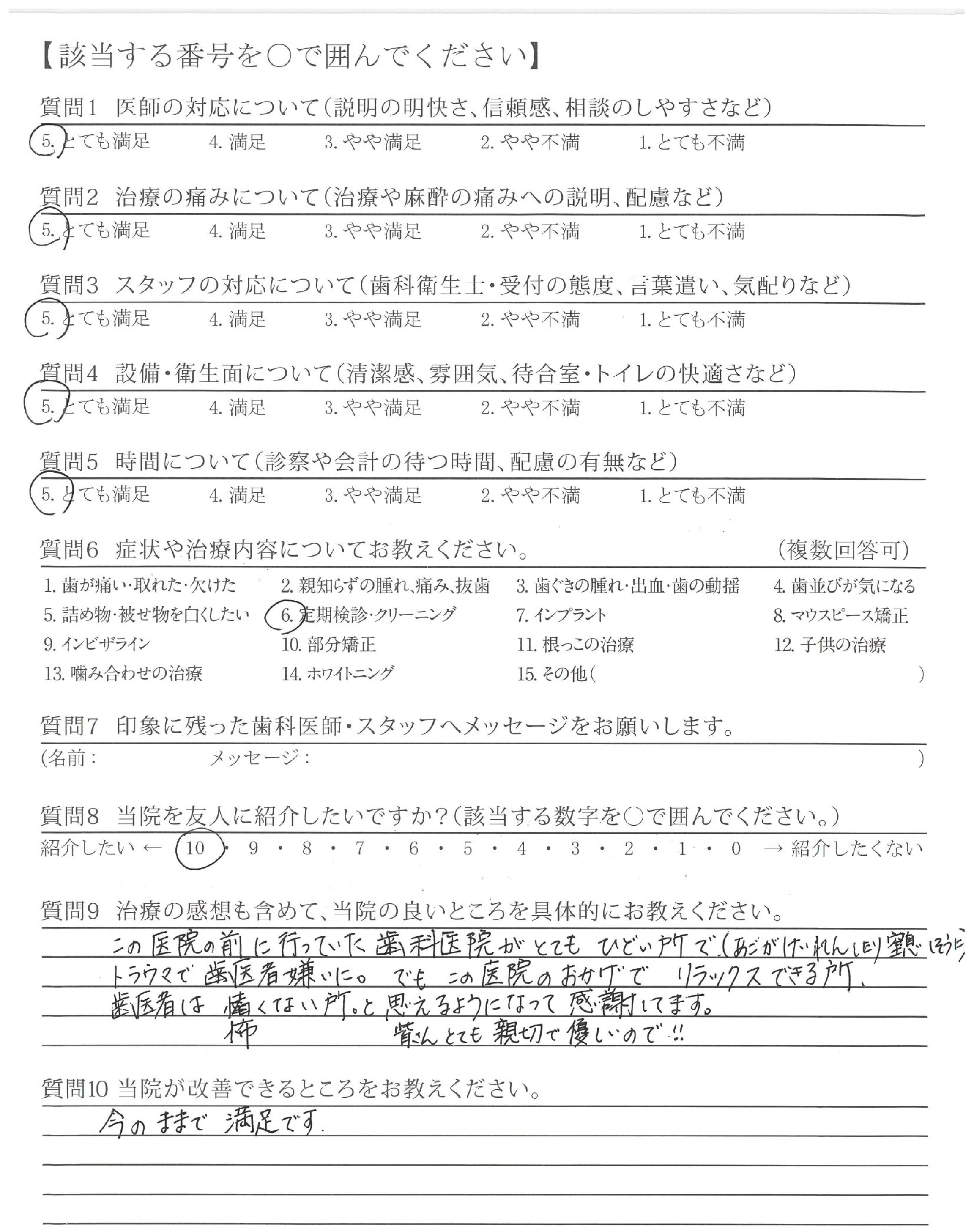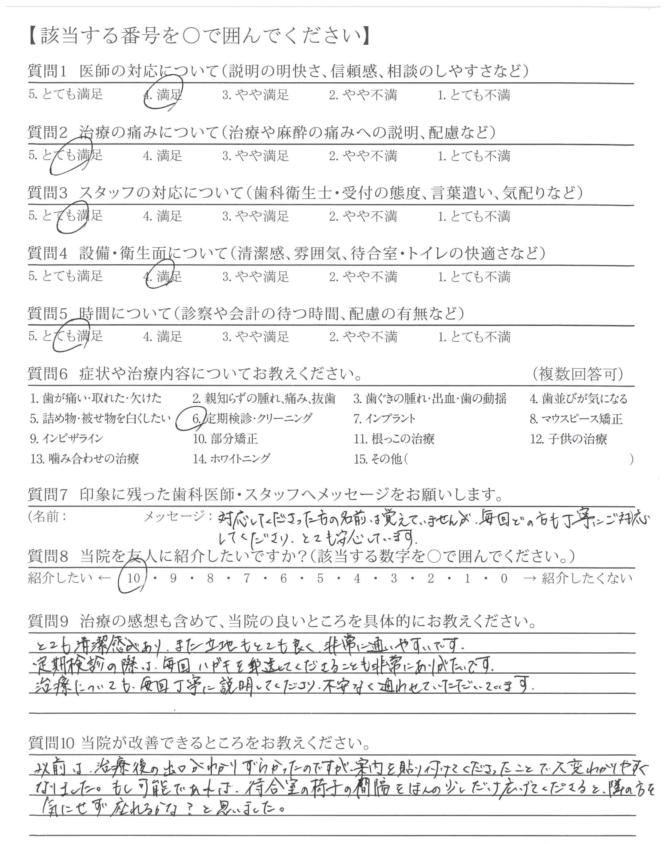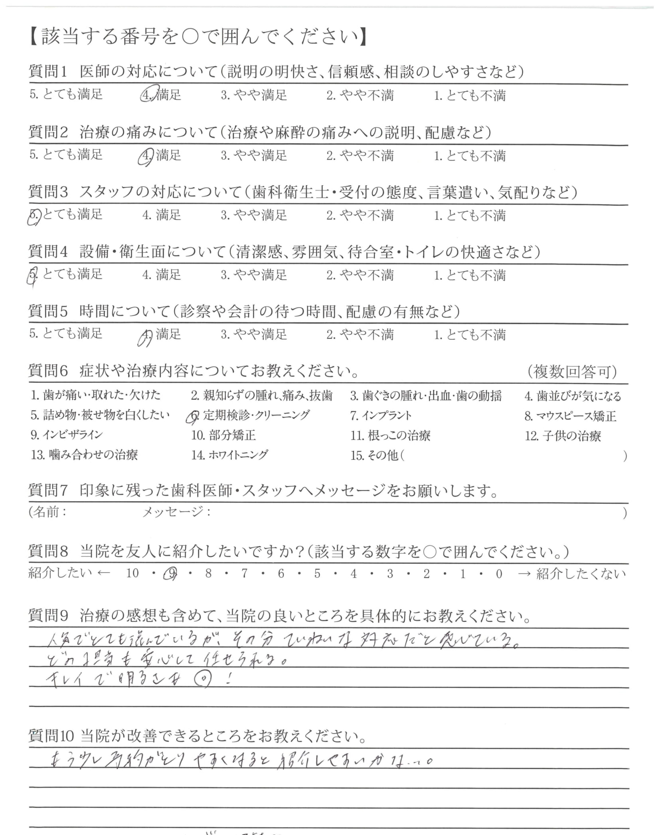 以前は横浜駅の大きな歯科に30年以上通っていたが、根の治療をしても数年たつと外からはわからないが、中が膿んでいることが何度もあり繰り返すうちに歯を失う様になった。そして医師の治療提案に唖然としてそこを去った。それから比べると今の歯科は天と地との差。こんなに違うものかと思い、感謝するばかりです。