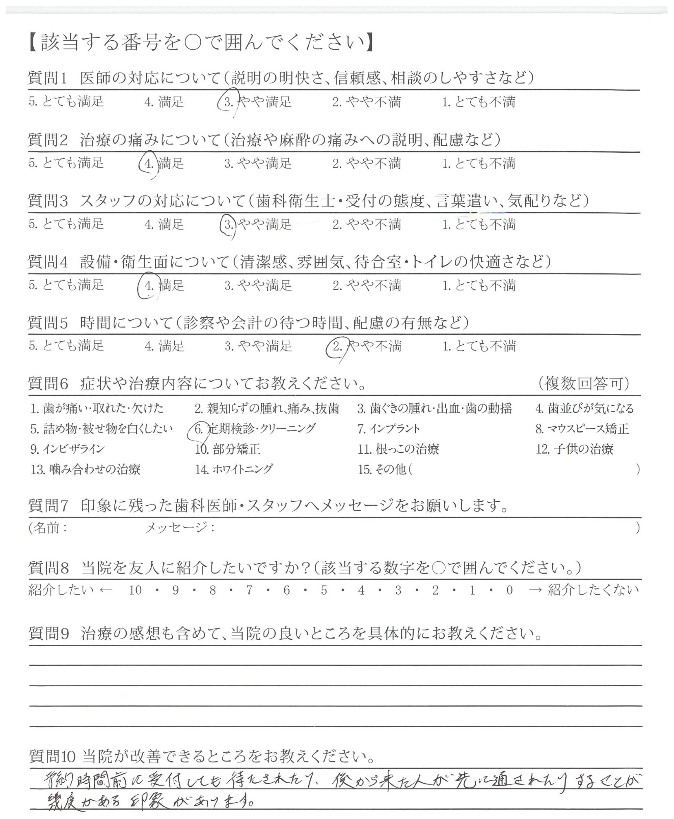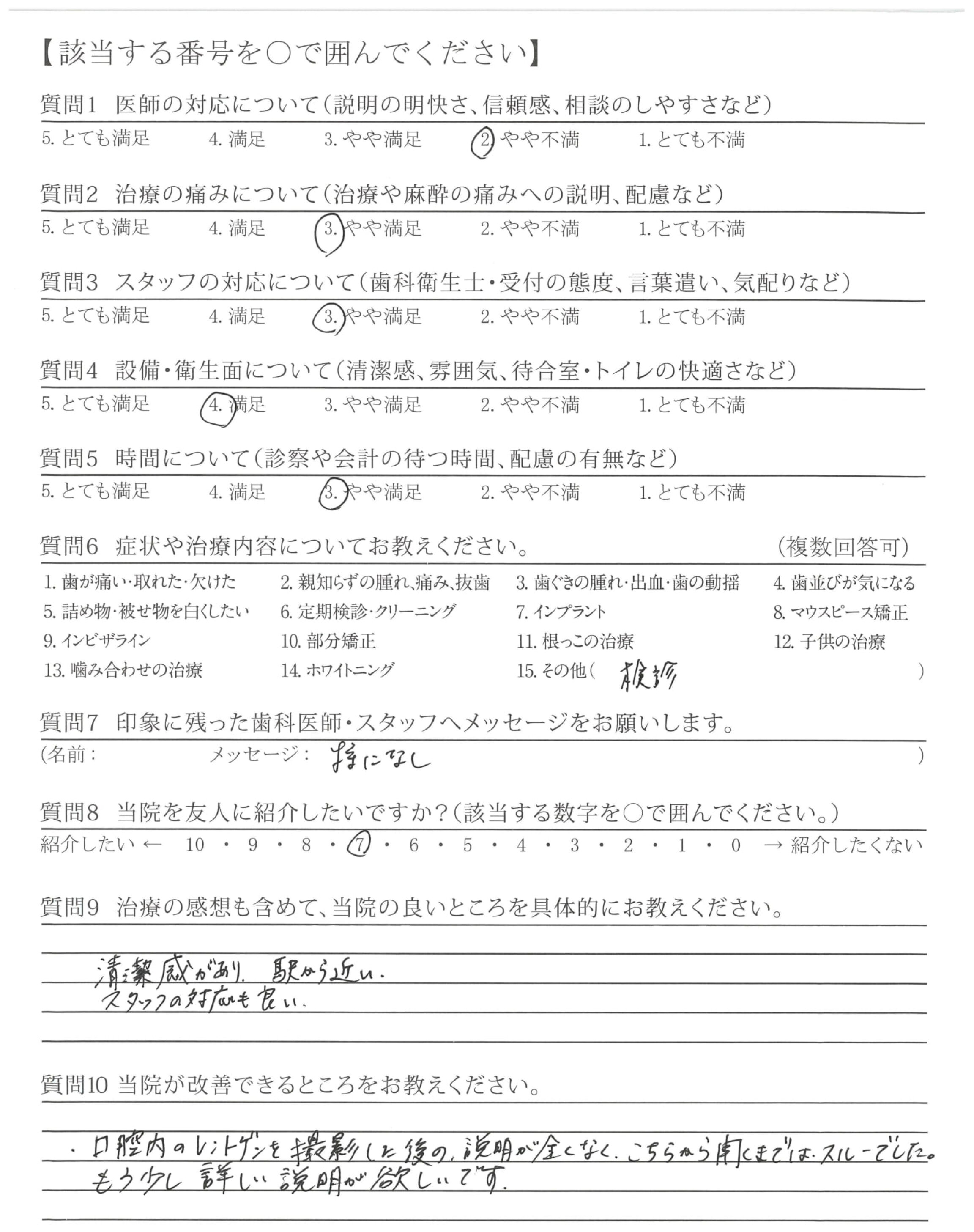 ・口腔内のレントゲンを撮影した後の、説明が全くなく、こちらから聞くまではスルーでした。もう少し詳しい説明が欲しいです。