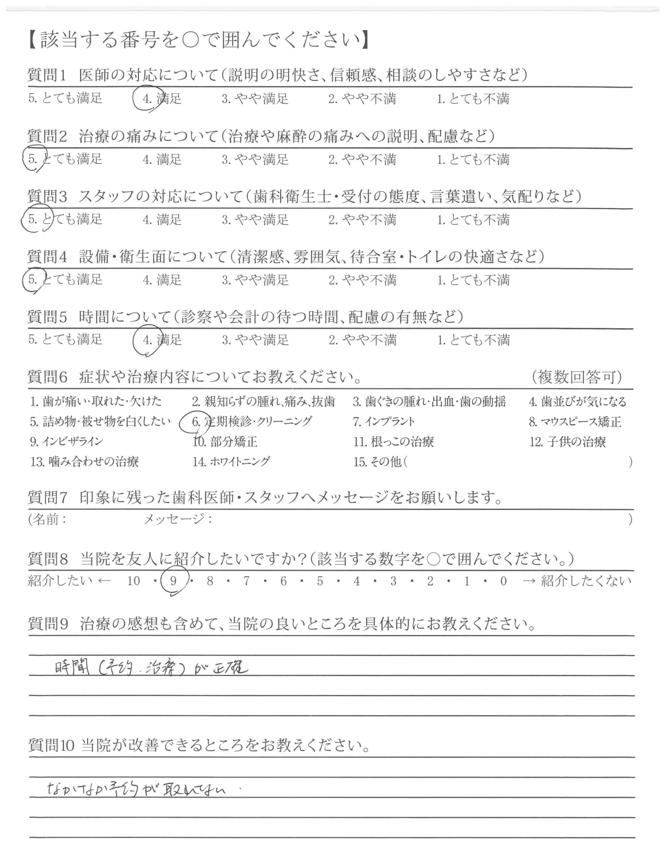 土曜日の予約がとりにづらく、検診が6ヶ月先になってしまったことがやや残念です。それ以外で気になる点はありません。