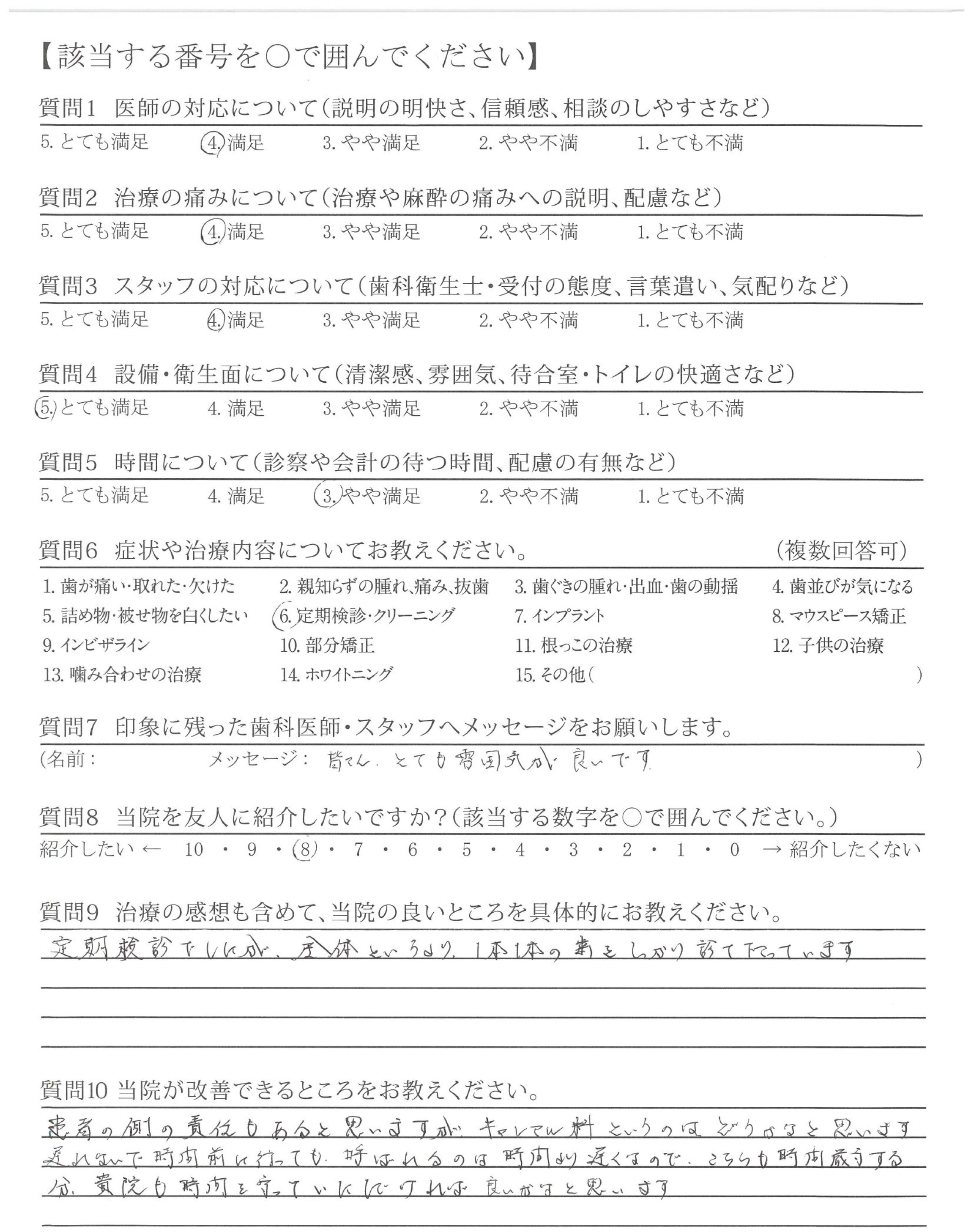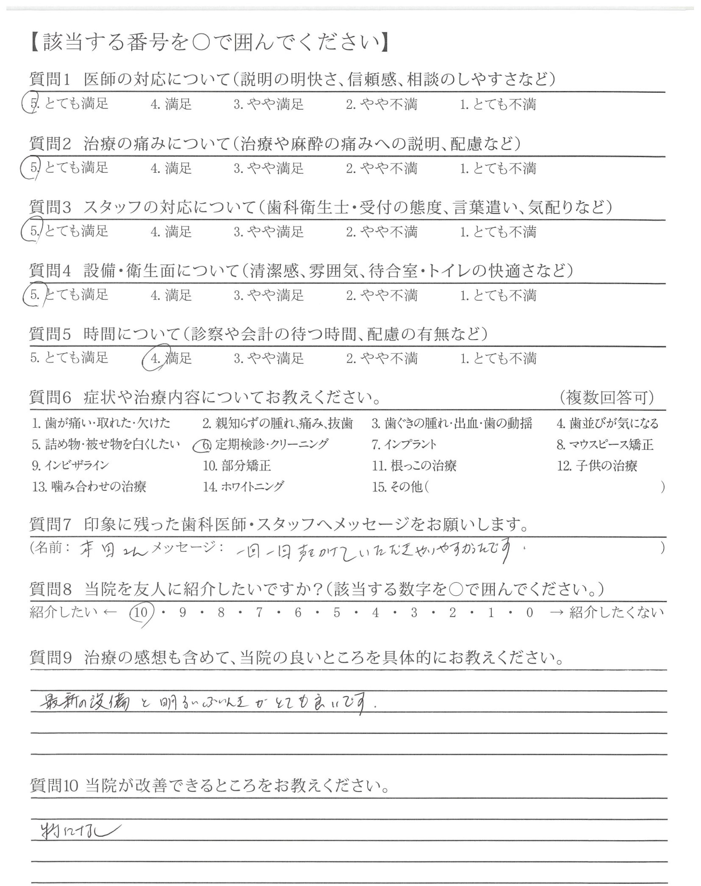 小林さん?(歯科衛生士)いつも丁寧に説明、ブラッシングの指導をしてくださり、感謝しております。そして、歯をすっきりきれいにしていただけるのありがたいです。