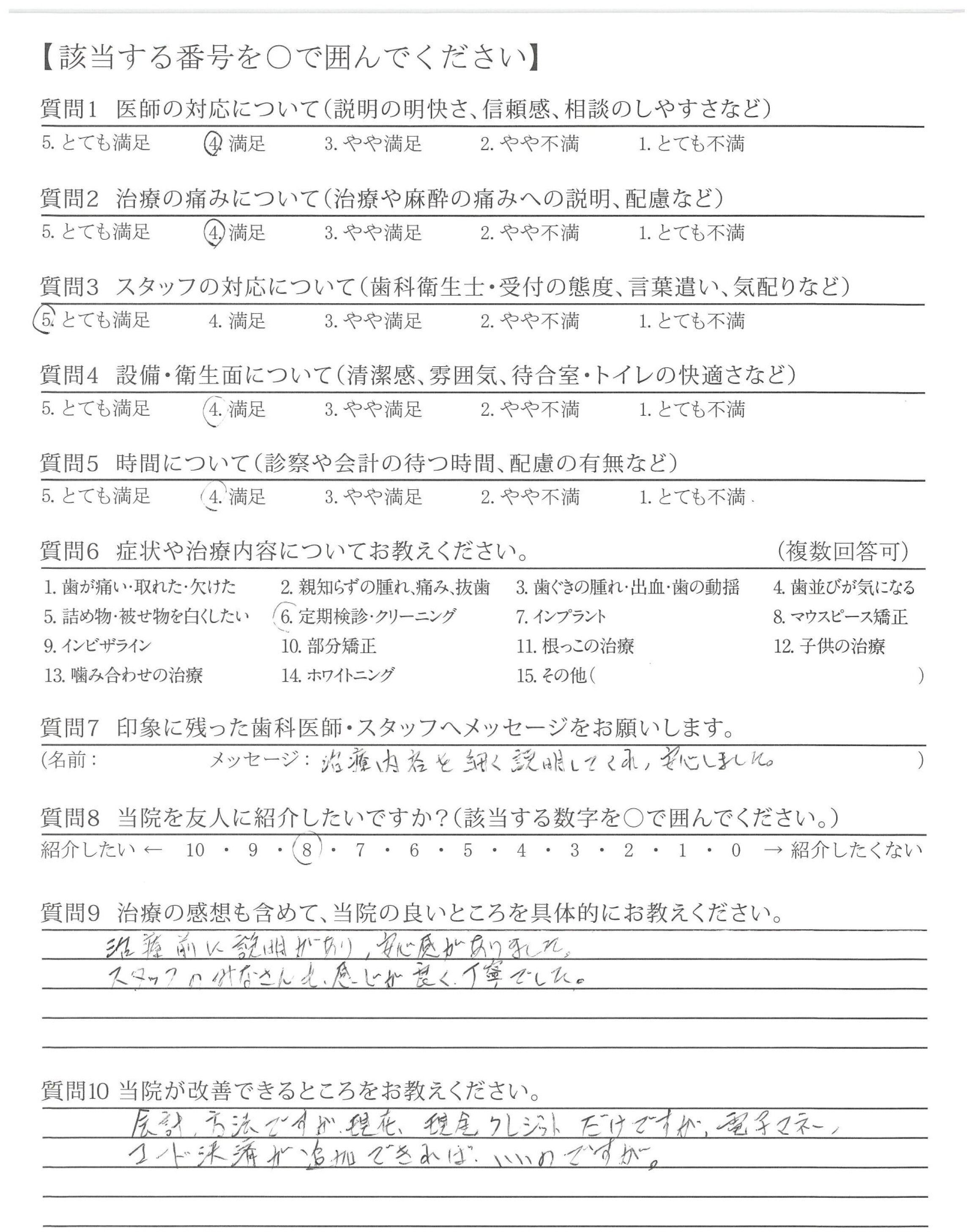 エクストリューションや、以前のつめた部分をジルコニアに変える治療を以前行ったが、その際もとても丁ねいに説明(何度も納得いくまで)して頂き、満足している。