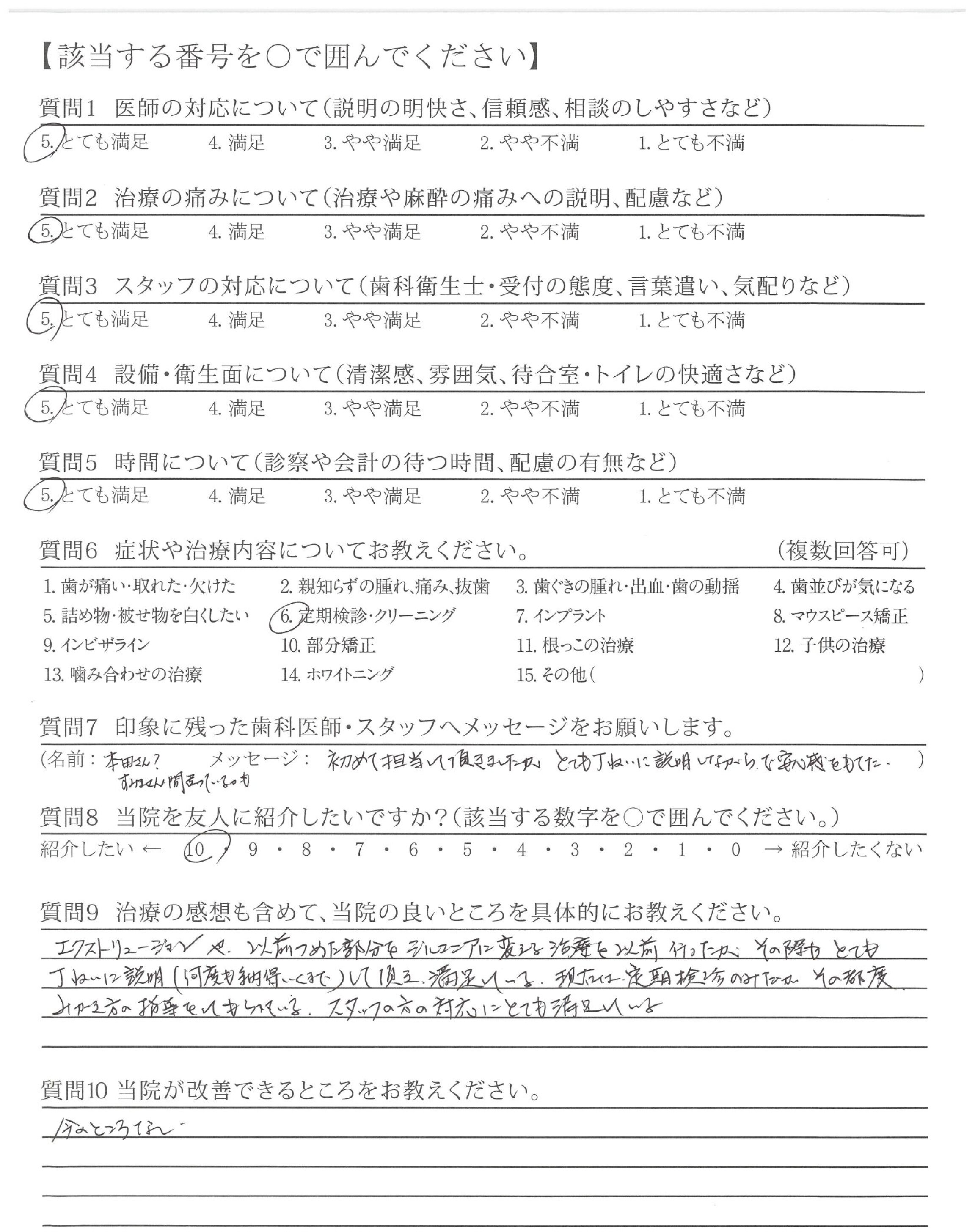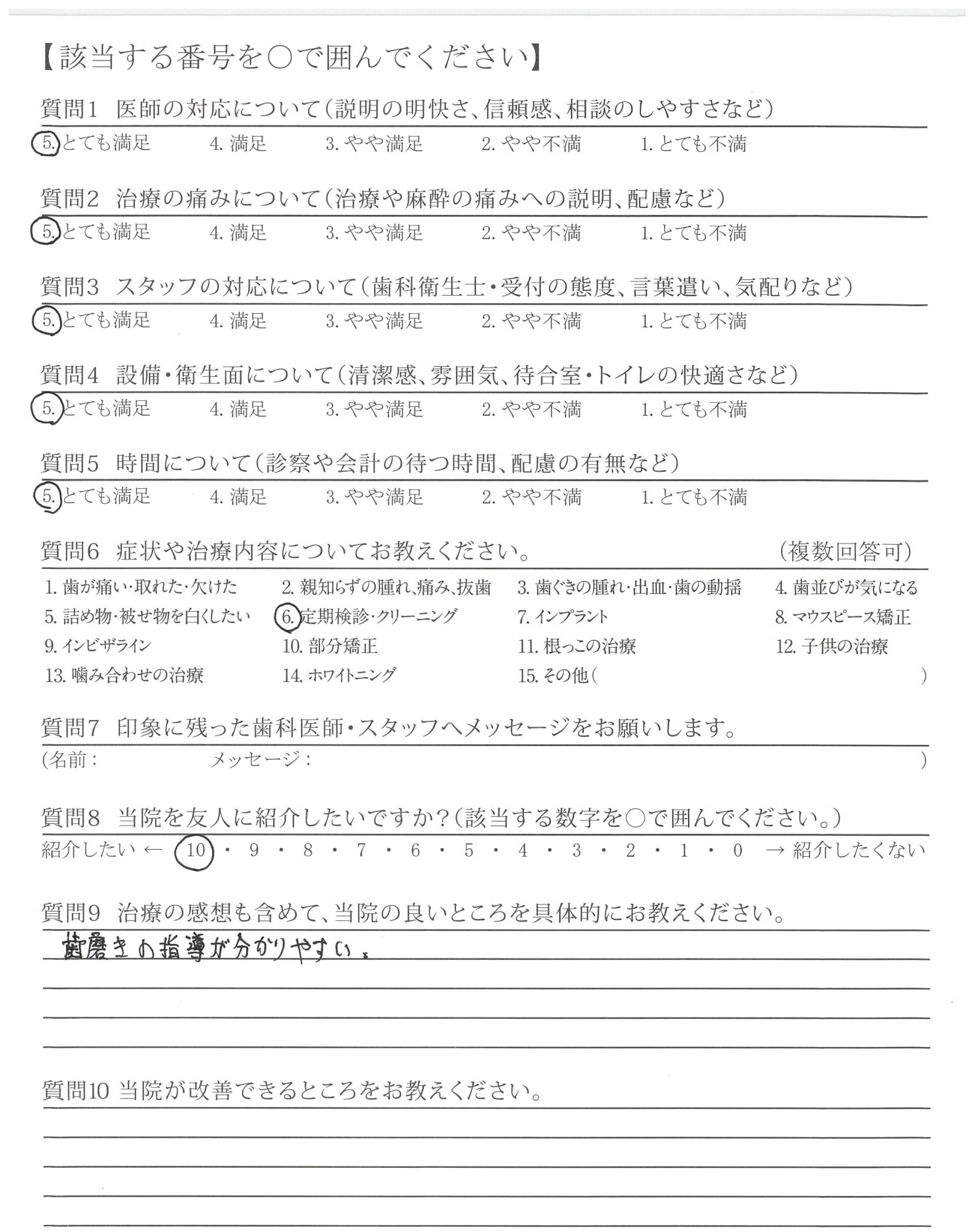 定期検診で毎日の歯みがき、お手入れの方法で、歯周病の予防ができて、治療をうけずに経過している。3ヶ月に一度の1時間の定期検診のおかげだと思っています。