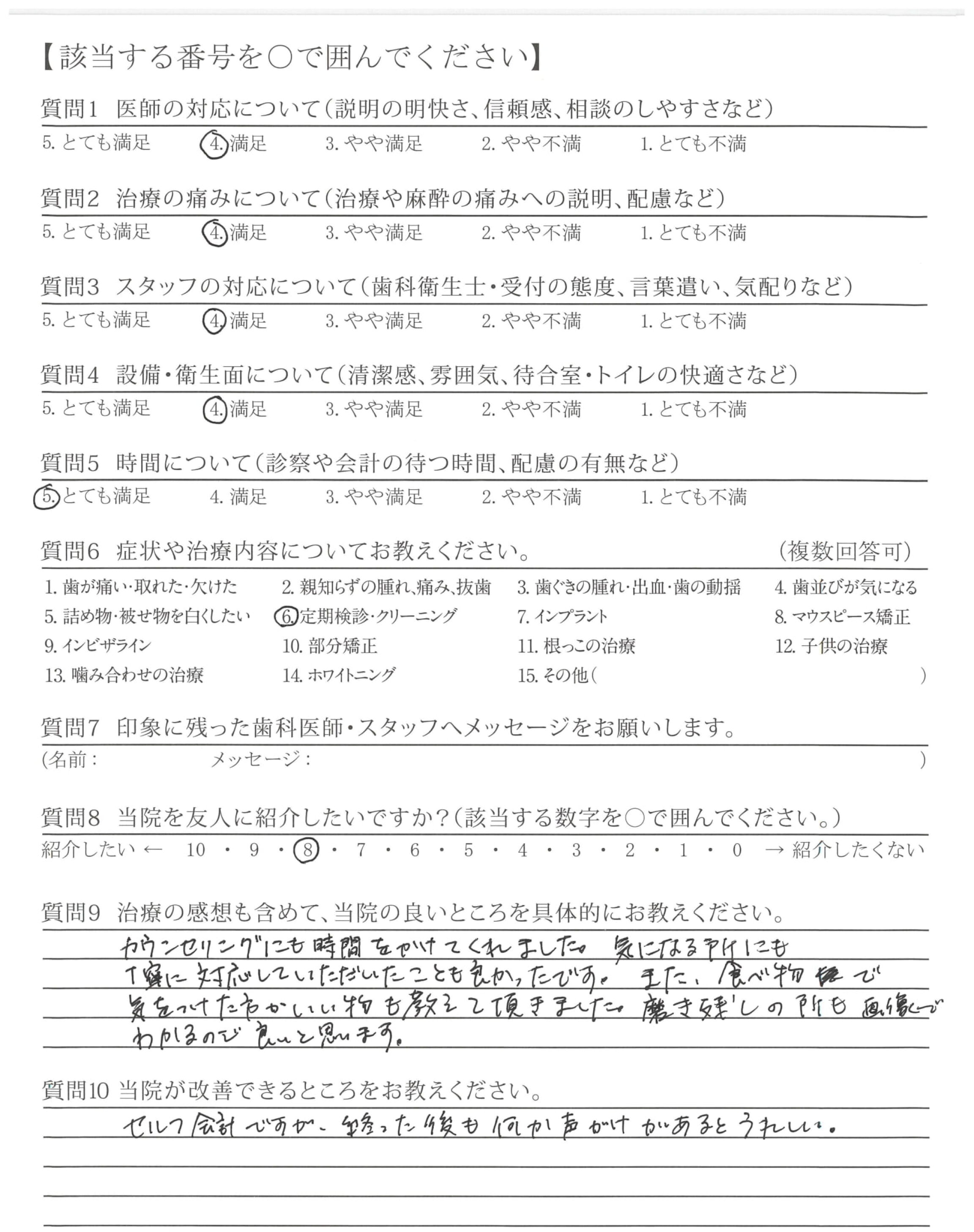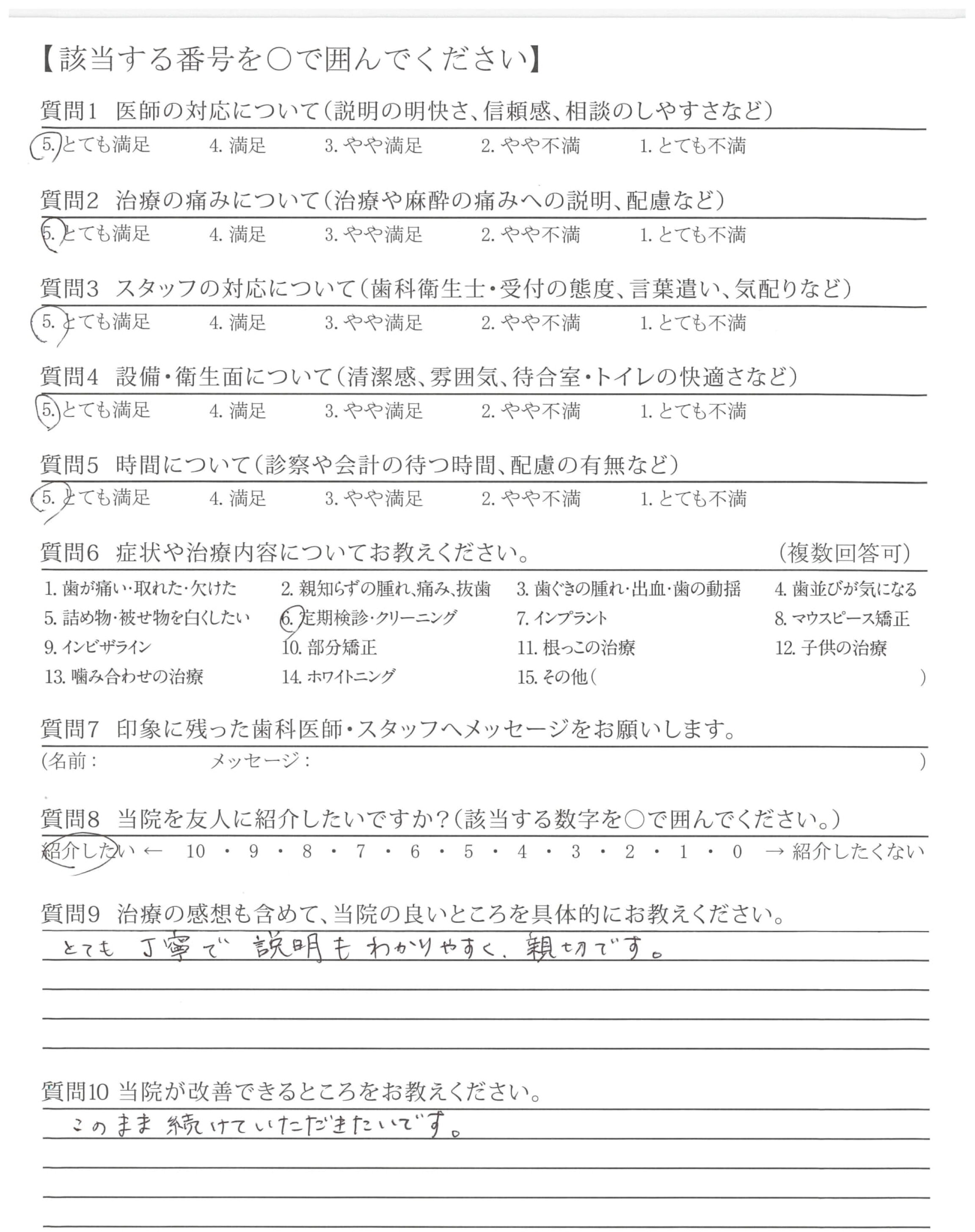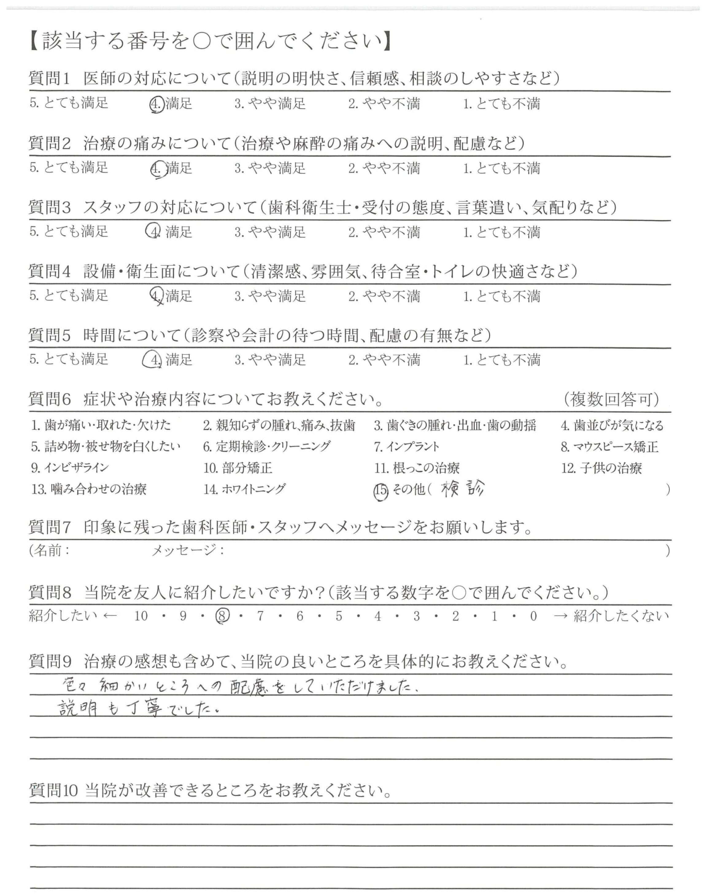 定期検診での説明、対処の明快さ、態度、言葉遣い、気配りが良く出来た方で安心感がありました。