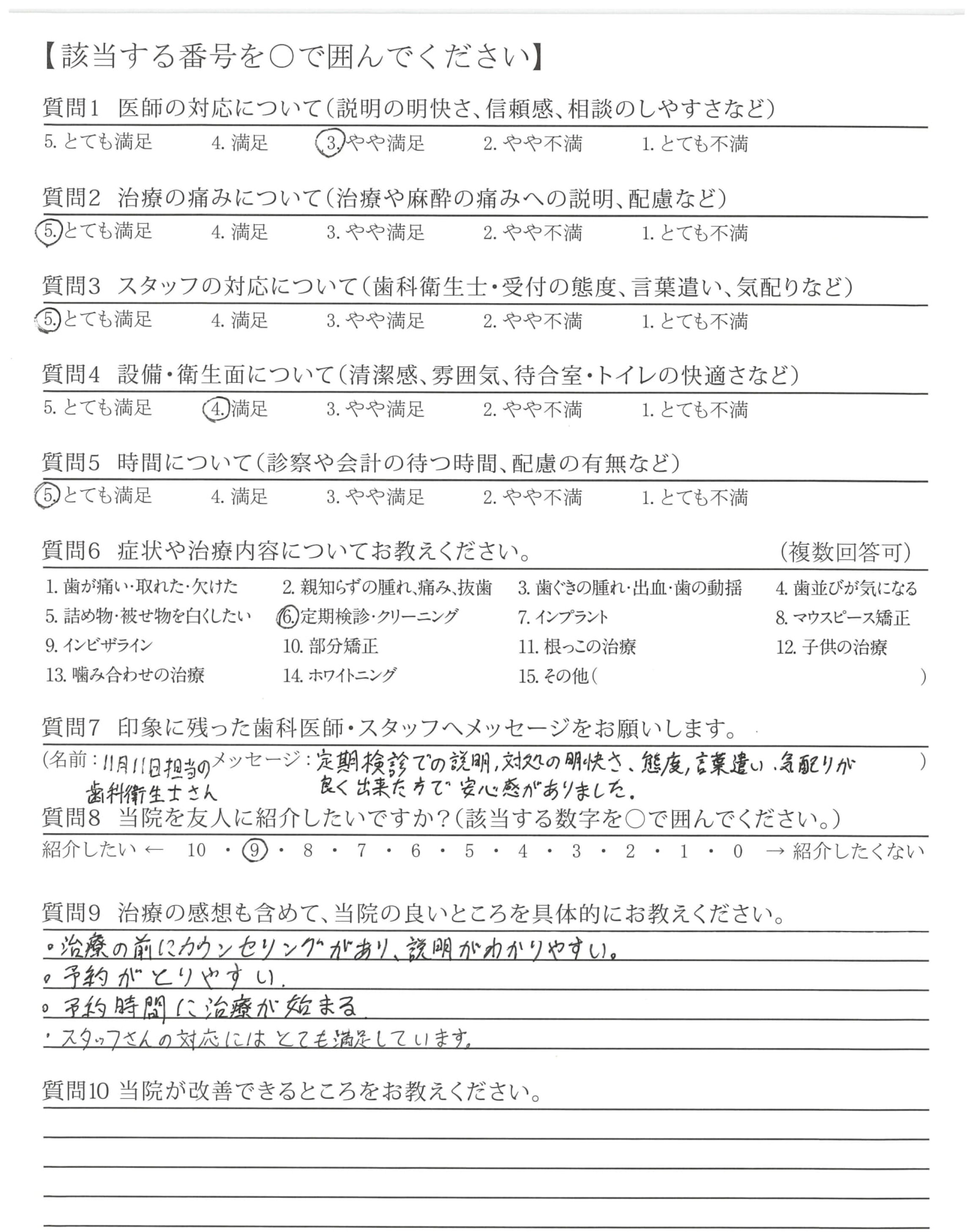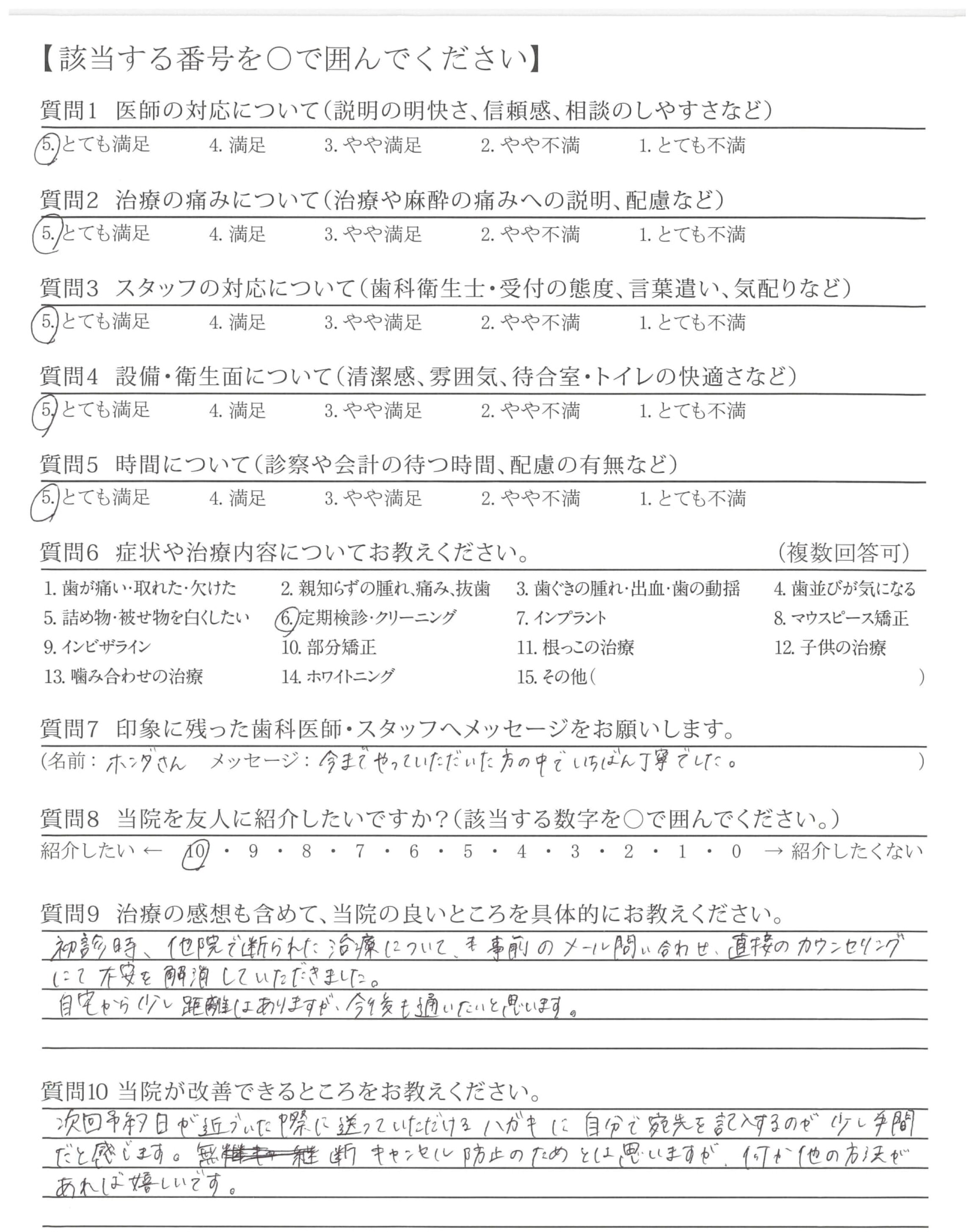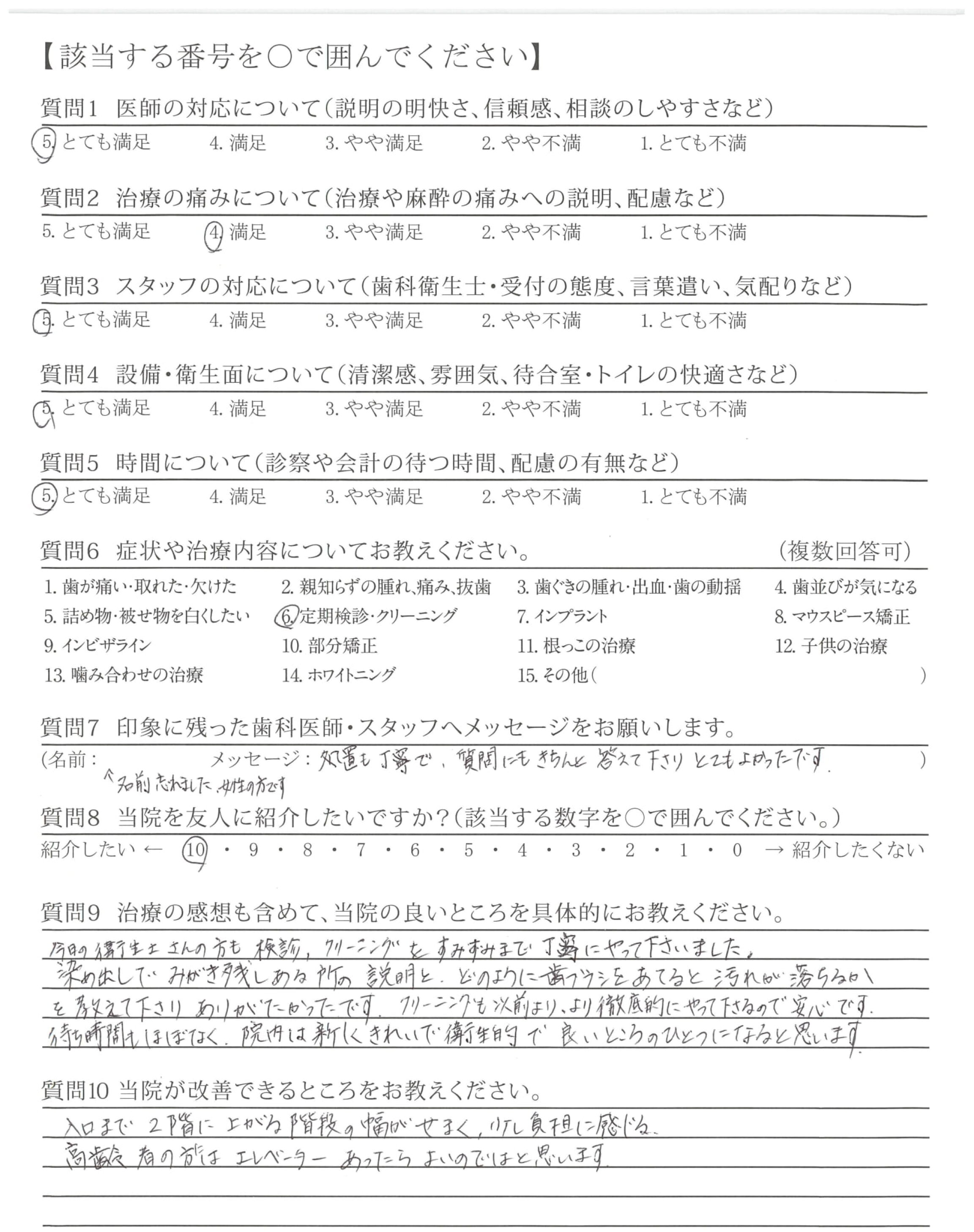 定期検診での説明、対処の明快さ、態度、言葉遣い、気配りが良く出来た方で安心感がありました。