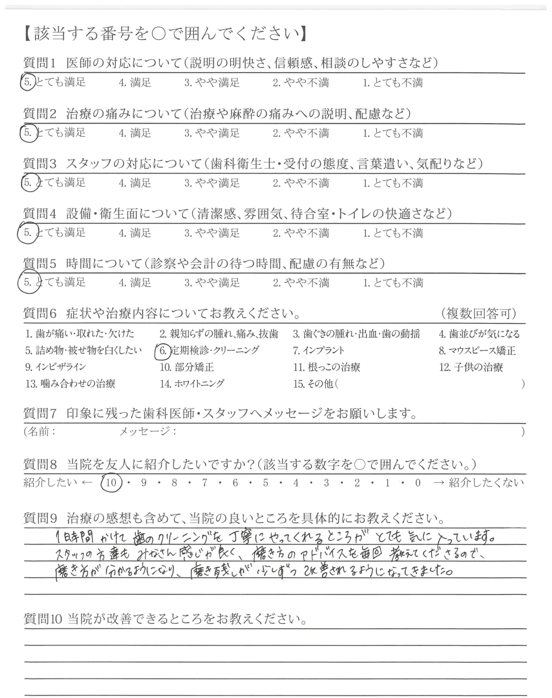 今までの歯医者さんは、クリーニングが痛すぎて麻すいを使っていましたがこちらは麻酔なしで耐えられます。衛生士さんがお上手なのがわかります。これからもよろしくお願いします。