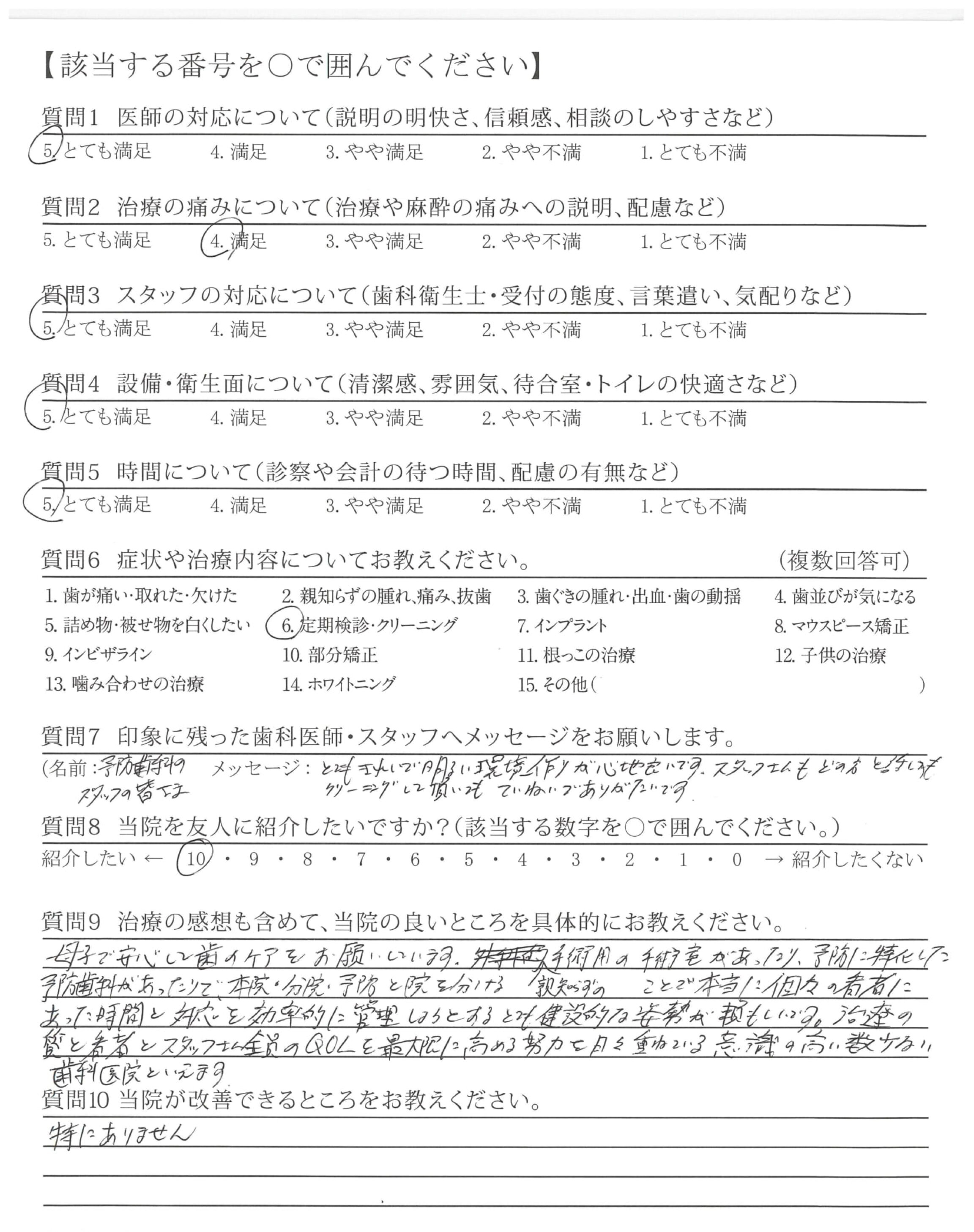 改善してほしいというのではないですが、5,6年前にいらっしゃった受付の方々が素晴らしく、印象に残っています。次男が赤ちゃんの頃、私の治療中にずっと次男を抱っこして電車を見せに行ってくれたかた。私だけはなく子ども達の名前も覚えてくださっていたかた。治療だけではなく受付のレベルが高くて驚きました。