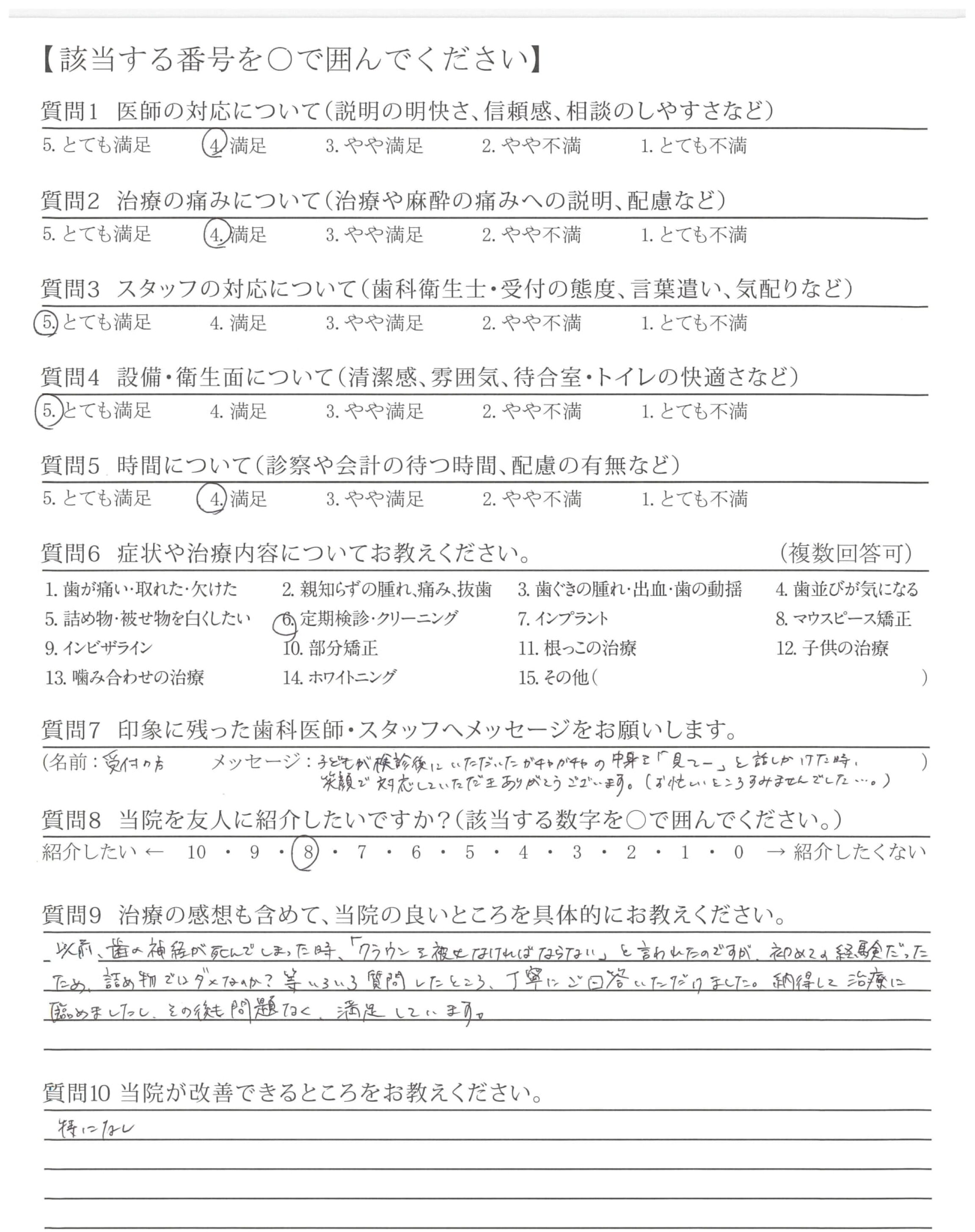 以前、歯の神経が死んでしまった時、「クラウンを被せなければならない」と言われたのですが、初めての経験だったため、詰め物ではダメなのか?等いろいろ質問したところ、丁寧にご回答いただけました。納得して治療に臨めましたし、その後も問題なく、満足しています。