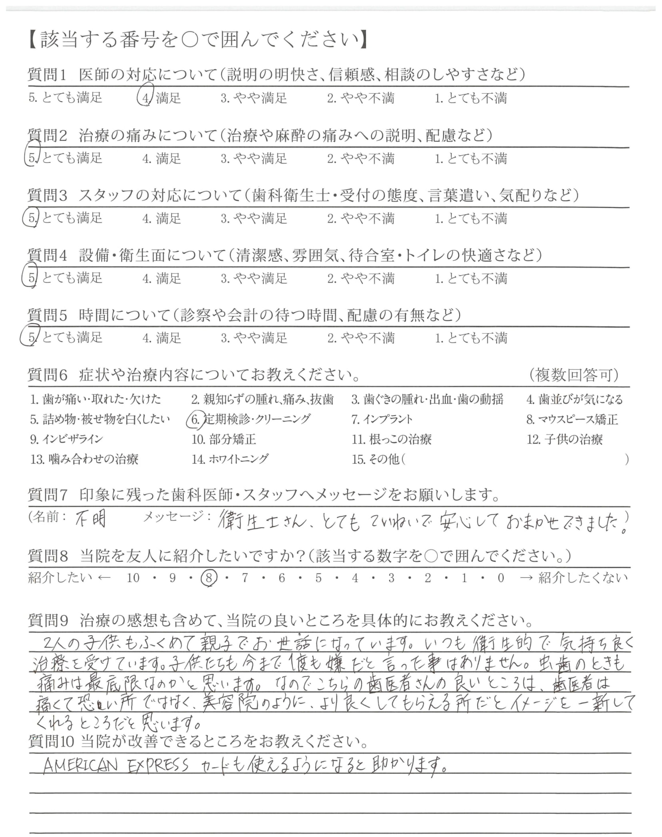 歯科衛生士の方の対応、技術が全般的に高く、安心、信頼してまかせられる。