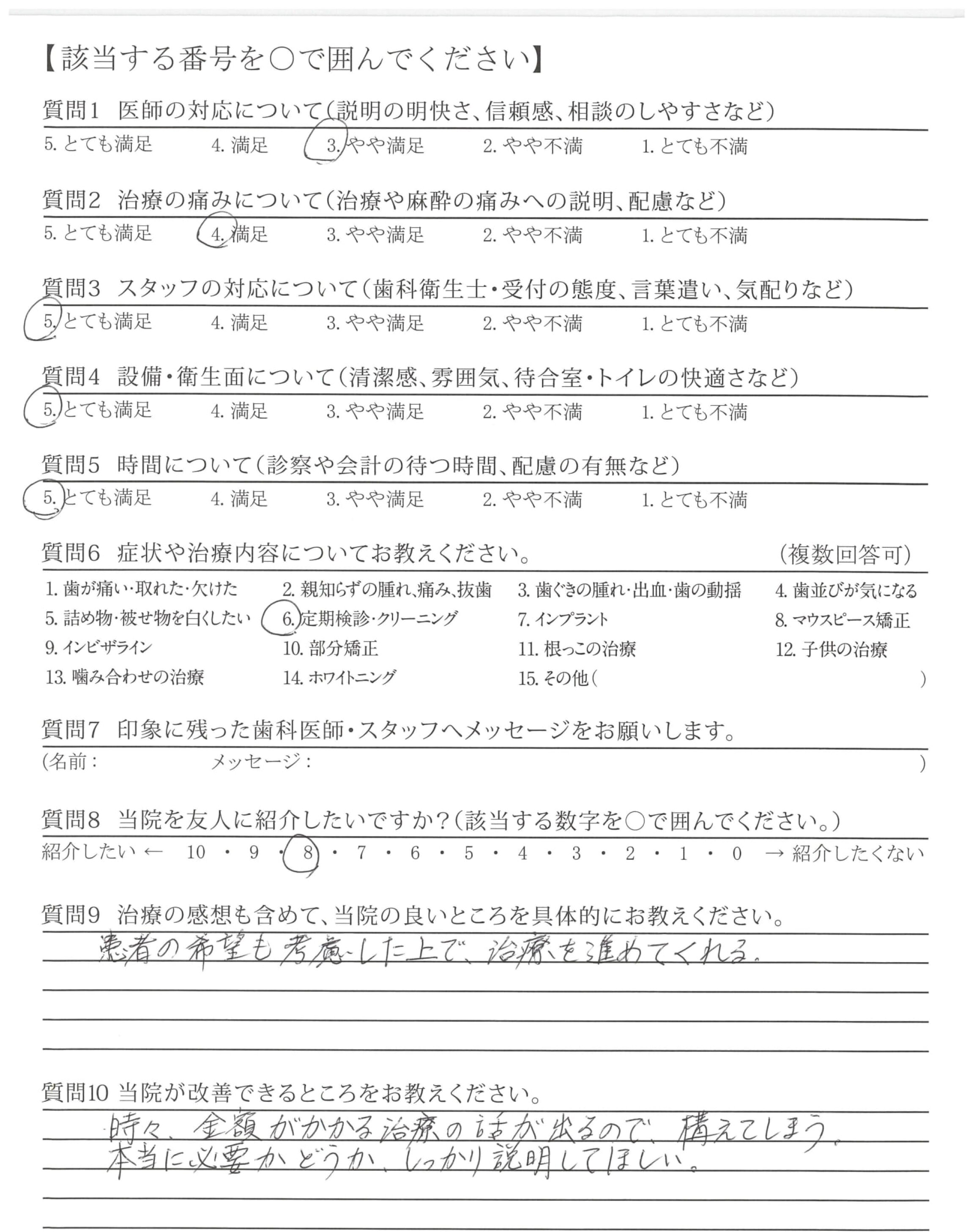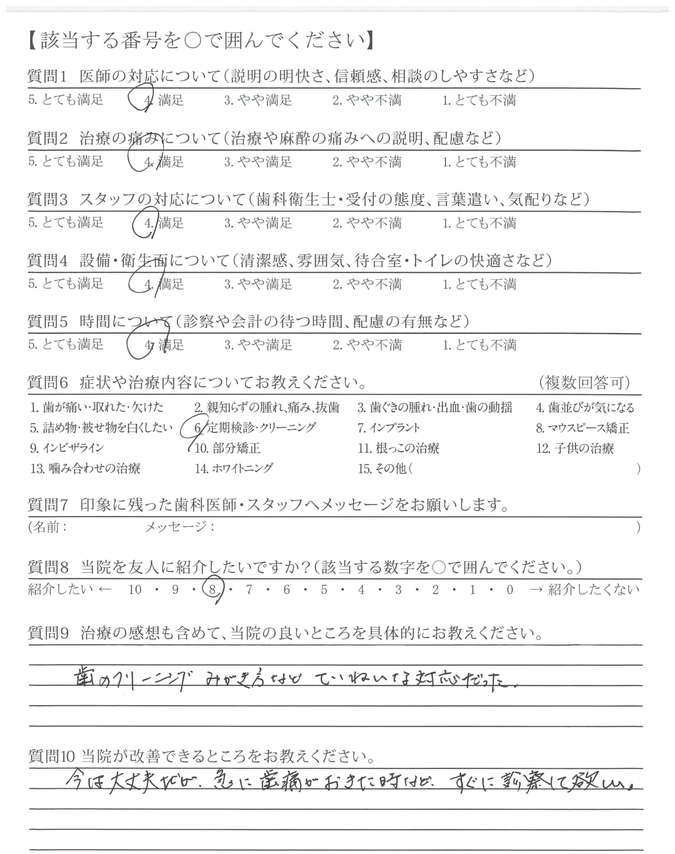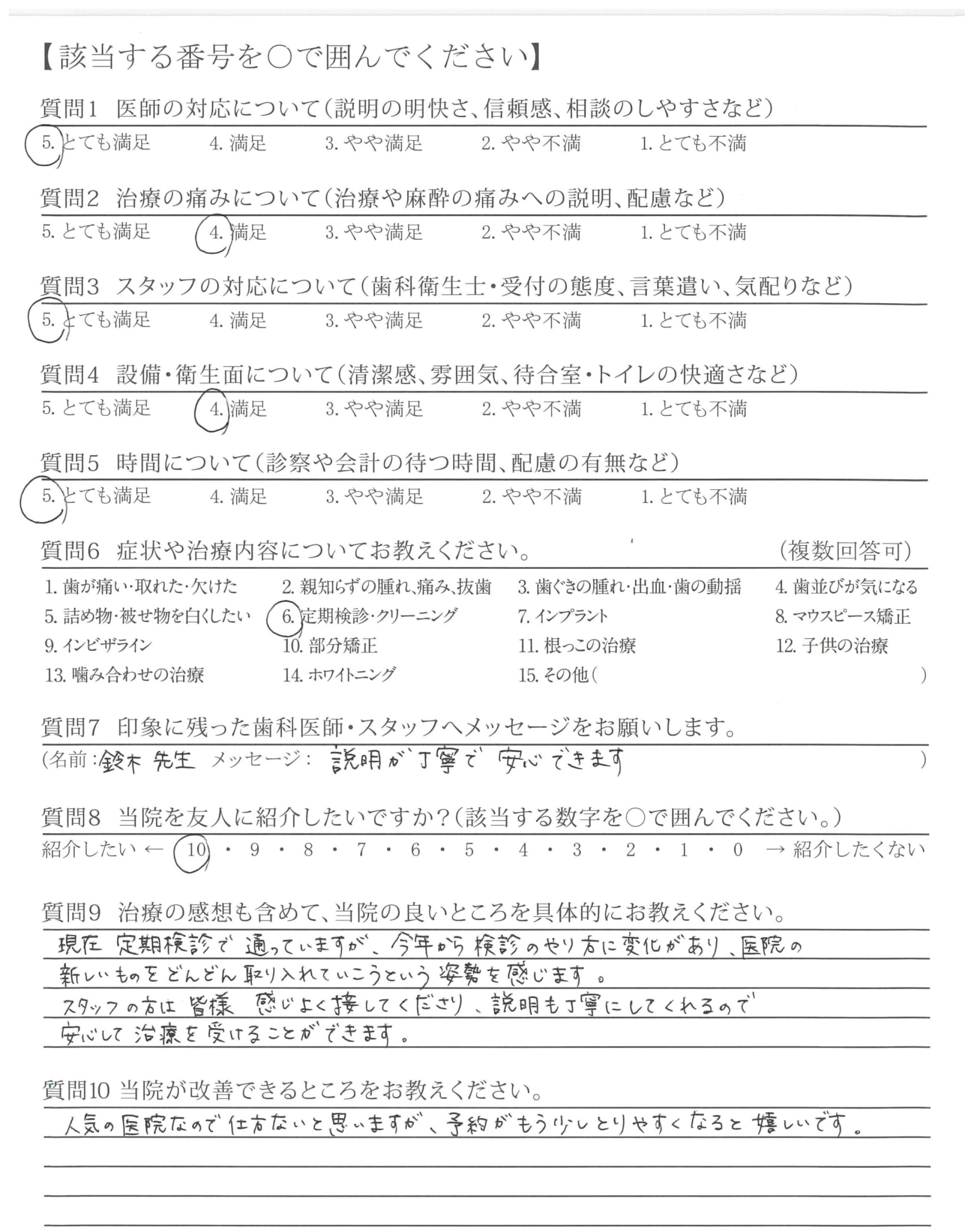 根っこの手術後痛みをこちらが訴えた際もしっかりこちらの言い分を聞いてくださりおかげで今はだいぶ良くなり、別の病院では抜歯しかないと言われていた歯(歯根を無事残すことができたことが本当に嬉しくありがたかったです。また3ヵ月おきの定期検診のクオリティが高く検診後にいただける検診結果が大変日々の歯のケアをする際の参考になっております。