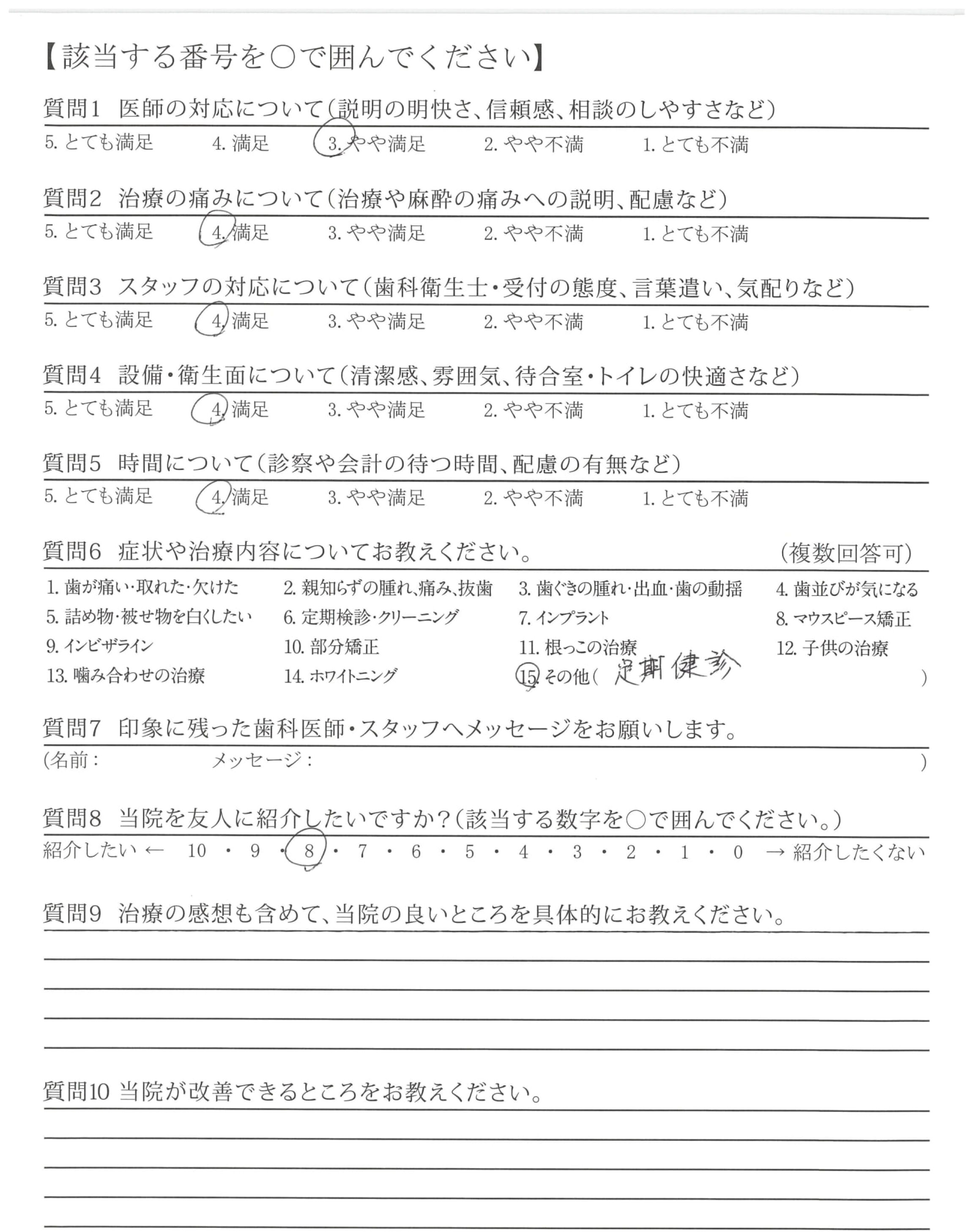 他院で不可だった根管治療の処置を手がけて下さり、技術力がすばらしいと思いました。