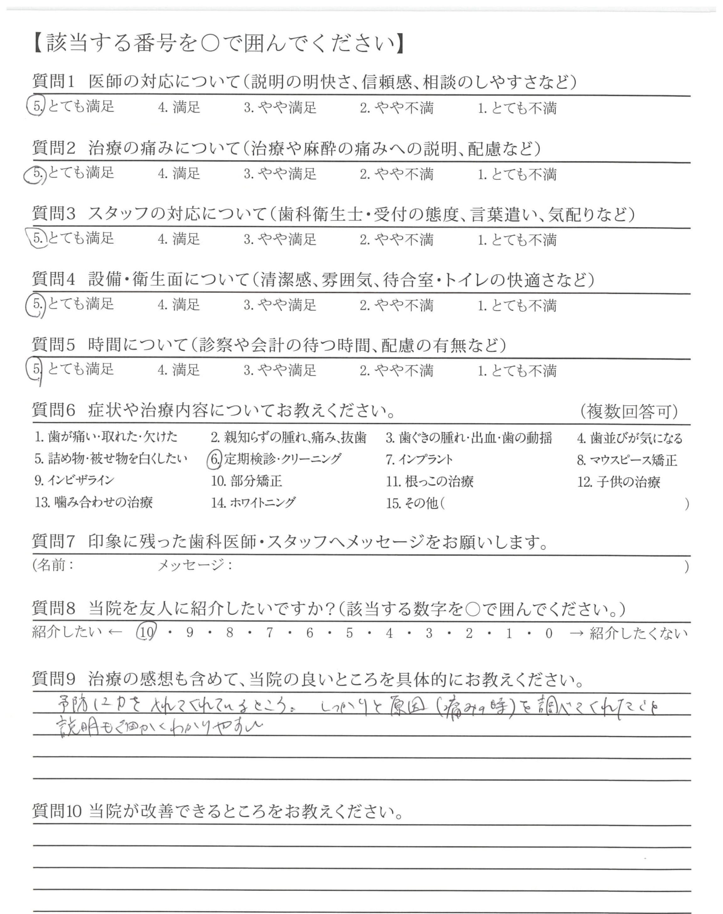 丁寧な説明、みがきのこしの説明があり、ほめて頂けたのがよかった(ホットした)