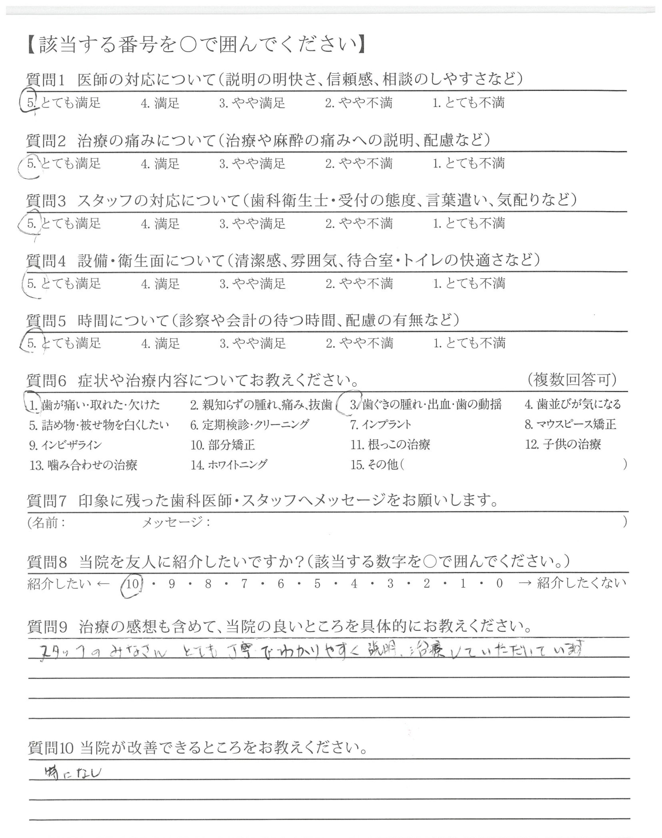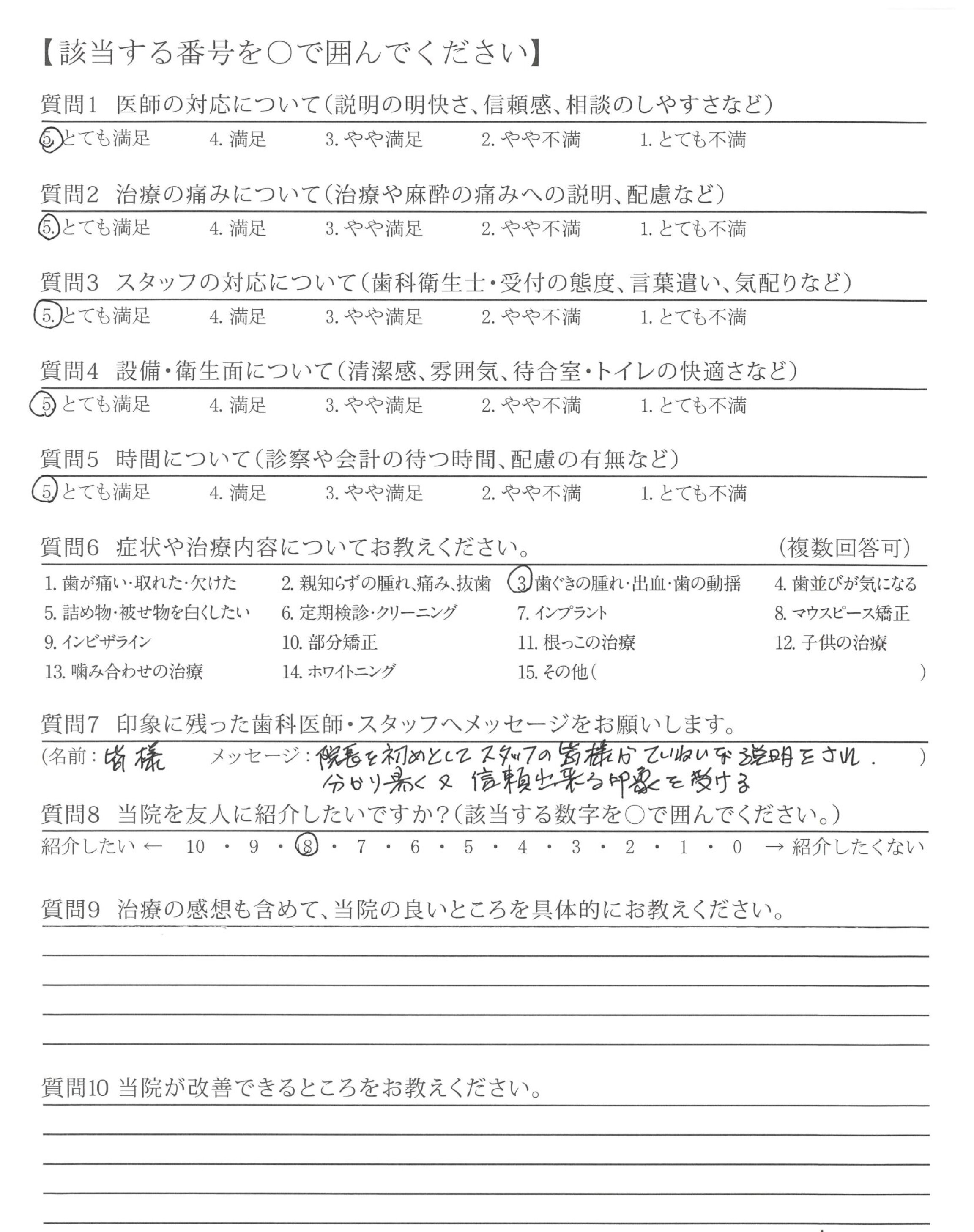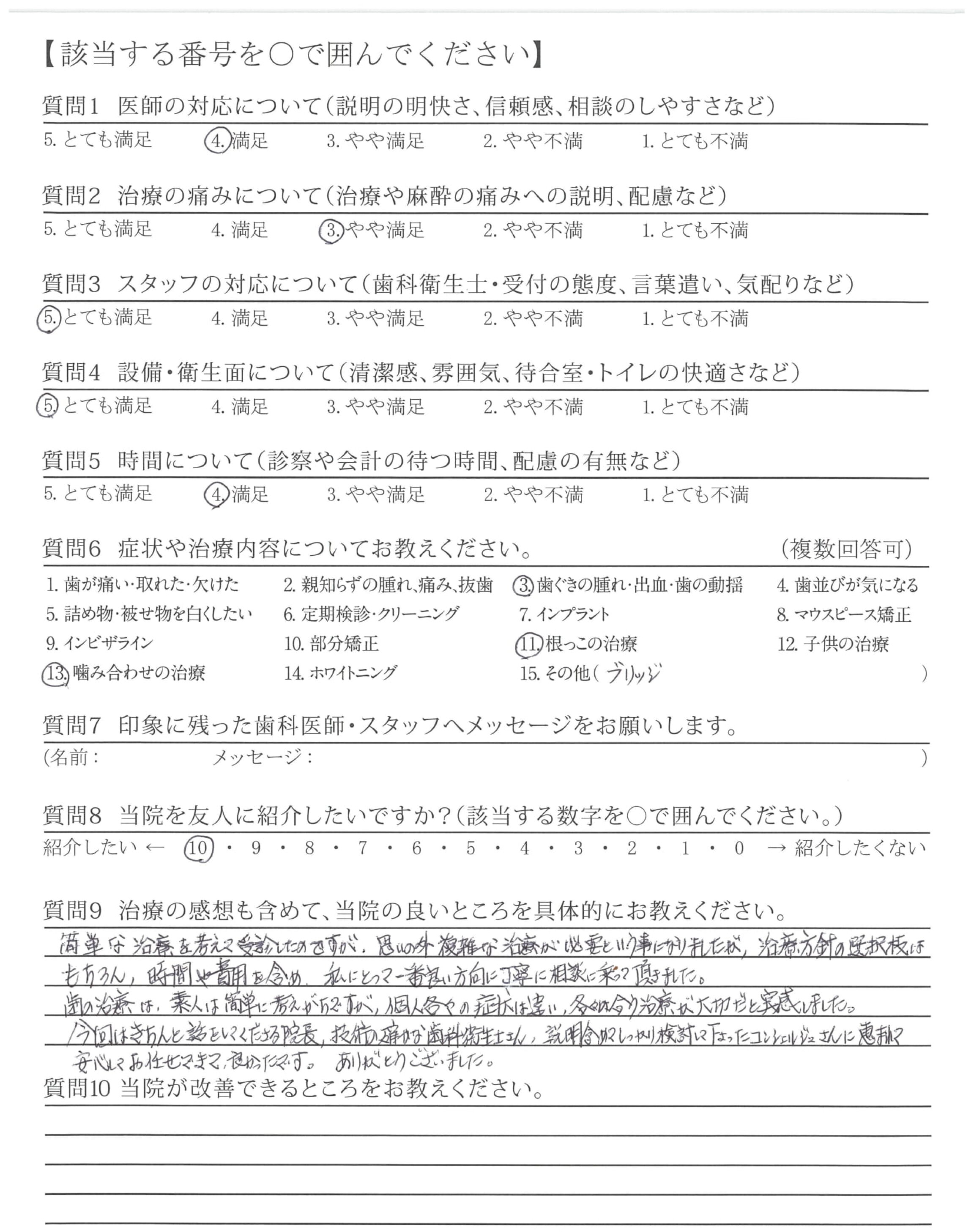 歯の治療は、素人は簡単に考えがちですが、個人各々の症状は違い、各々に合う治療が大切だと実感しました。