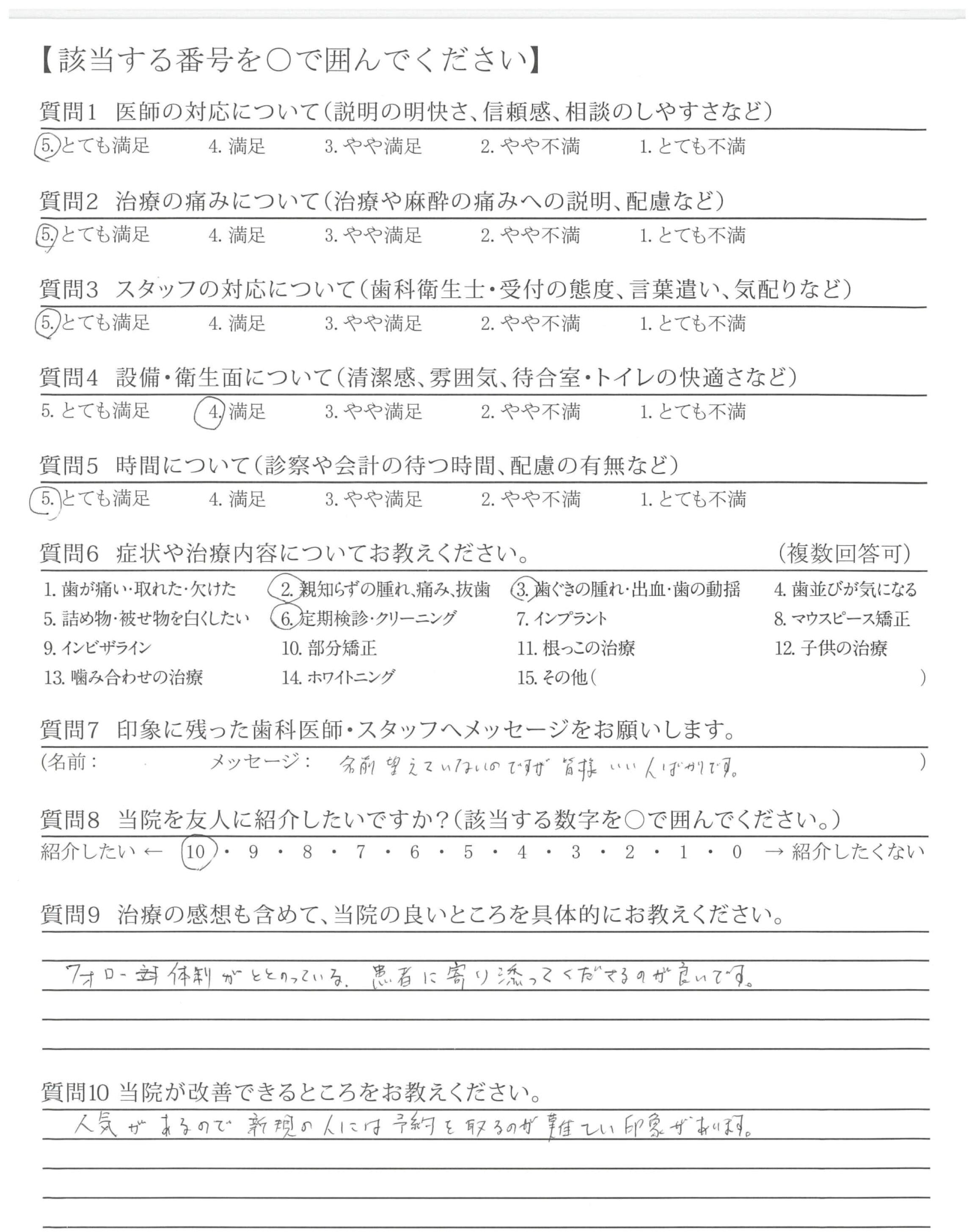 今回はきちんと話を聞いてくださる院長、技術の確かな歯科衛生士さん、説明含めてしっかり検討して下さったコンシェルジュさんに恵まれて安心してお任せできて、良かったです。ありがとうございました。