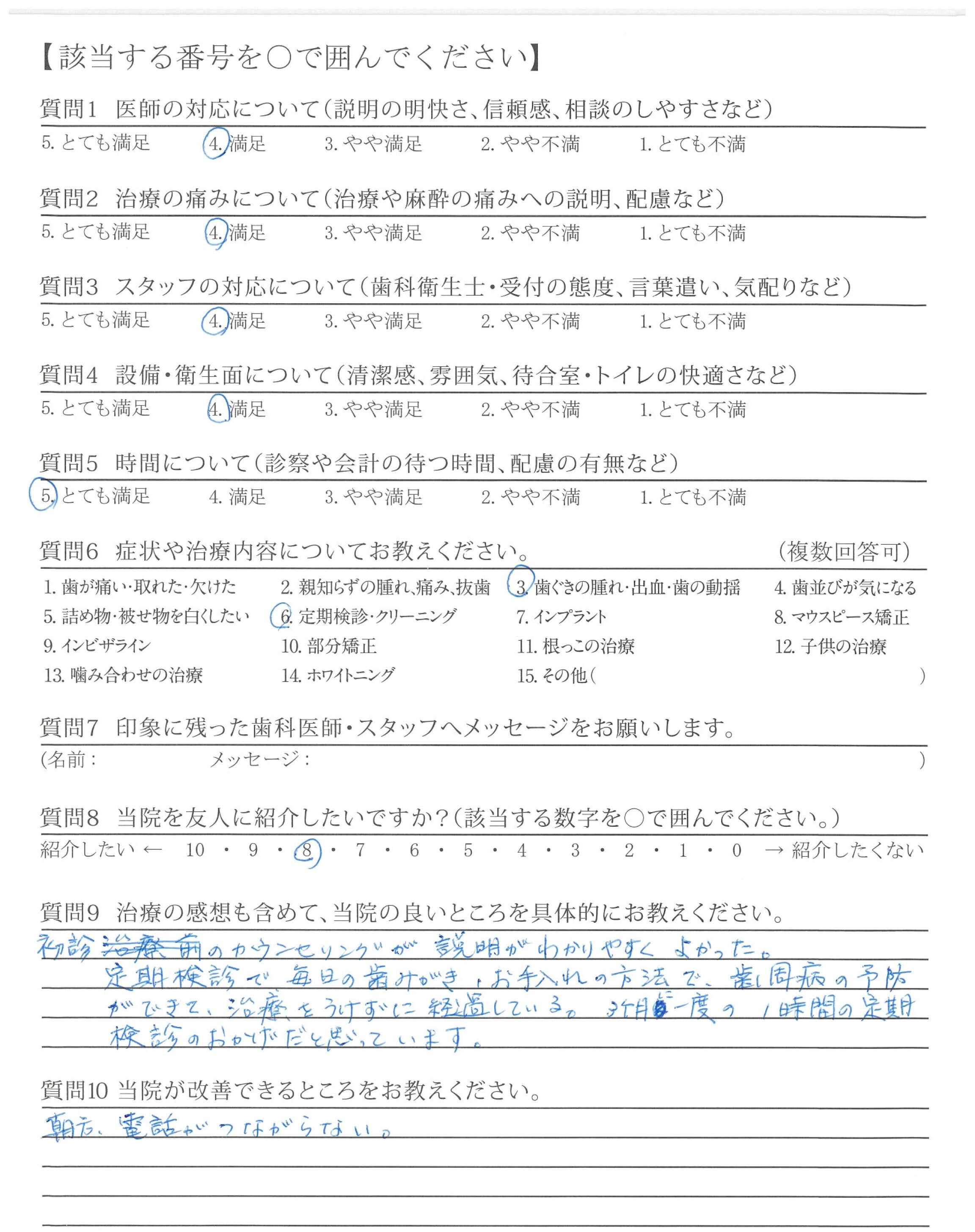 定期検診で毎日の歯みがき、お手入れの方法で、歯周病の予防ができて、治療をうけずに経過している。3ヶ月に一度の1時間の定期検診のおかげだと思っています。