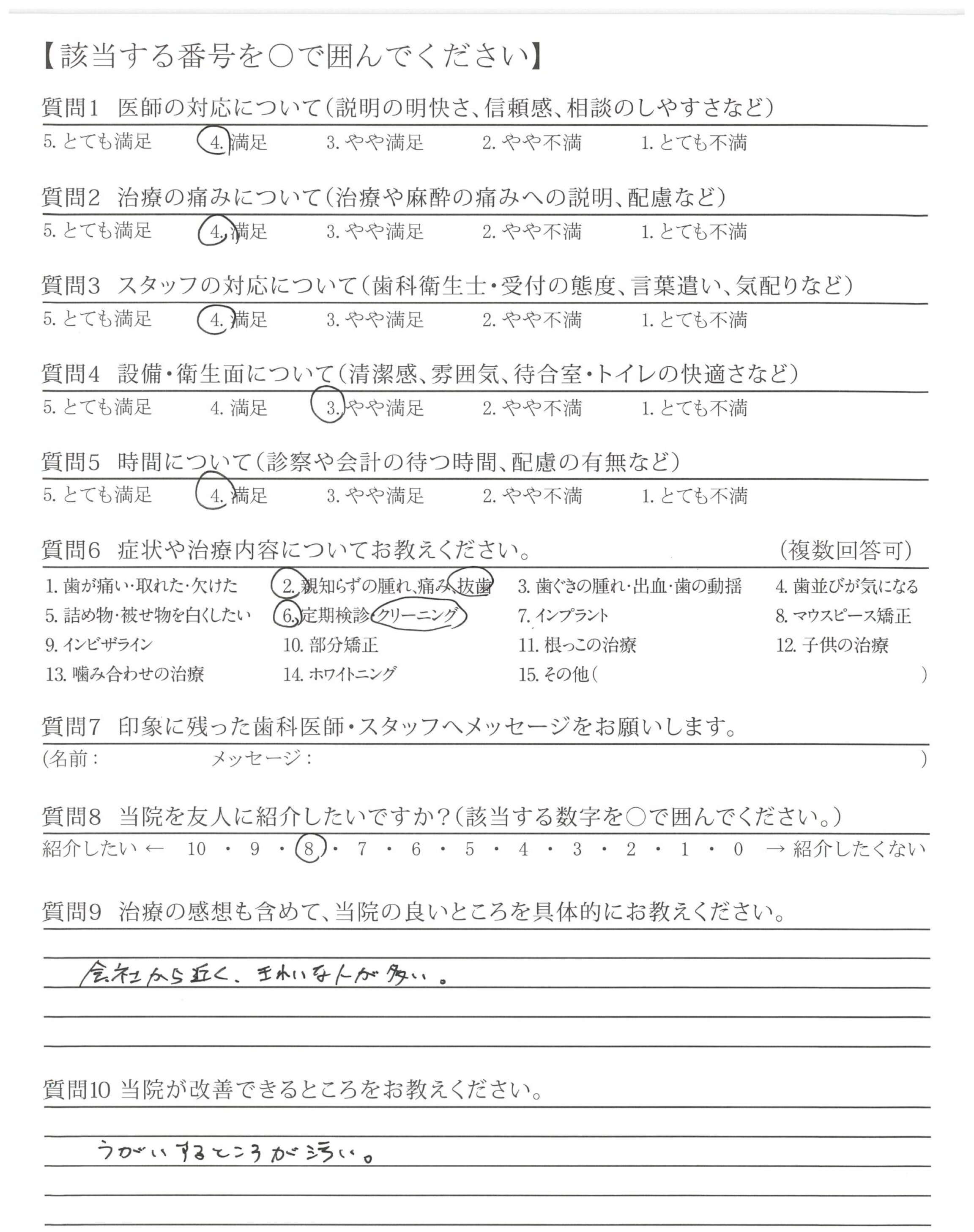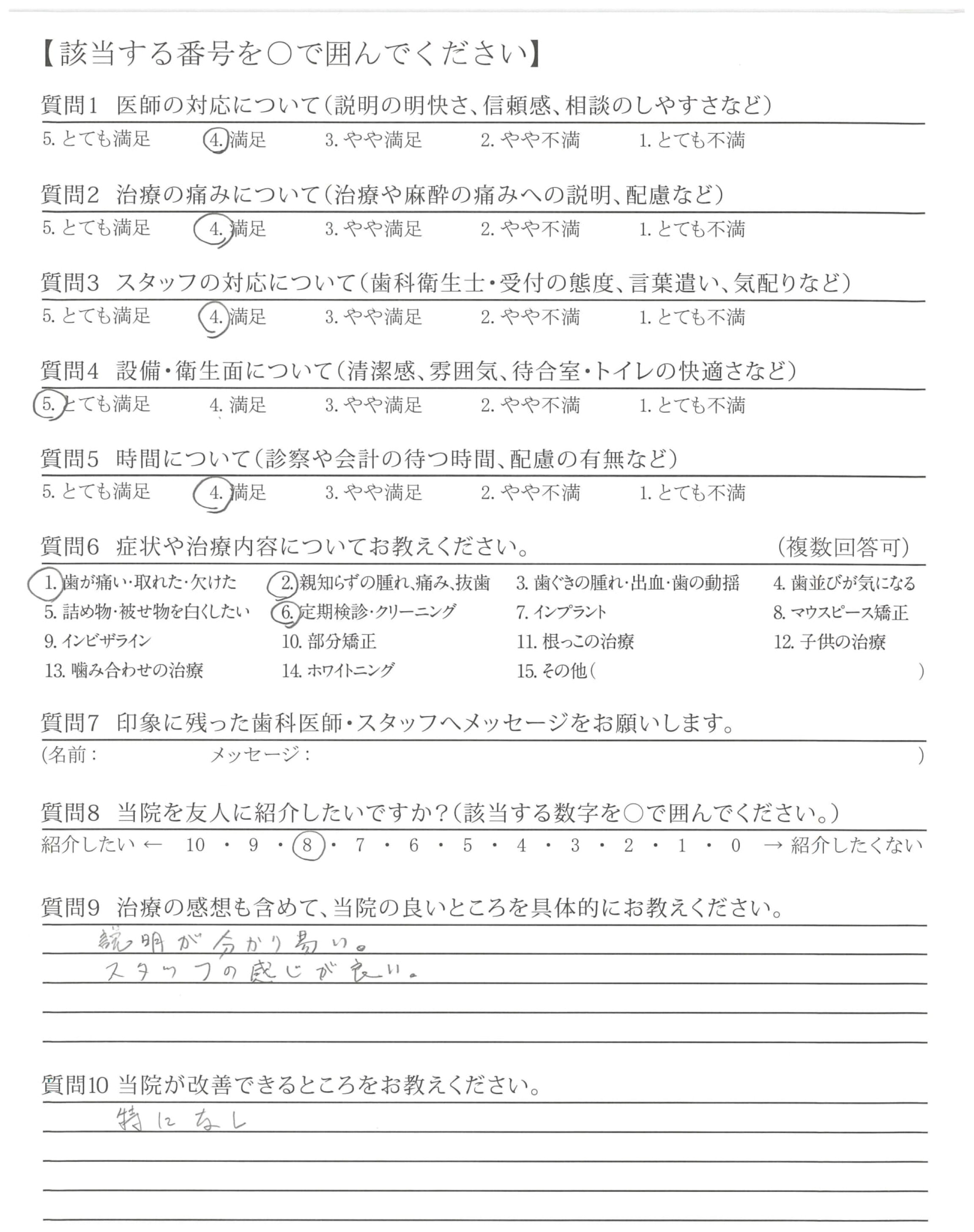 衛生士さんの案内がとても丁寧で、安心できました。そこから麻酔の説明やその後の体への反応を説明していただき、始めての抜歯ではありましたが、不安なこともなく、非常に満足しています。