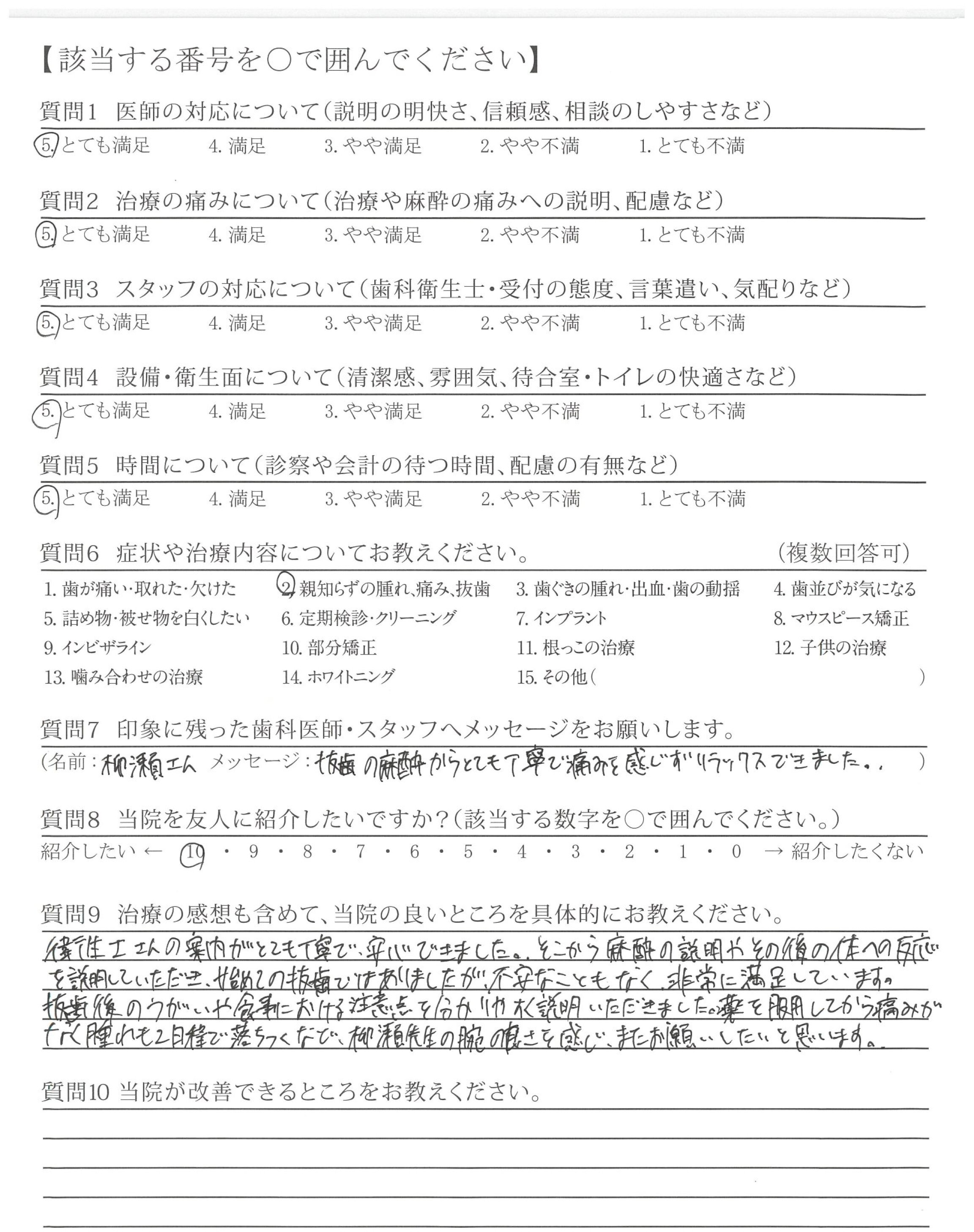 薬を服用してから痛みがなく腫れも2日程で落ちつくなど、柳瀬先生の腕の良さを感じ、またお願いしたいと思います。