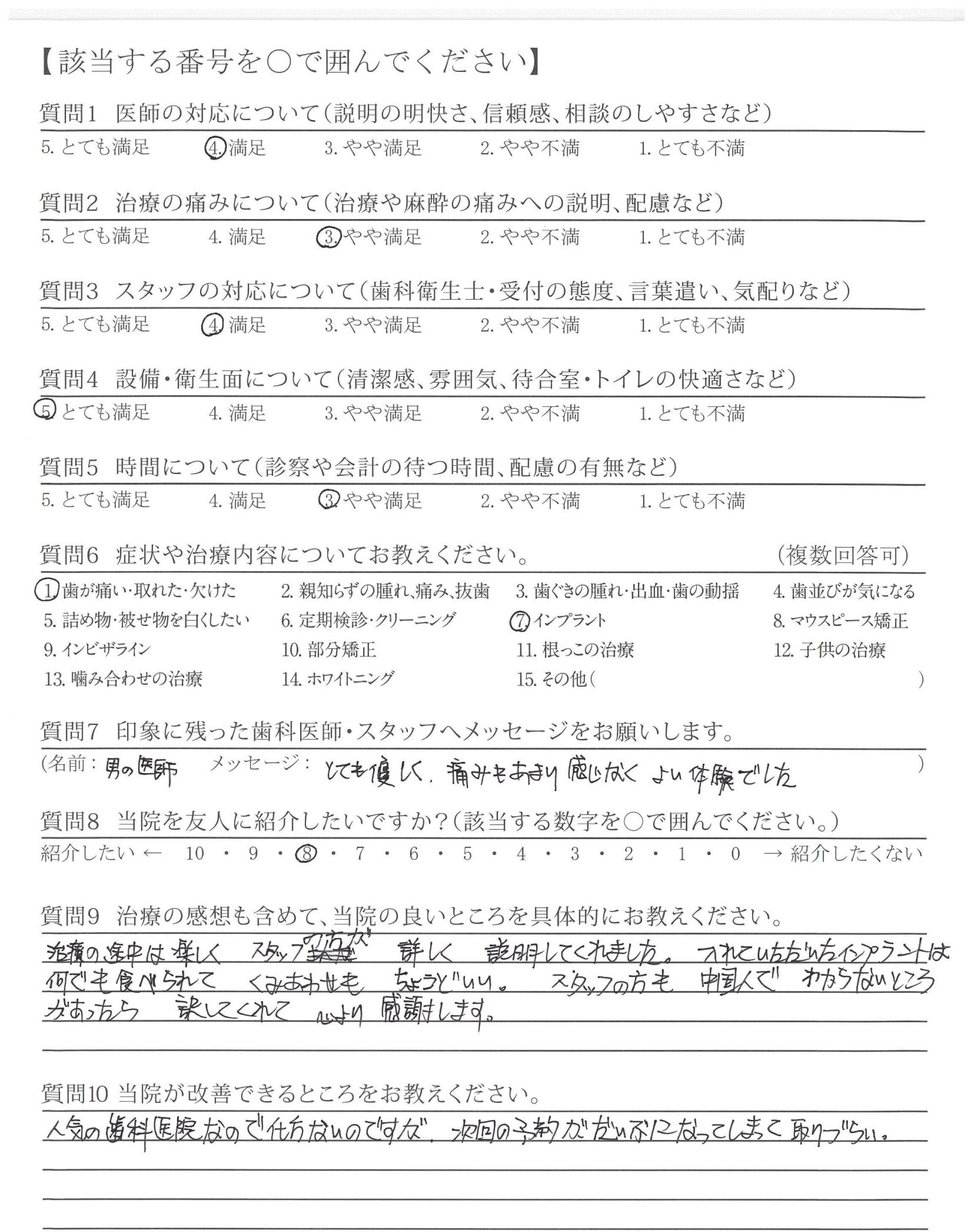 治療の途中は楽しくスタッフの方が詳しく説明してくれました。入れていただいたインプラントは何でも食べれられてくみあわせもちょうどいい。