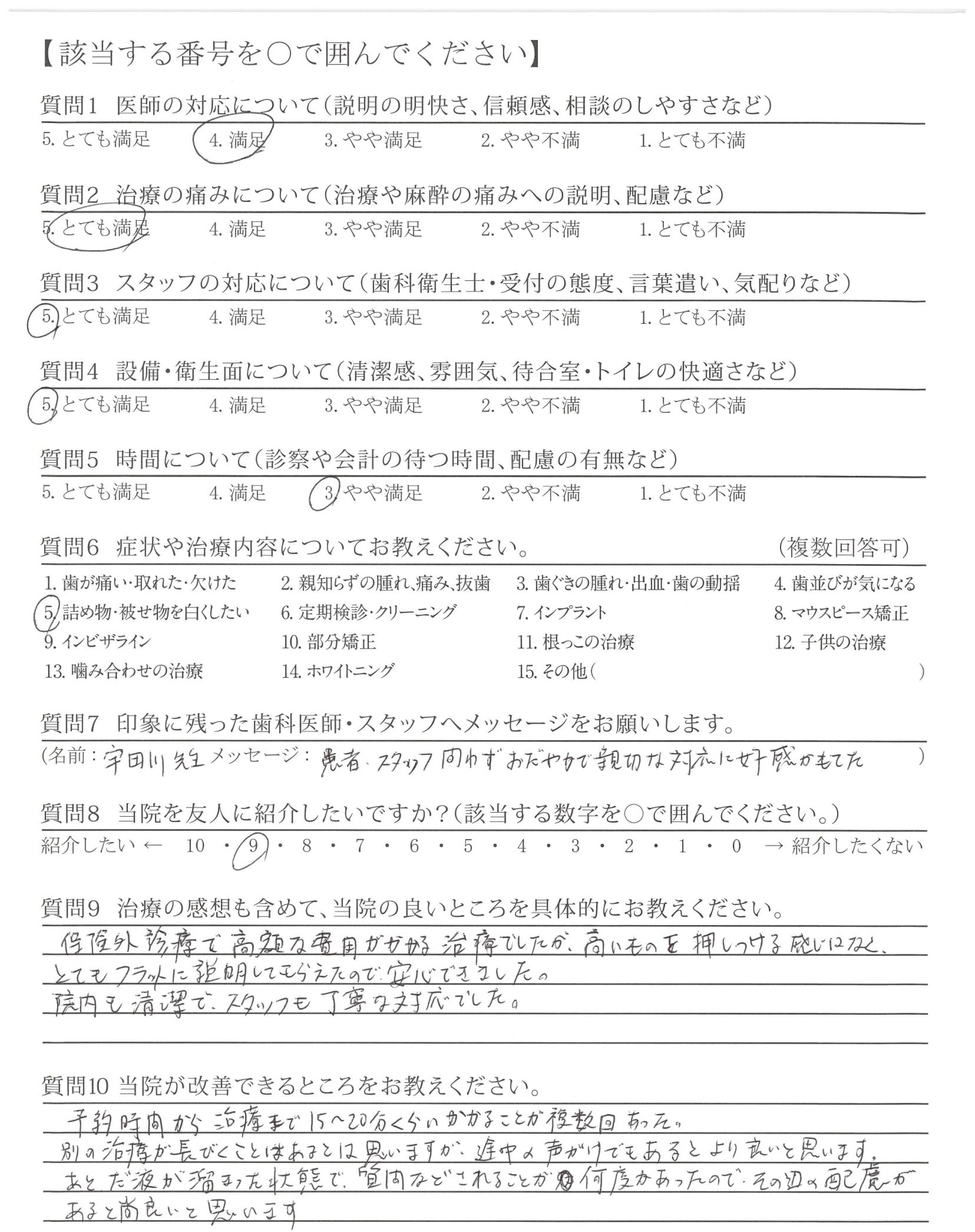 予約時間から治療まで15~20分くらいかかることが複数回あった。別の治療が長びくことはあるとは思いますが、途中の声がけでもあるとより良いと思います。あとだ液が溜まった状態で、質問などされることが何度かあったので、その辺の配慮があると尚良いと思います