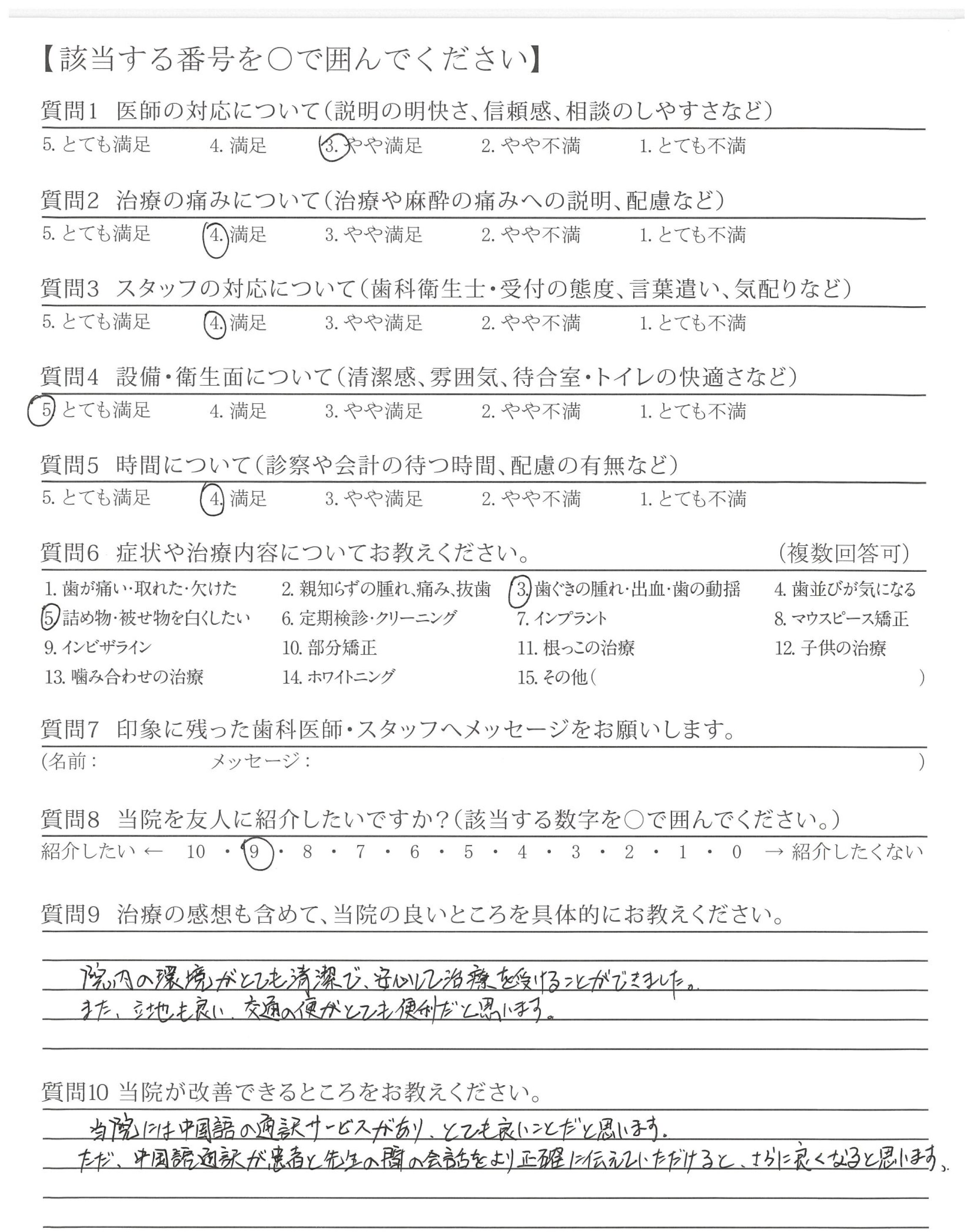 当院には中国語の通訳サービスがあり、とても良いことだと思います。ただ、中国語通訳が患者と先生の間の会話をより正確に伝えていただけると、さらに良くなると思います。