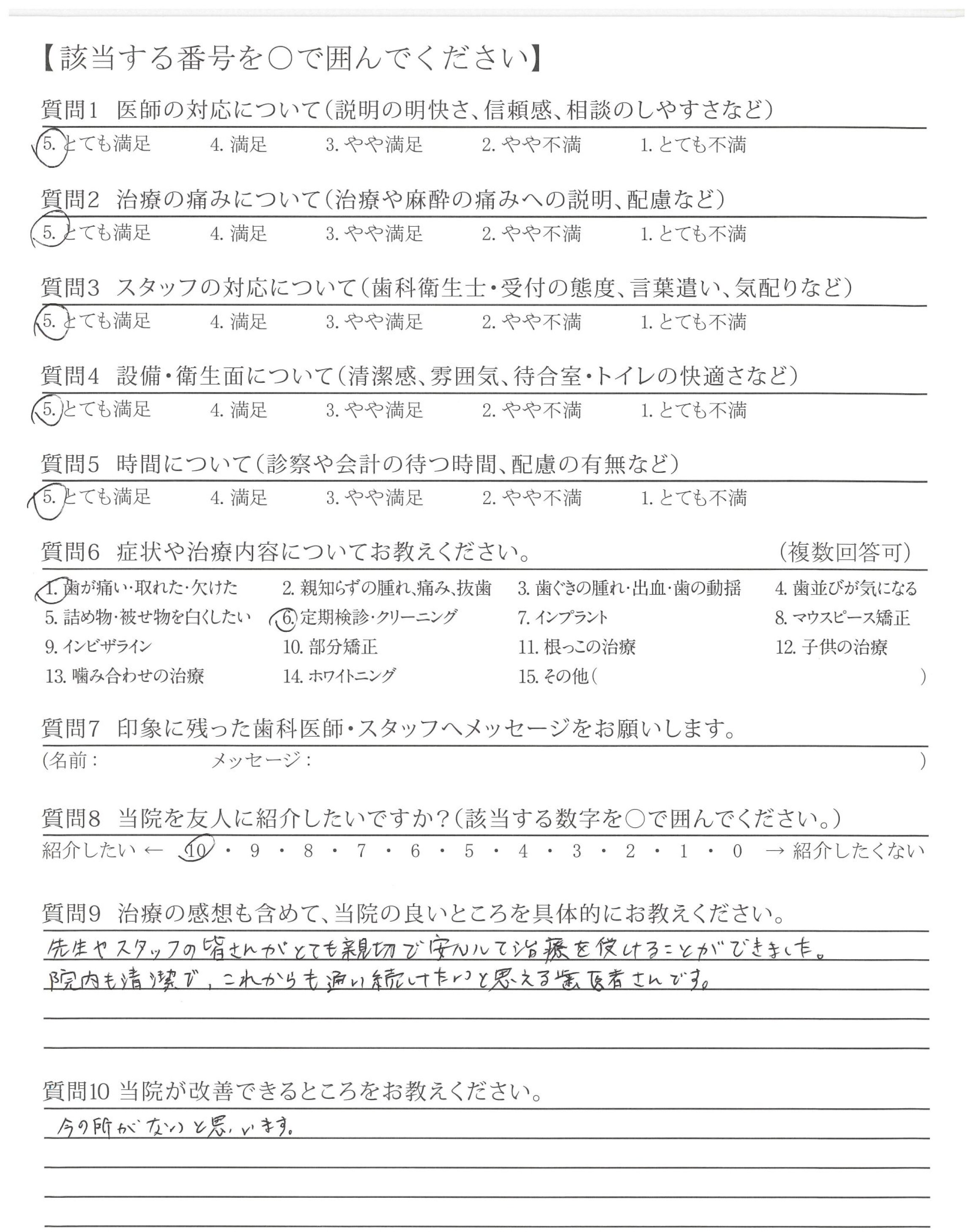 当サイトに掲載しているアンケートは、第三者機関である日本歯科医療評価機構が医院の協力を得て直接患者さんへ調査を行ったもので、医院では操作のできない客観的な評価です。毎週患者さんから届くアンケート結果を集計し、このページを更新しています。