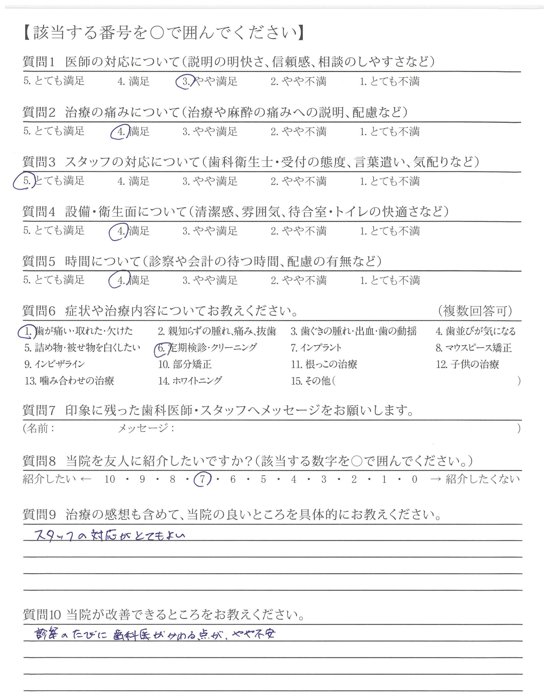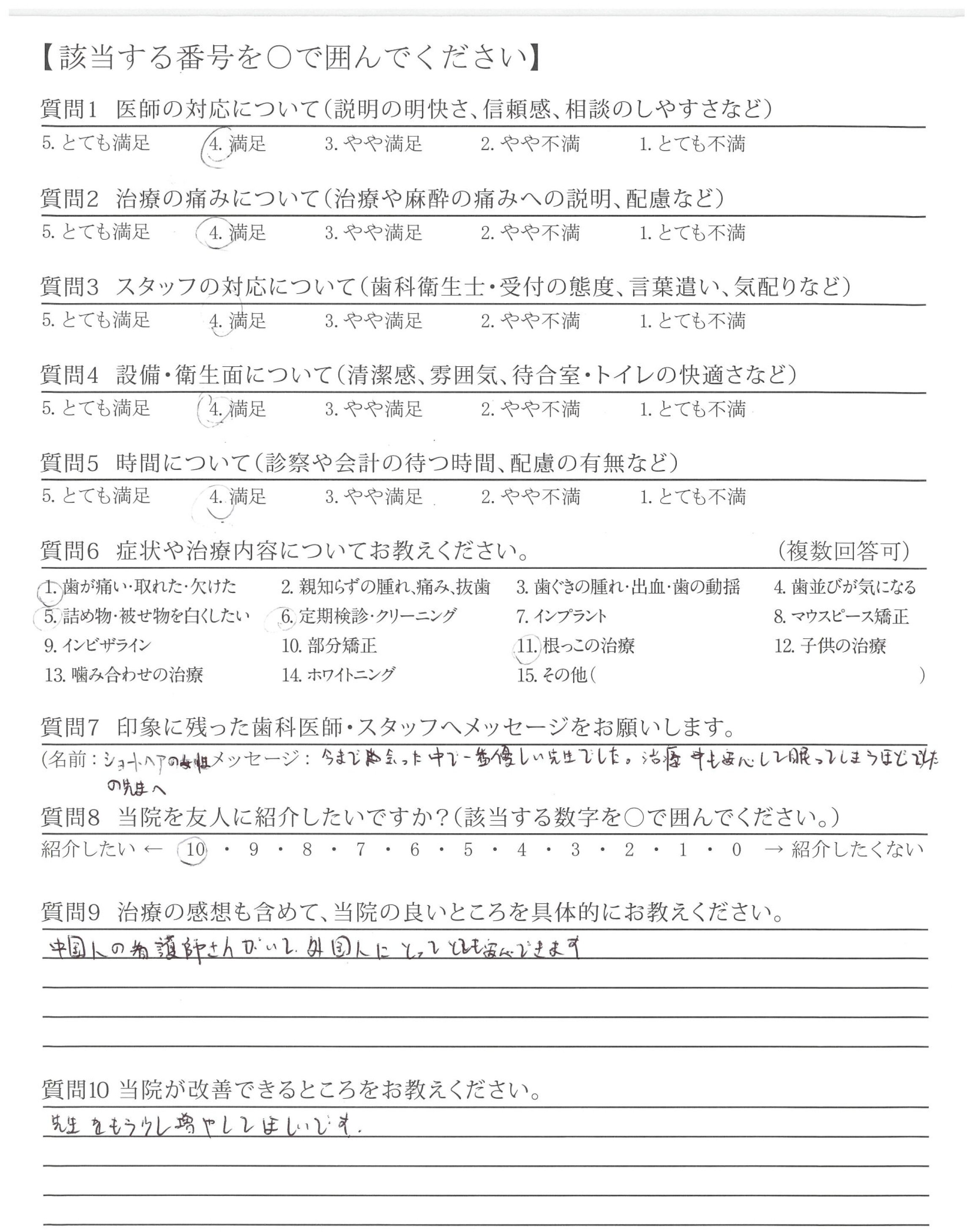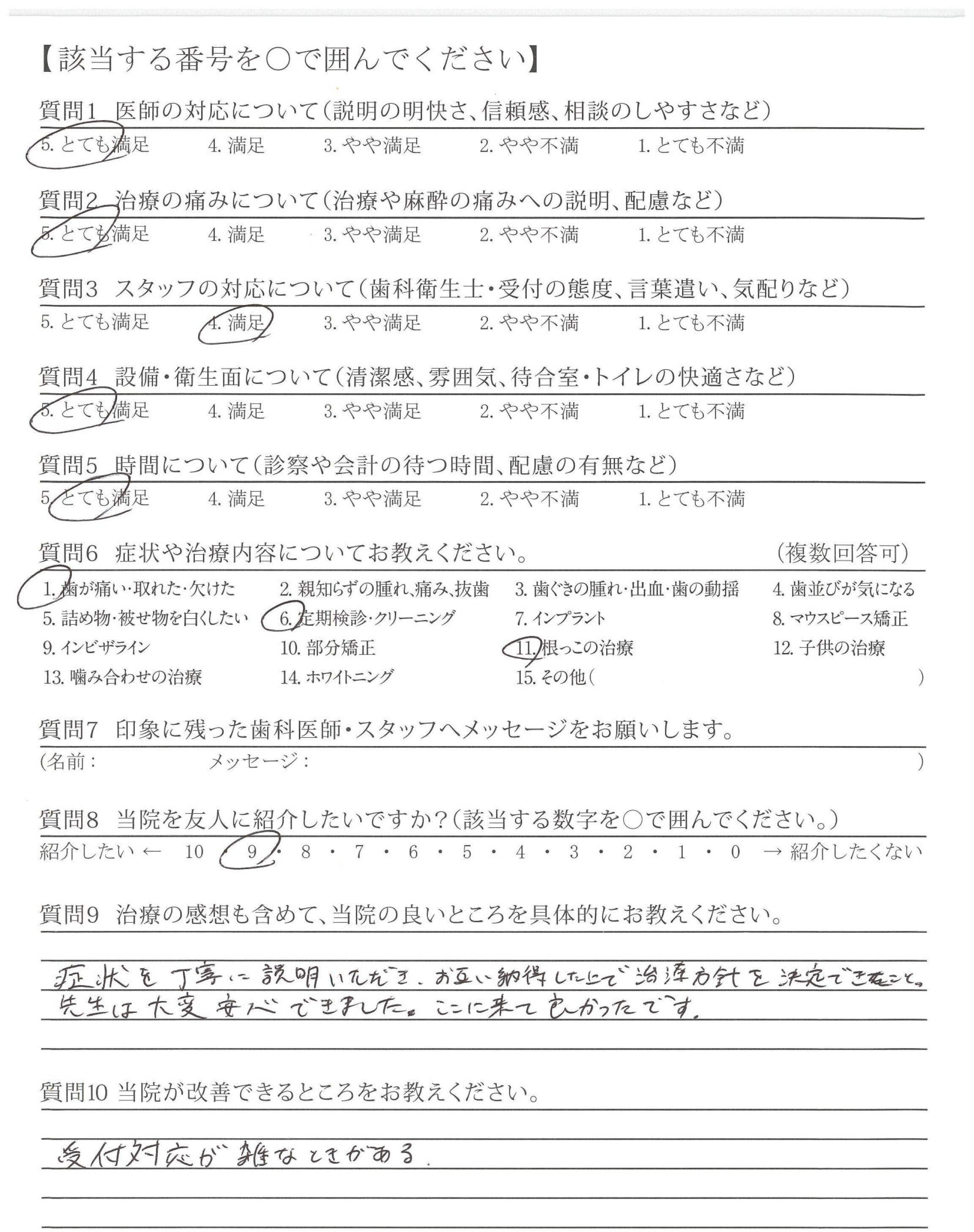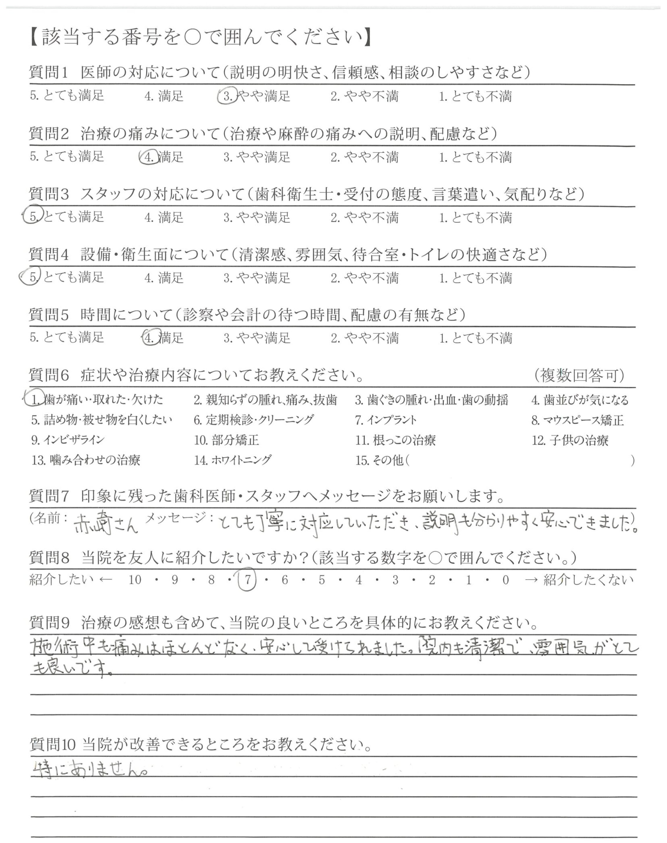 治療の途中は楽しくスタッフの方が詳しく説明してくれました。入れていただいたインプラントは何でも食べれられてくみあわせもちょうどいい。