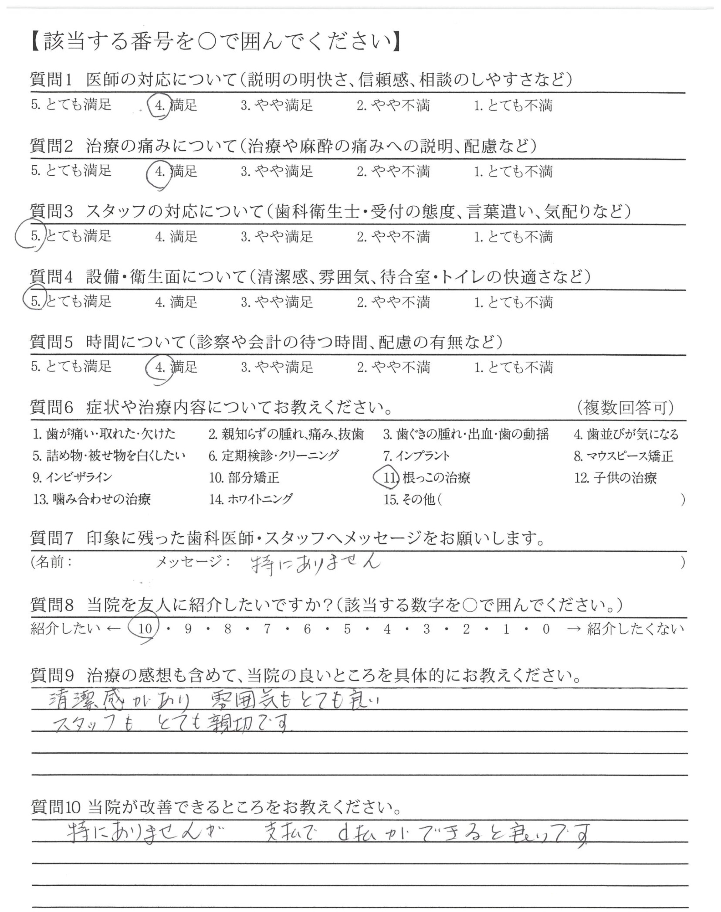 歯の根の治療は痛いイメージがありましたが、治療中に痛みが出ないように配慮してくださり安心して治療ができました。