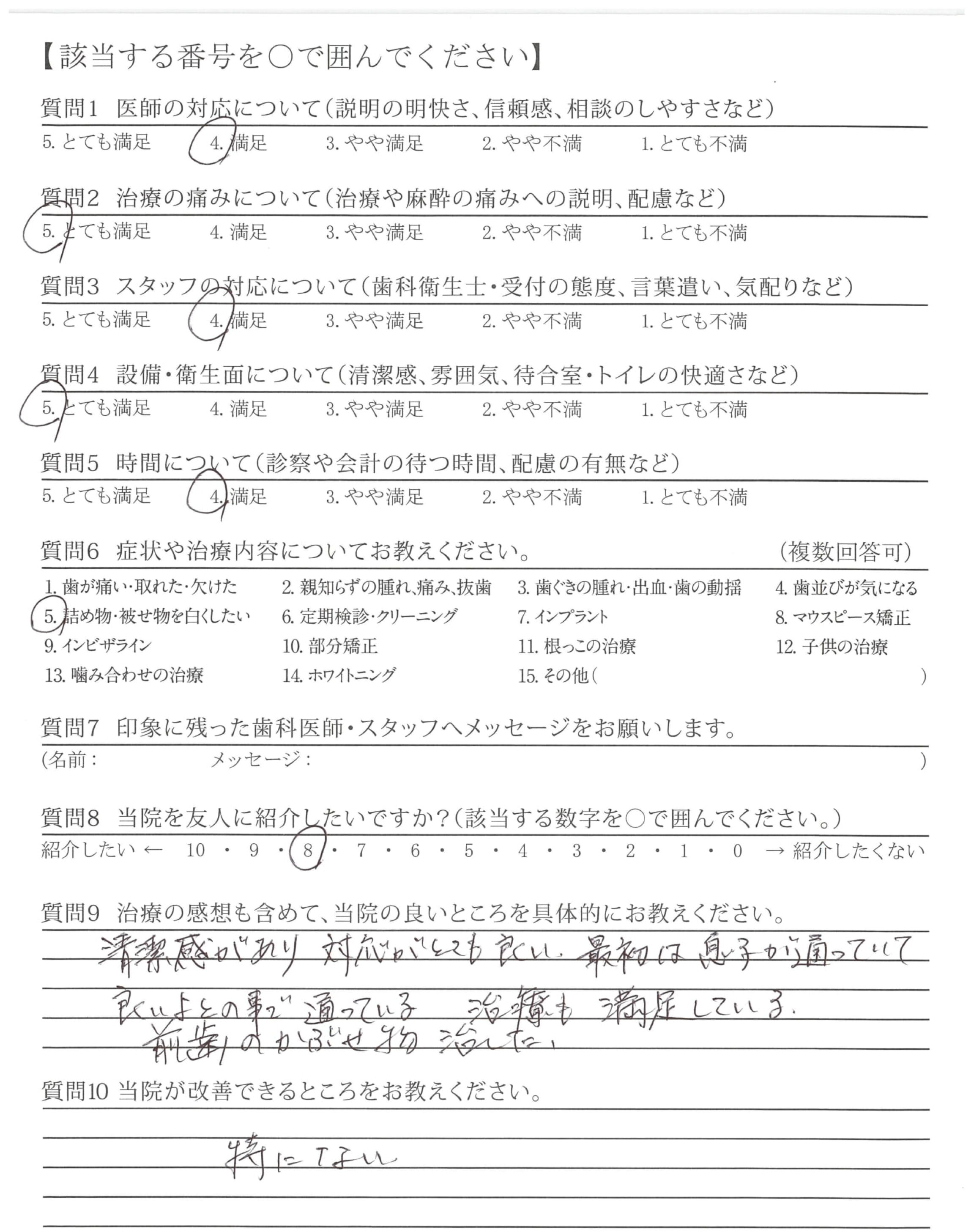 ていねいな診療で痛みもなくキレイなかぶせものを入れて下さりありがとうございます。