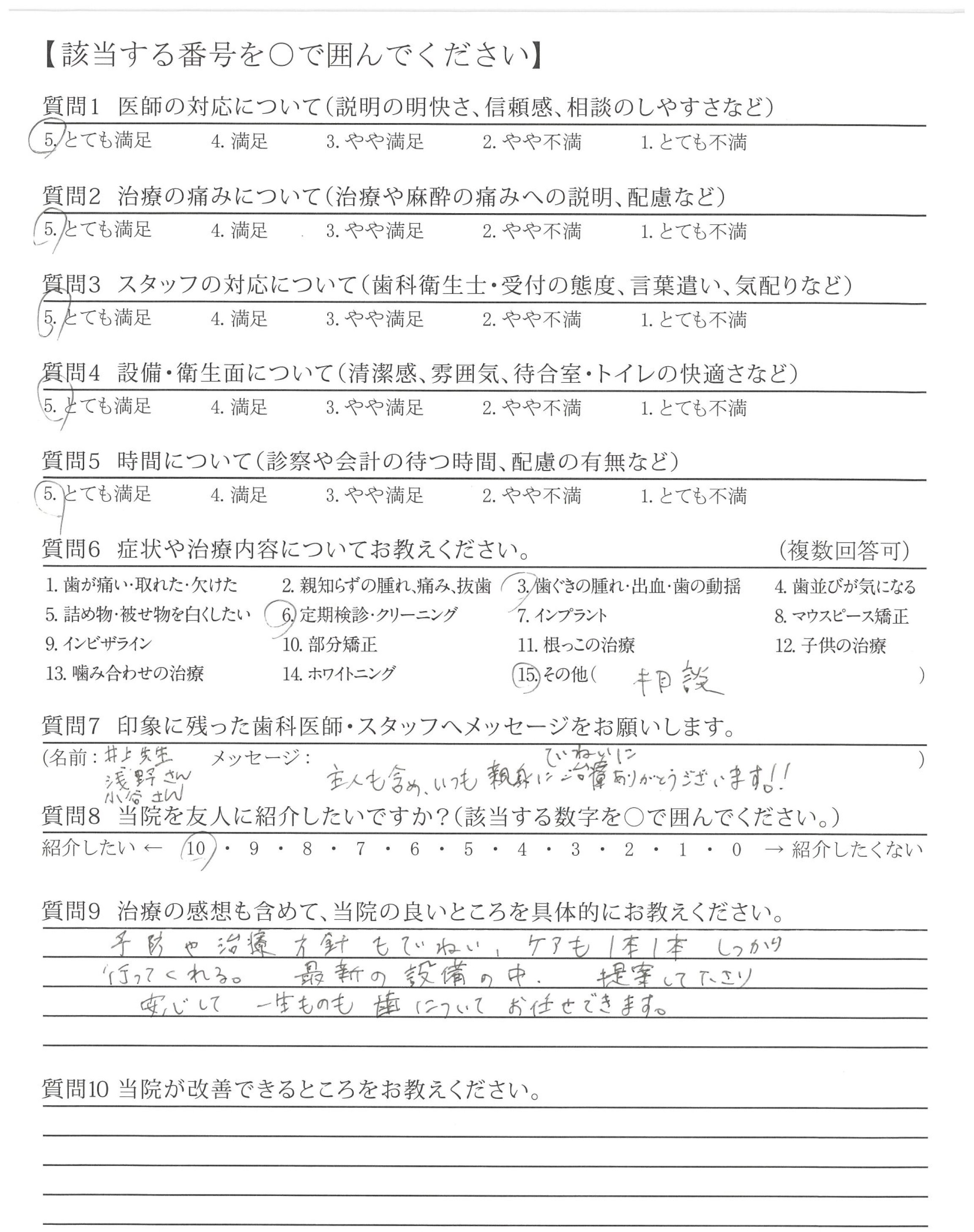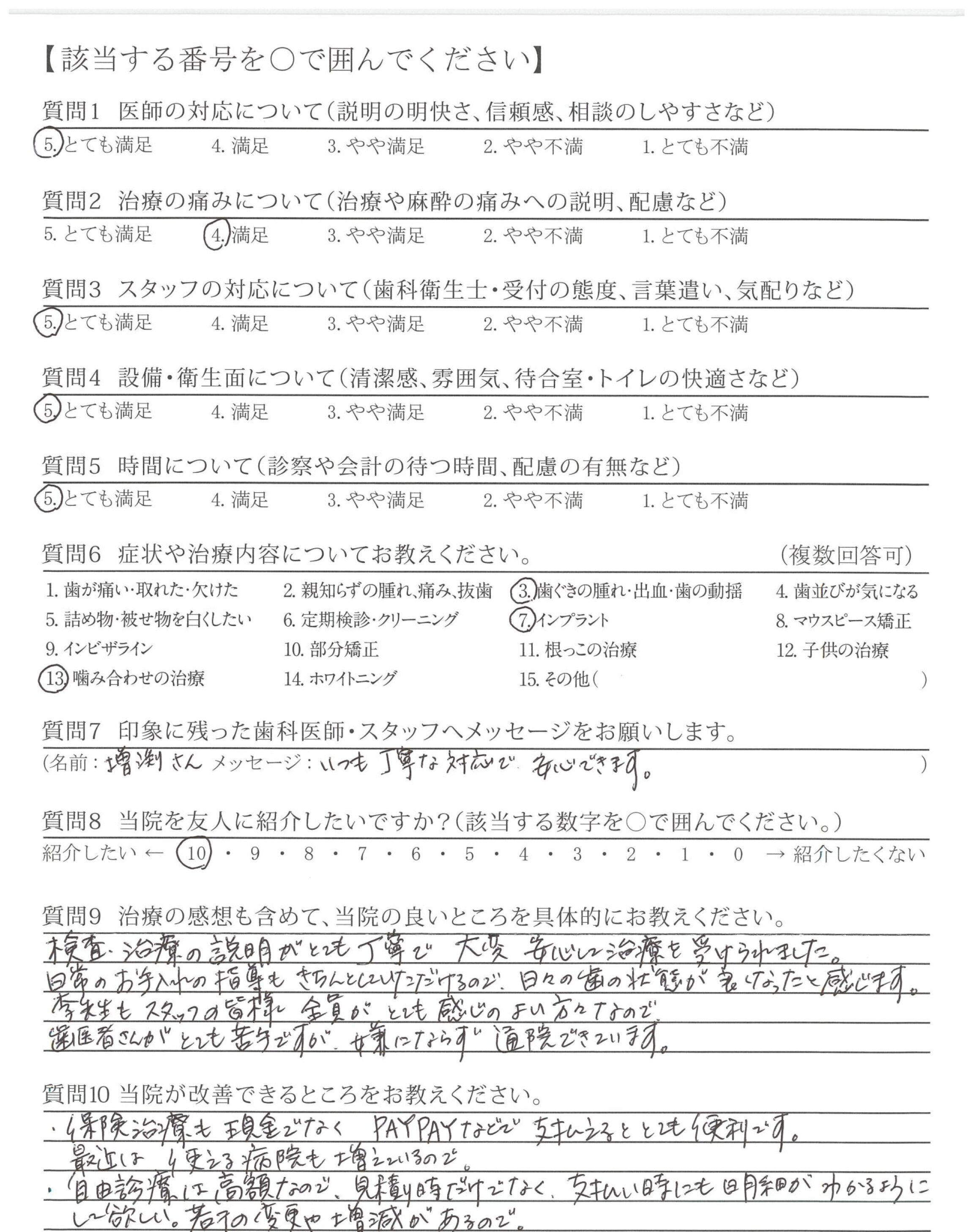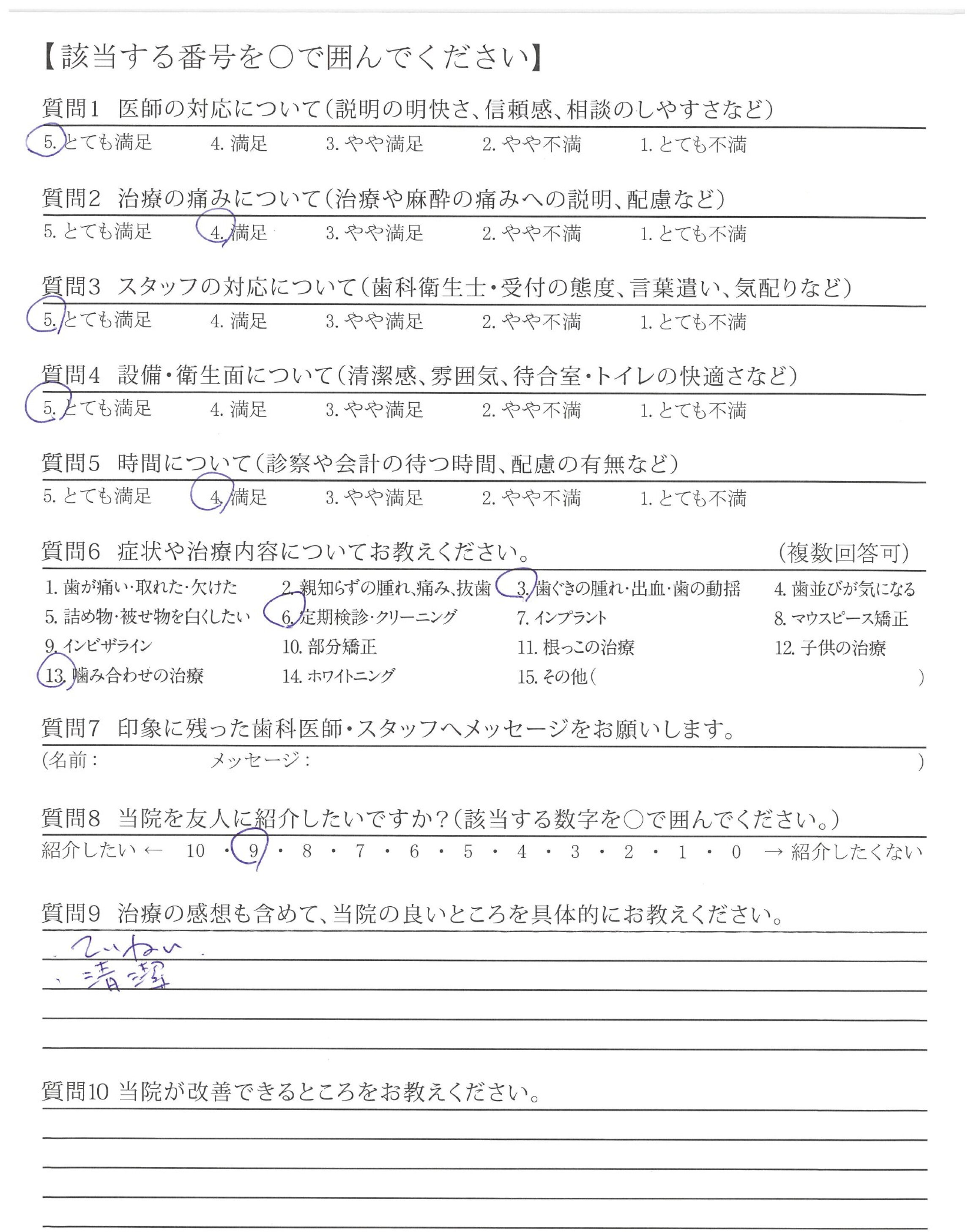 他院と比べ、フロスを通されるときの感覚や器具が歯に当たらず不快でないことなど丁寧さが違うなと思い、感動しています。