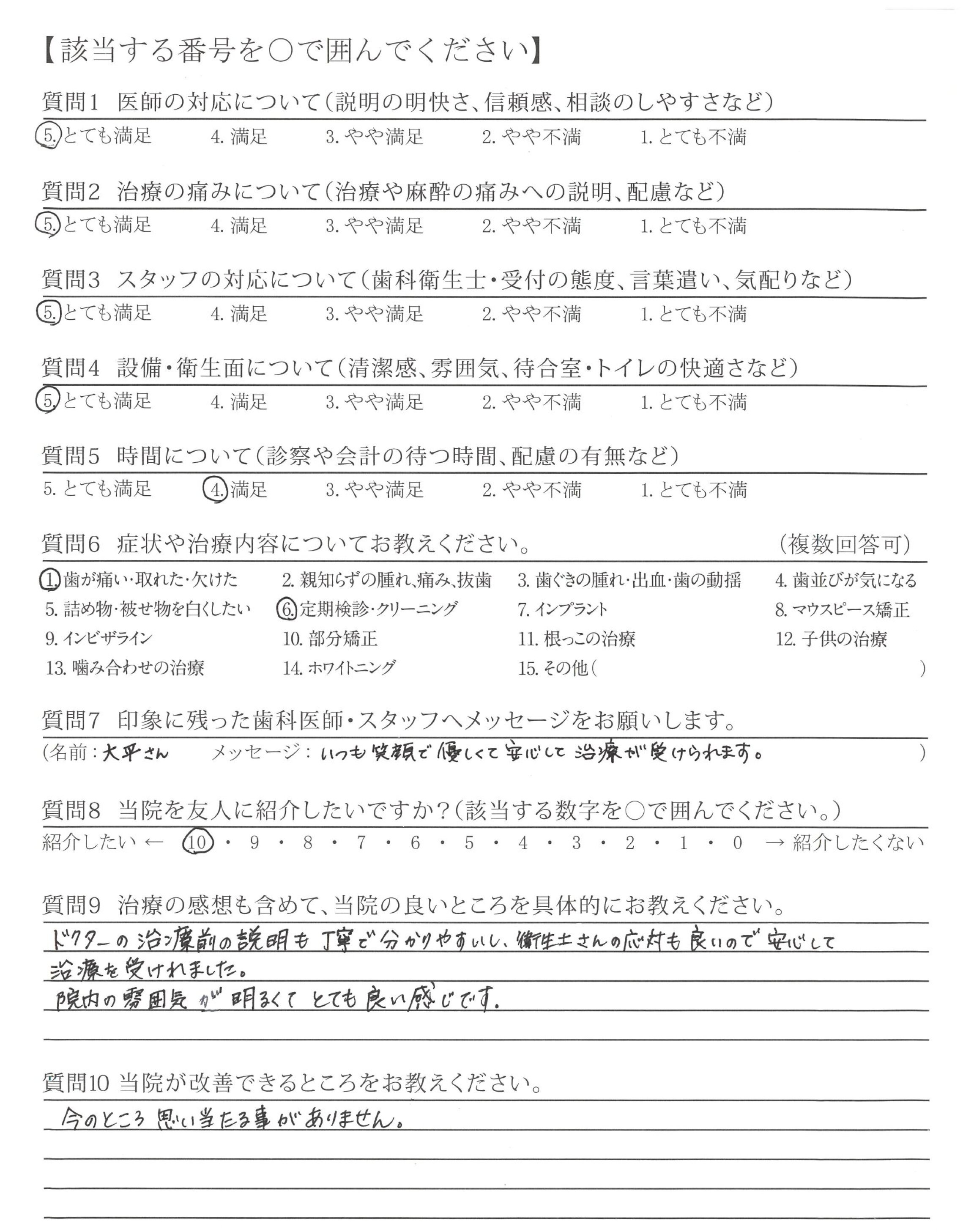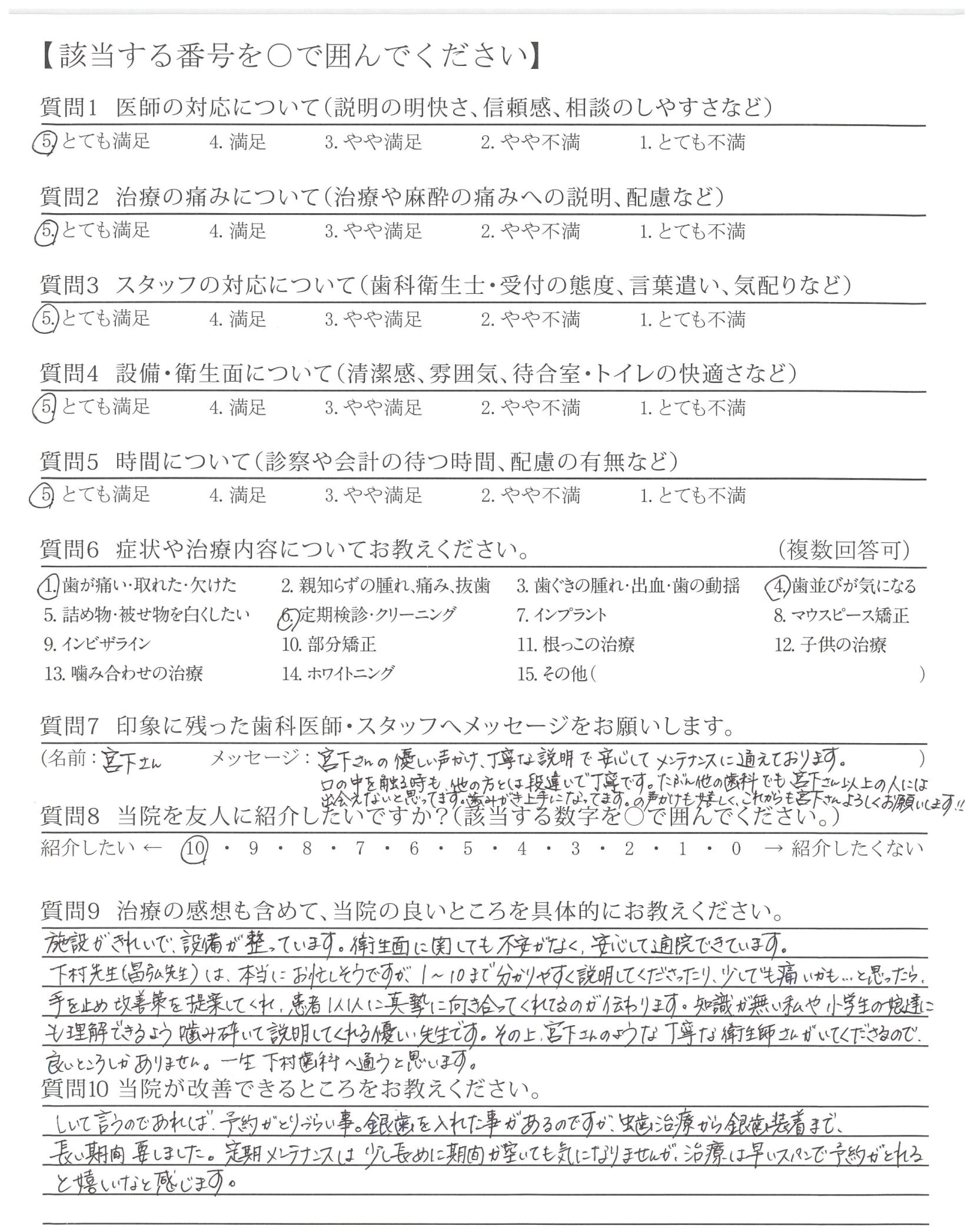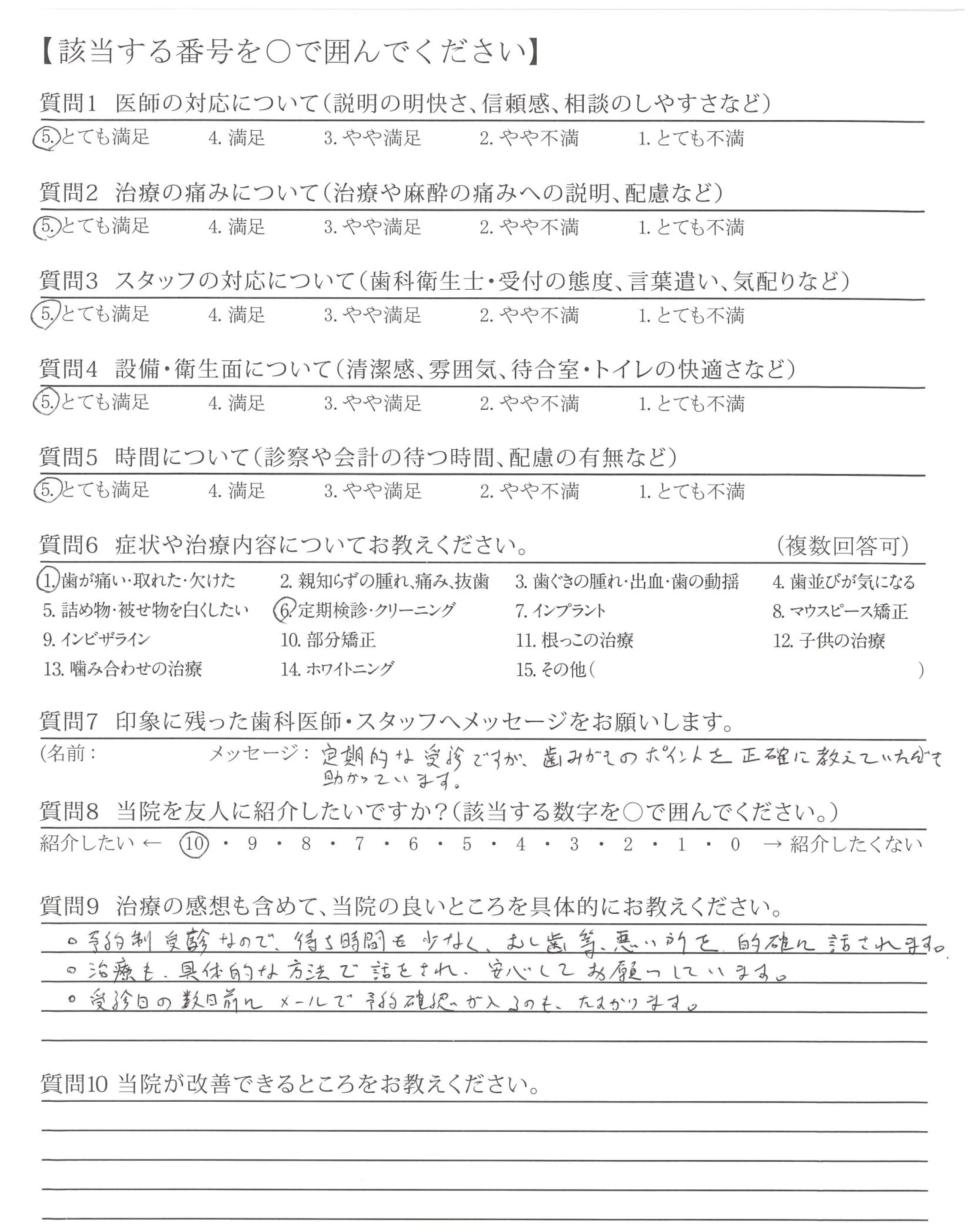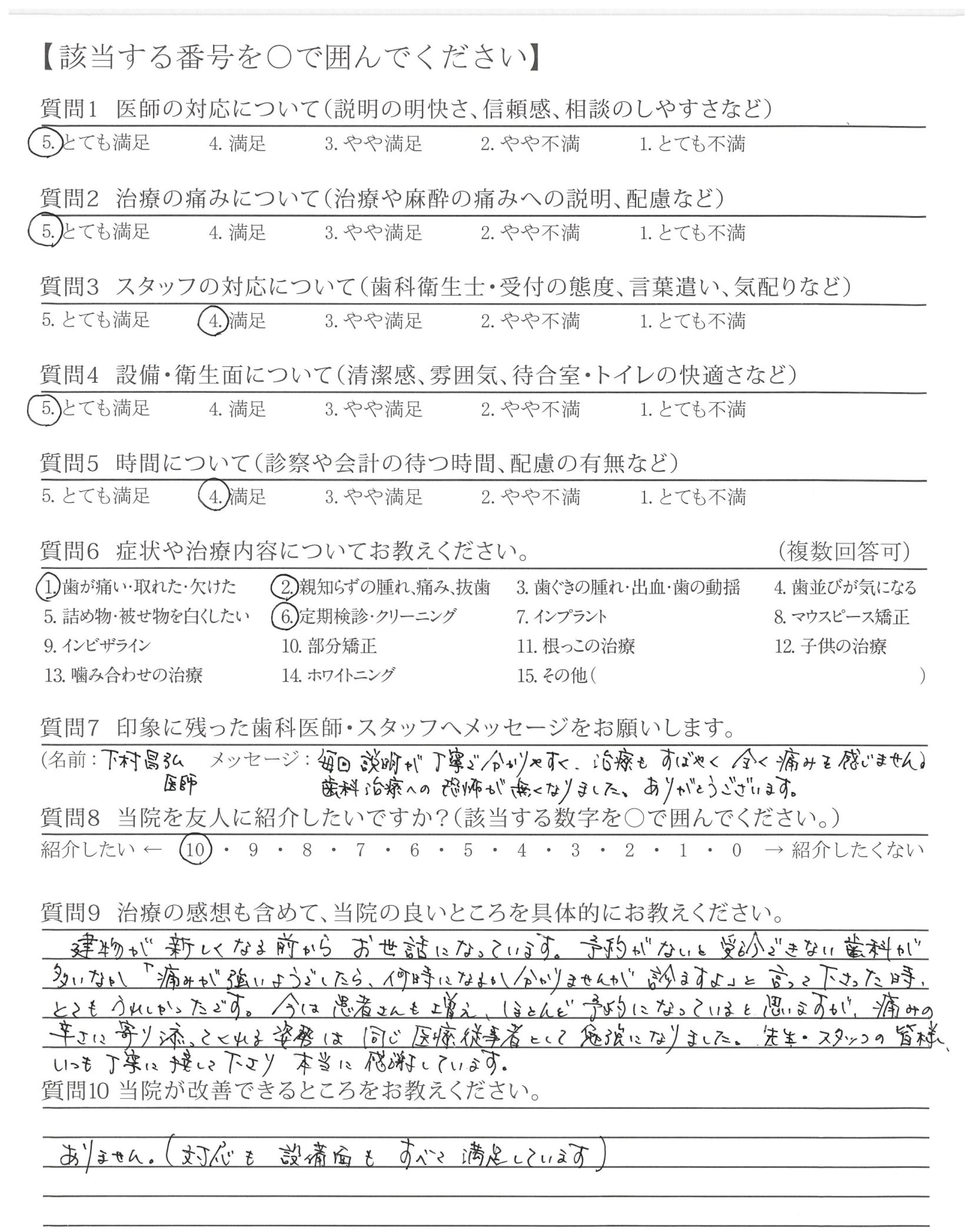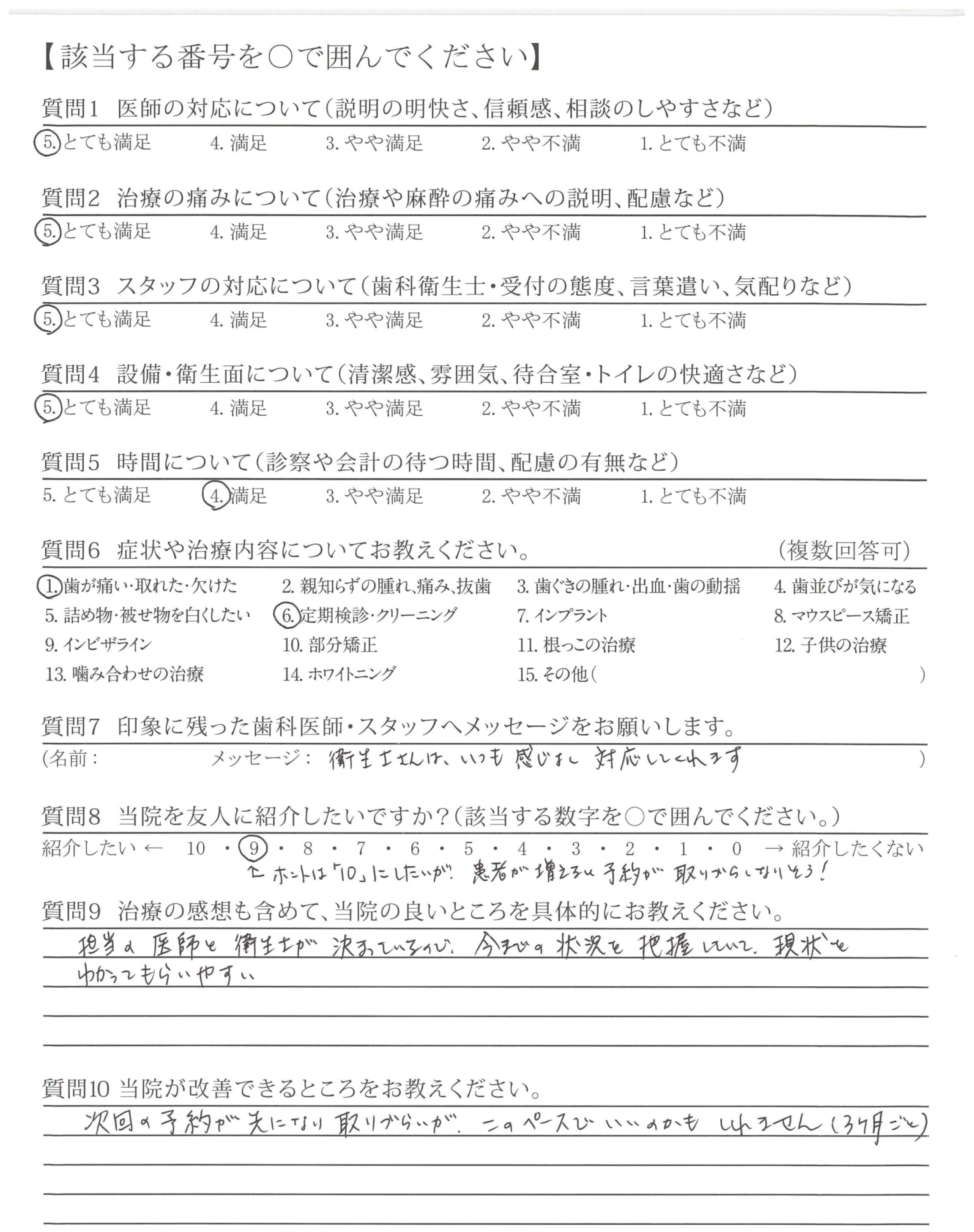 いつも丁寧に歯のメンテナンスしてくださり、ありがとうございます。質問した際は、分かりやすく説明して下さって安心できます。