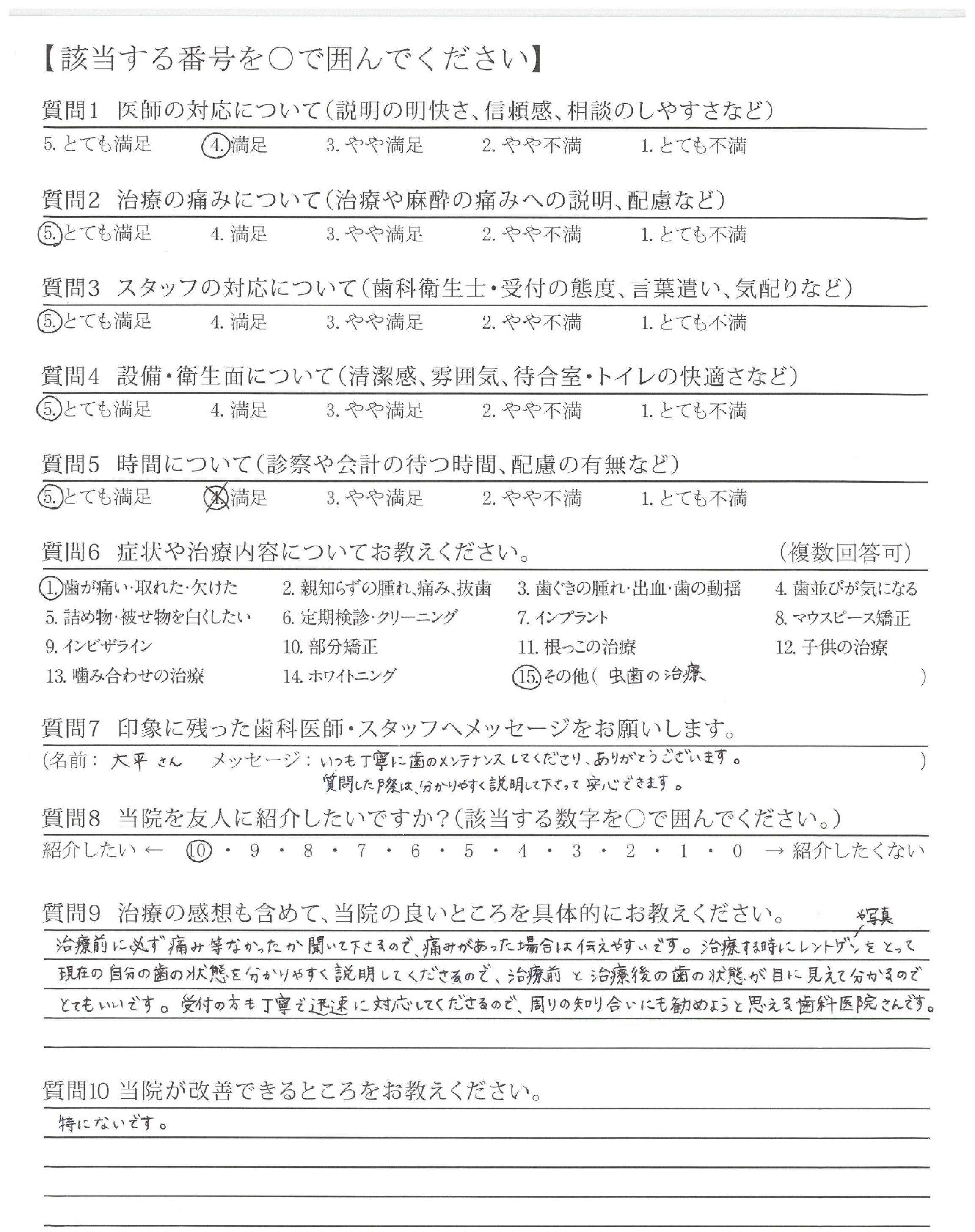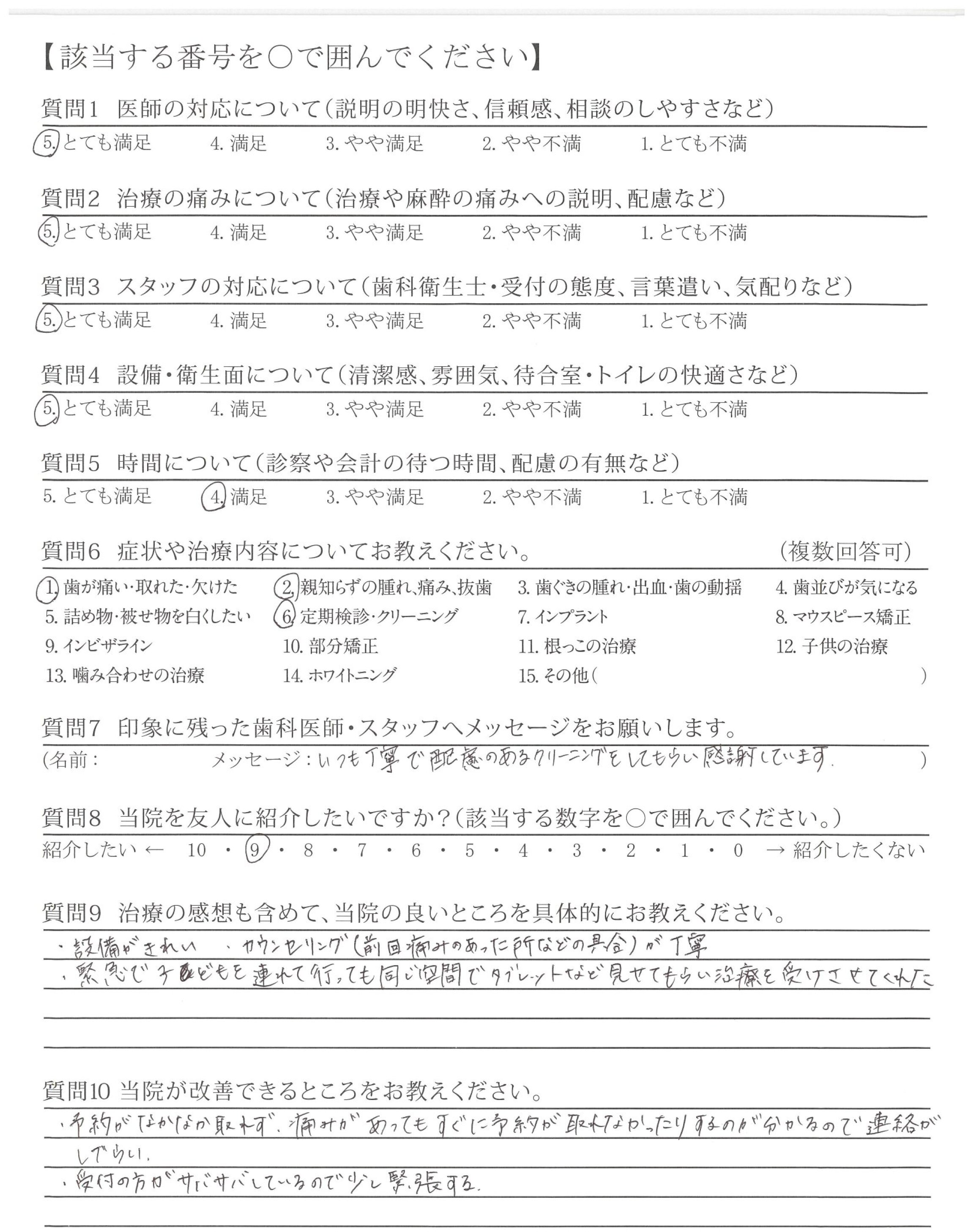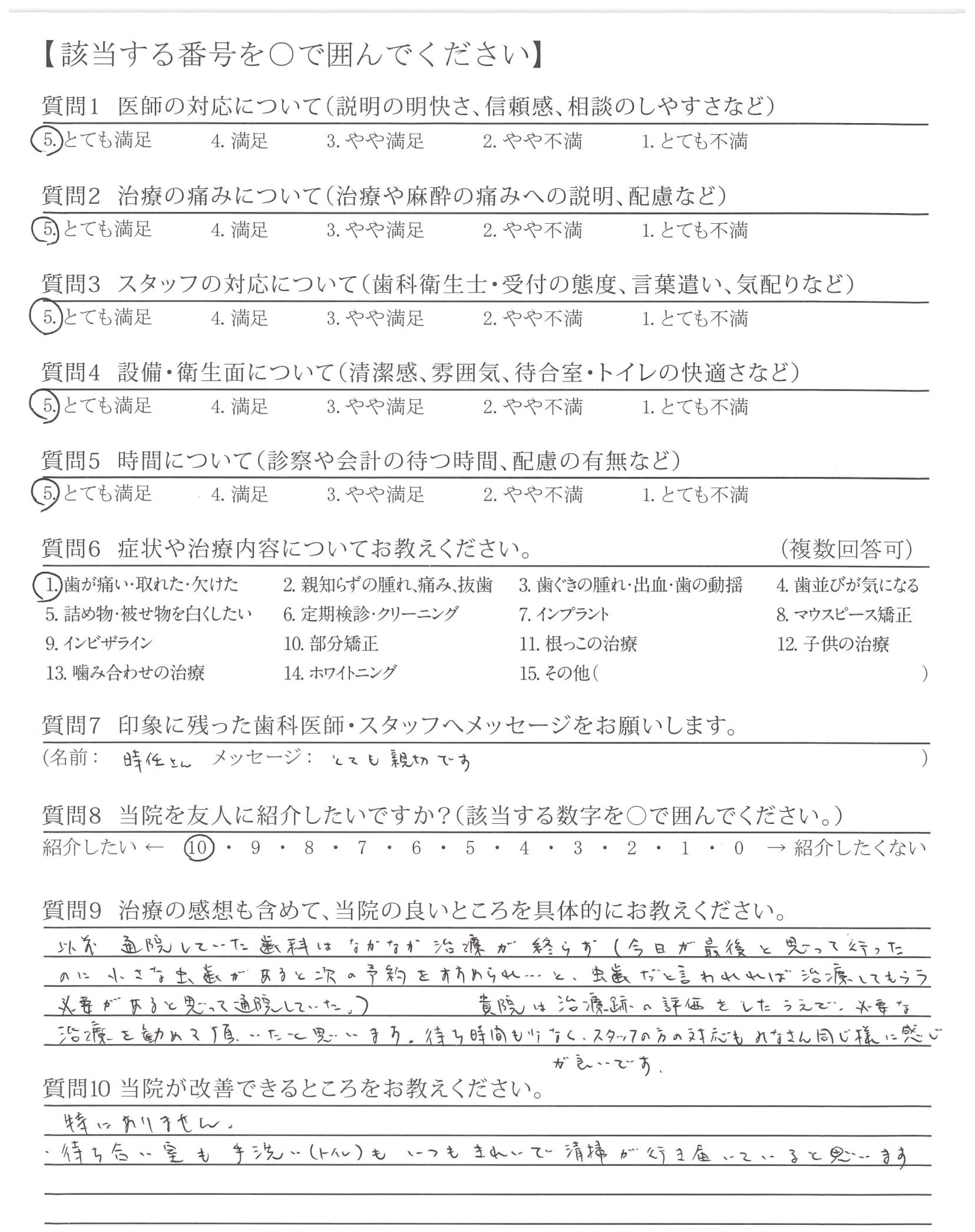 以前通院していた歯科はなかなか治療が終らず(今日が最後と思って行ったのに小さな虫歯があると次の予約をすすめられ・・・と、虫歯だと言われれば治療してもらう必要があると思って通院していた。)貴院は治療跡の評価をしたうえで、必要な治療を勧めて頂いたと思います。