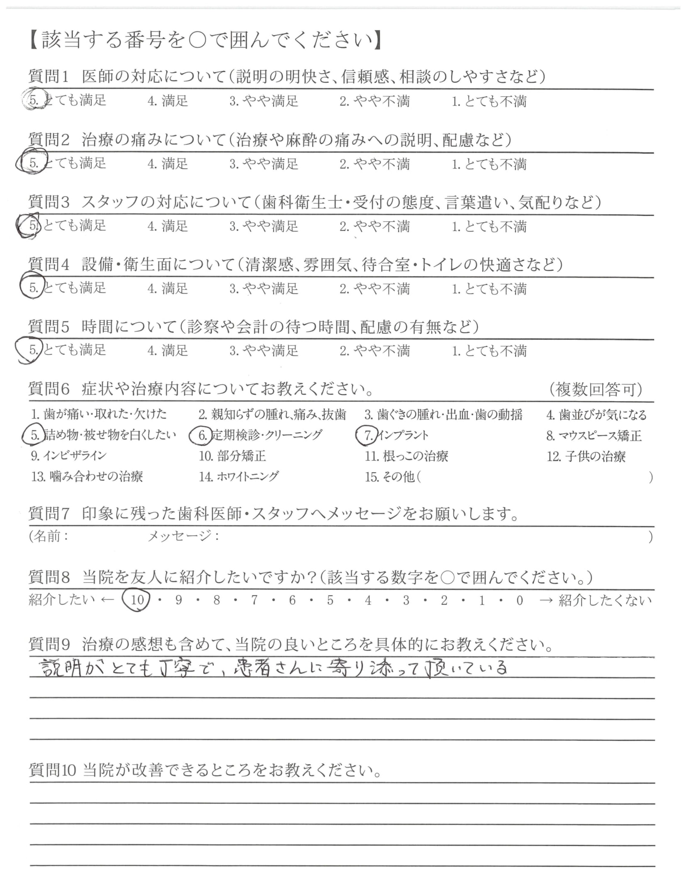 インプラント、根管治療、かぶせ物、詰め物のいずれも白くきれいに仕上げていただき、口の中がとてもきれいになりました。