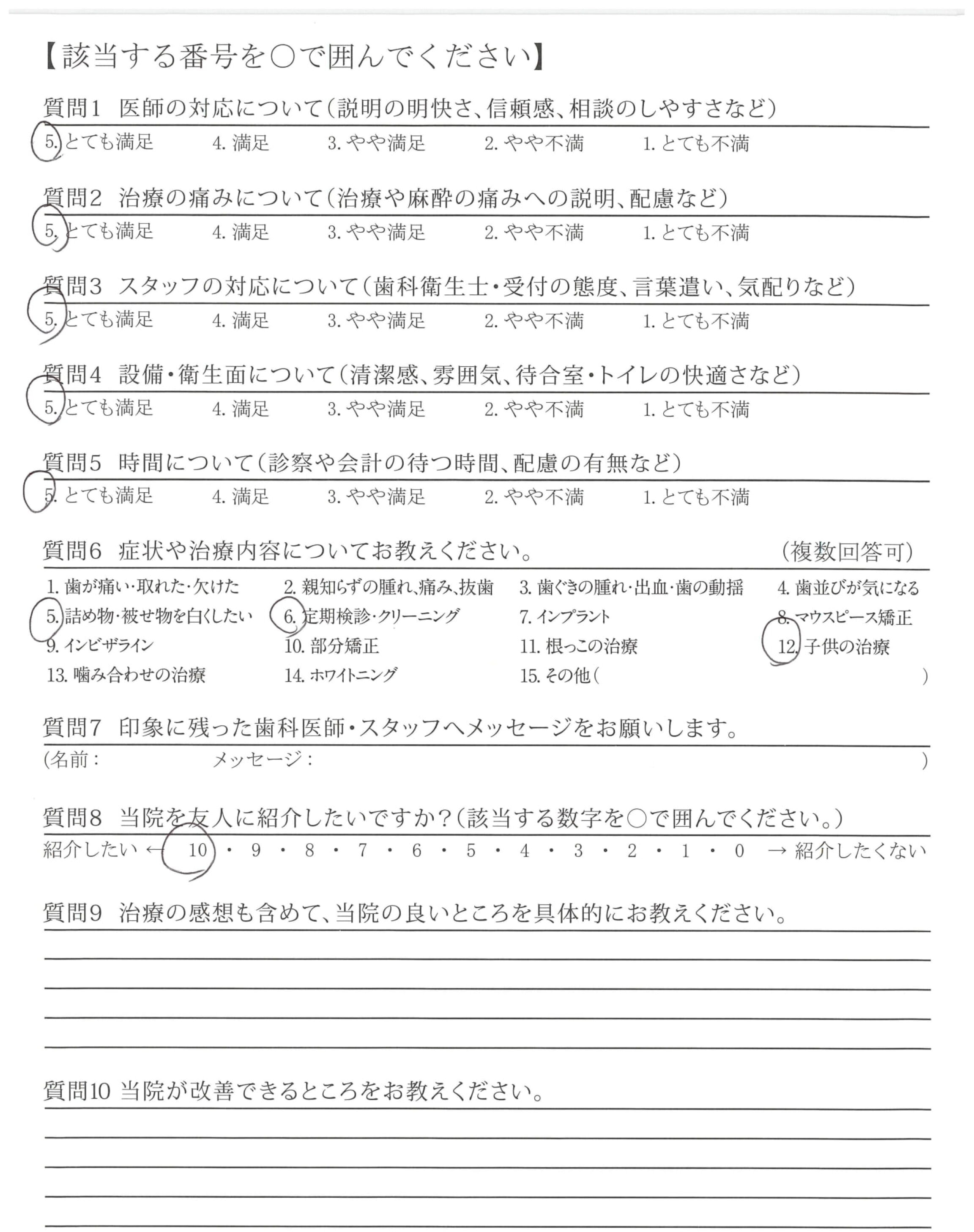 いつも治療は宮坂先生、クリーニングはおぎのさんにしていただいていますが、他の先生にしていただいた時も、しっかりみてもらえたので、とても安心しています。