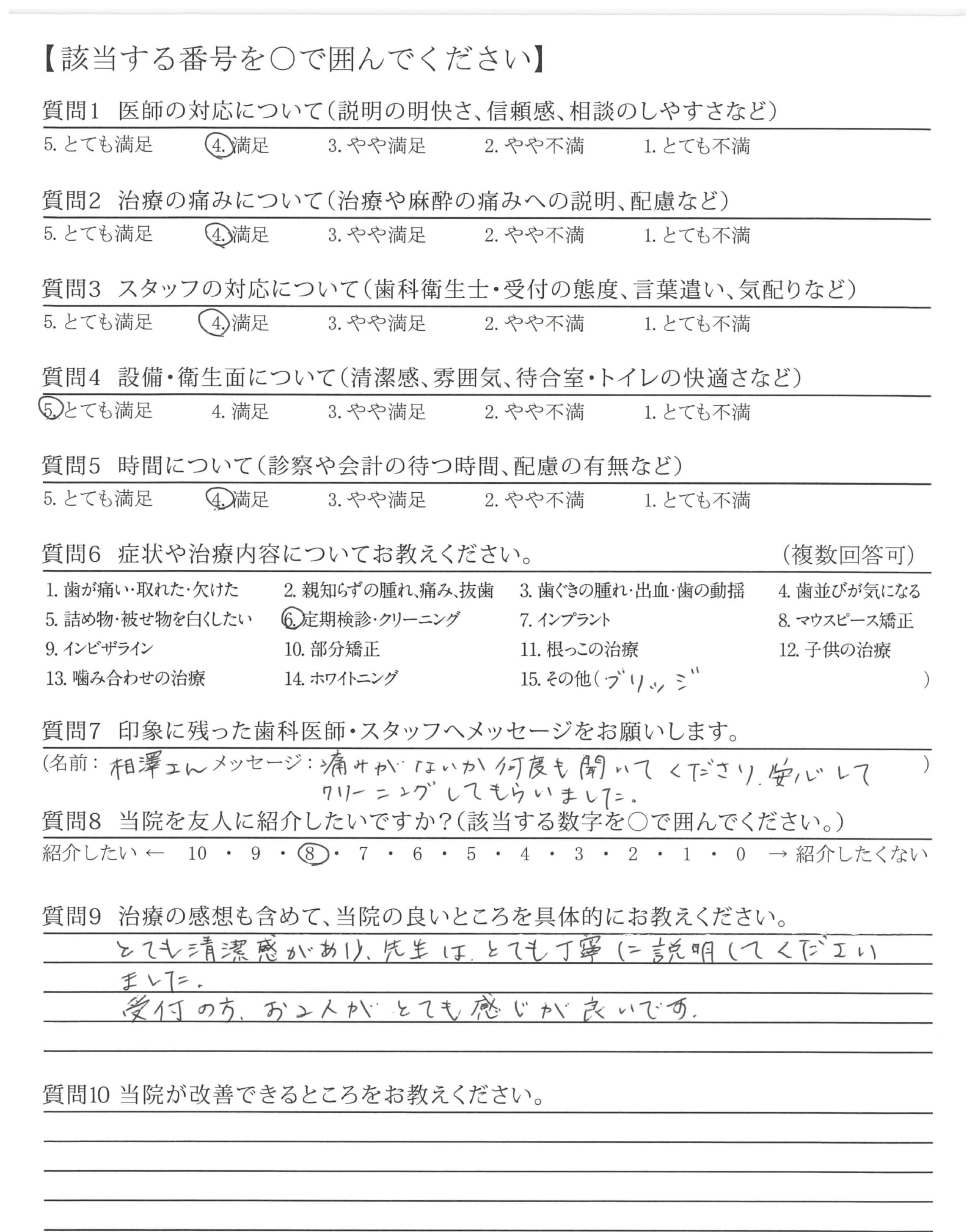 ささいなところまで、わかりやすく説明してくださり、治療やクリーニングまでとても丁寧に対応していただきました。年齢的にも、ますますメンテナンスが必要になってくるため、かかりつけの歯科医院を探していたので、これからもこちらへ通院させていただき、長く自分の歯を守っていけたらと思いました。