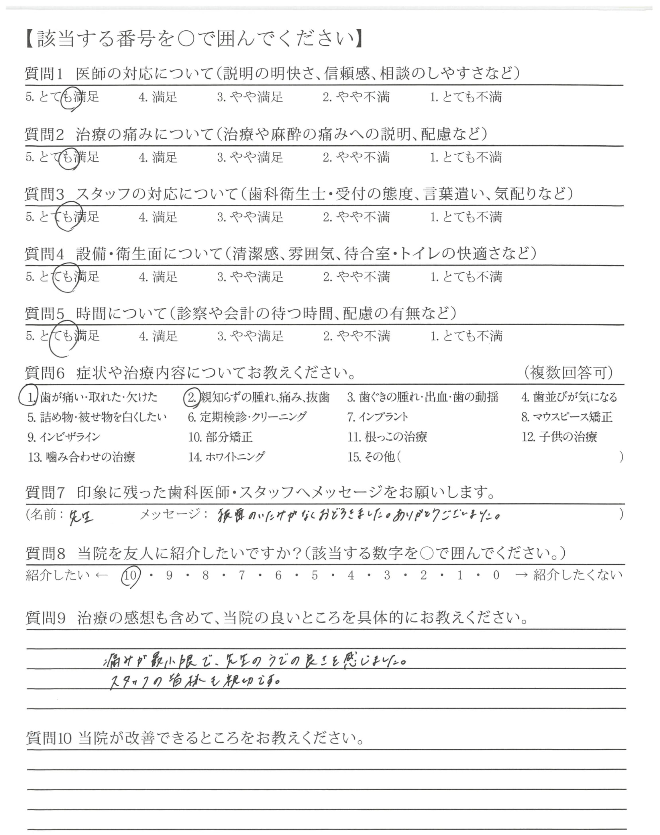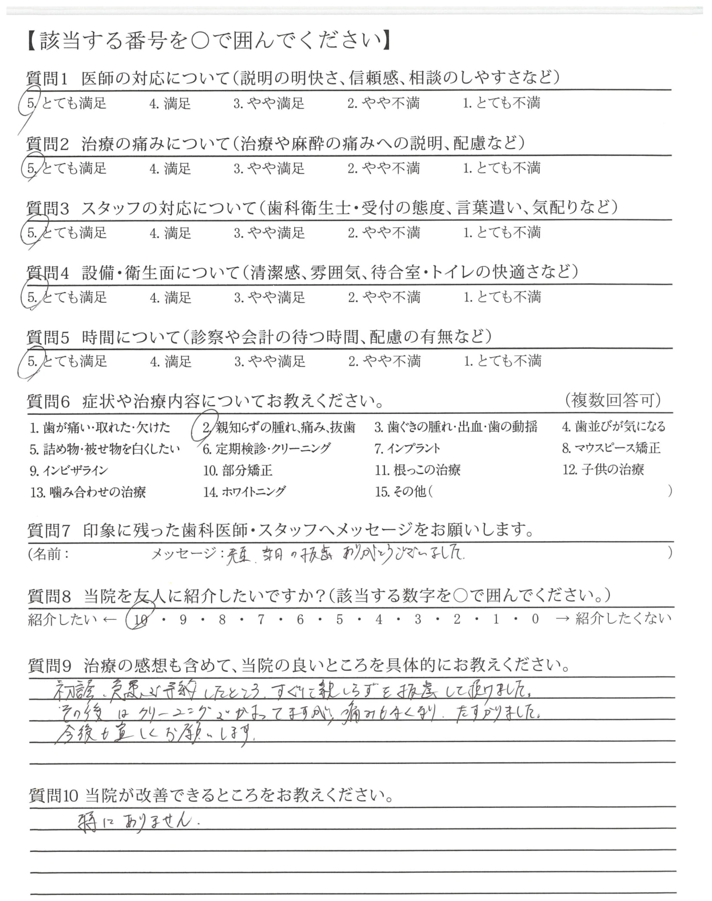抜歯のいたみがなくおどろきました。ありがとうございました。