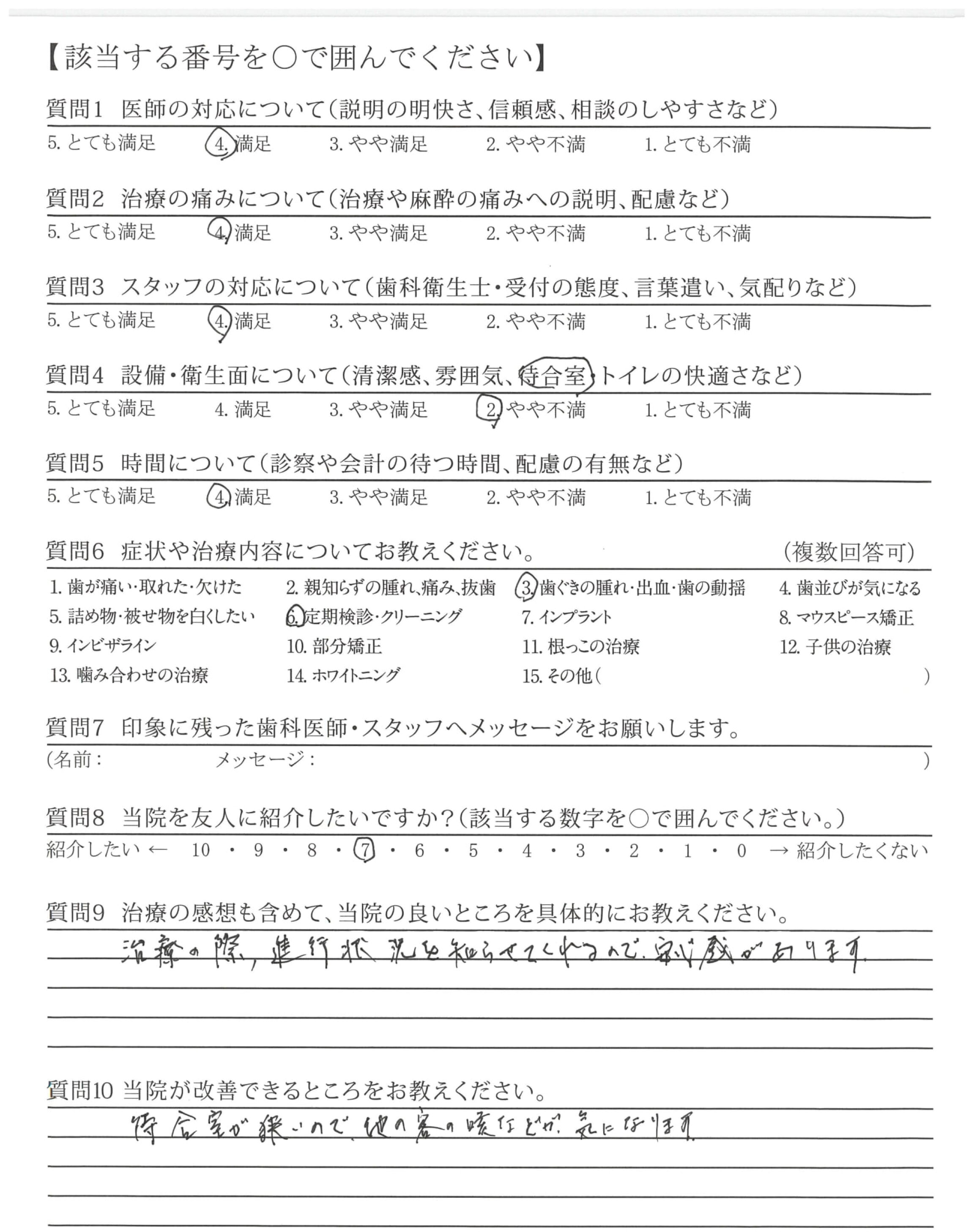 ・診察室のPCやモニターまわりなど、ホコリが目出つ。治療とは直接関係のない箇所ではあるが、パっと見でわかる状況は、改善の余地があるように思います。スタッフの負担にならない程度に、ご検討いただければ幸いなことです。