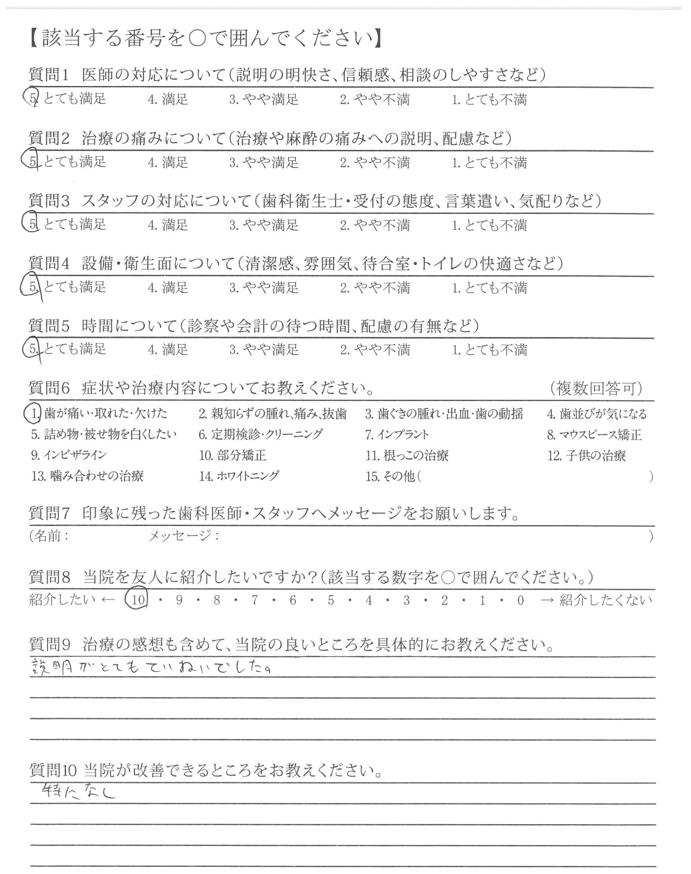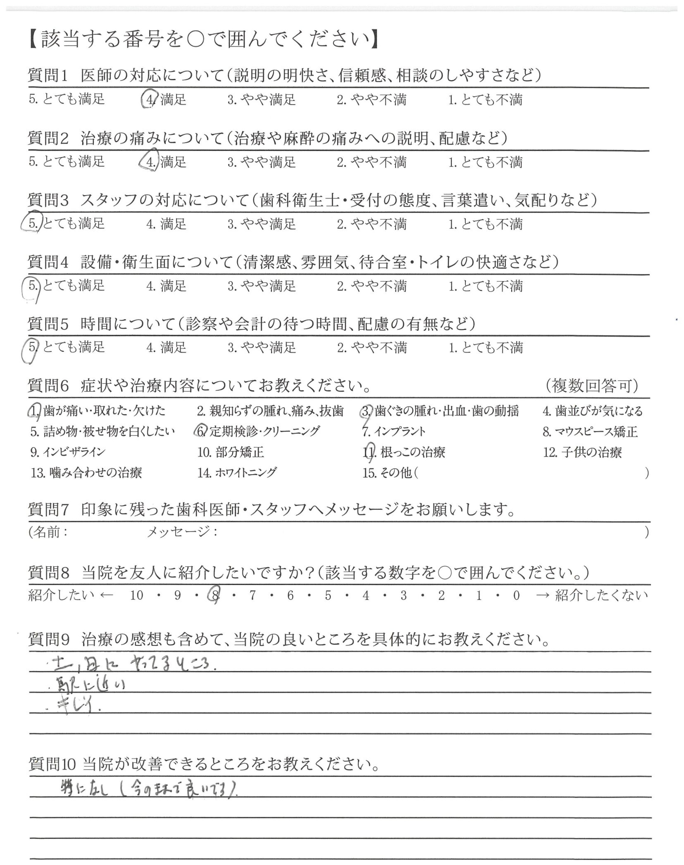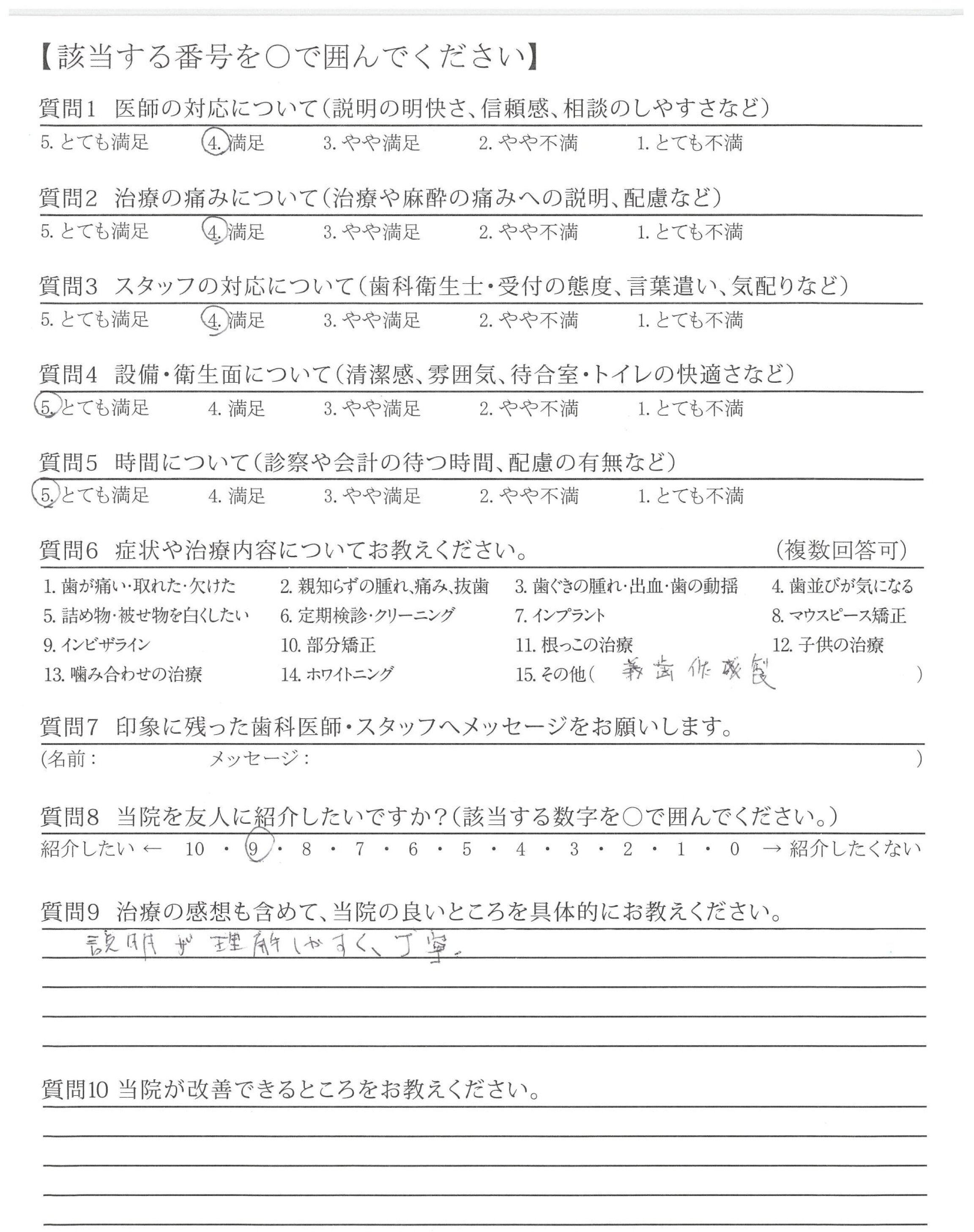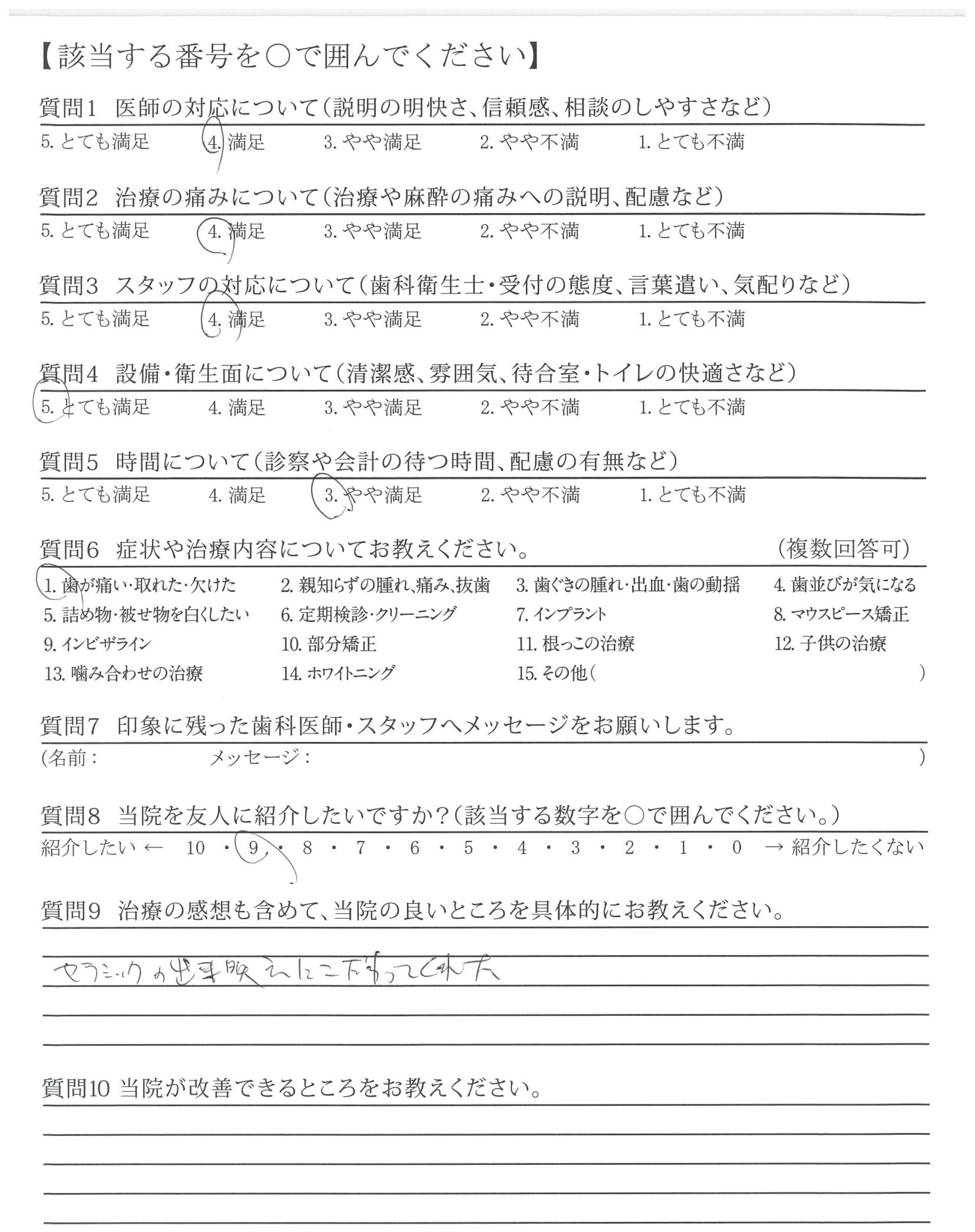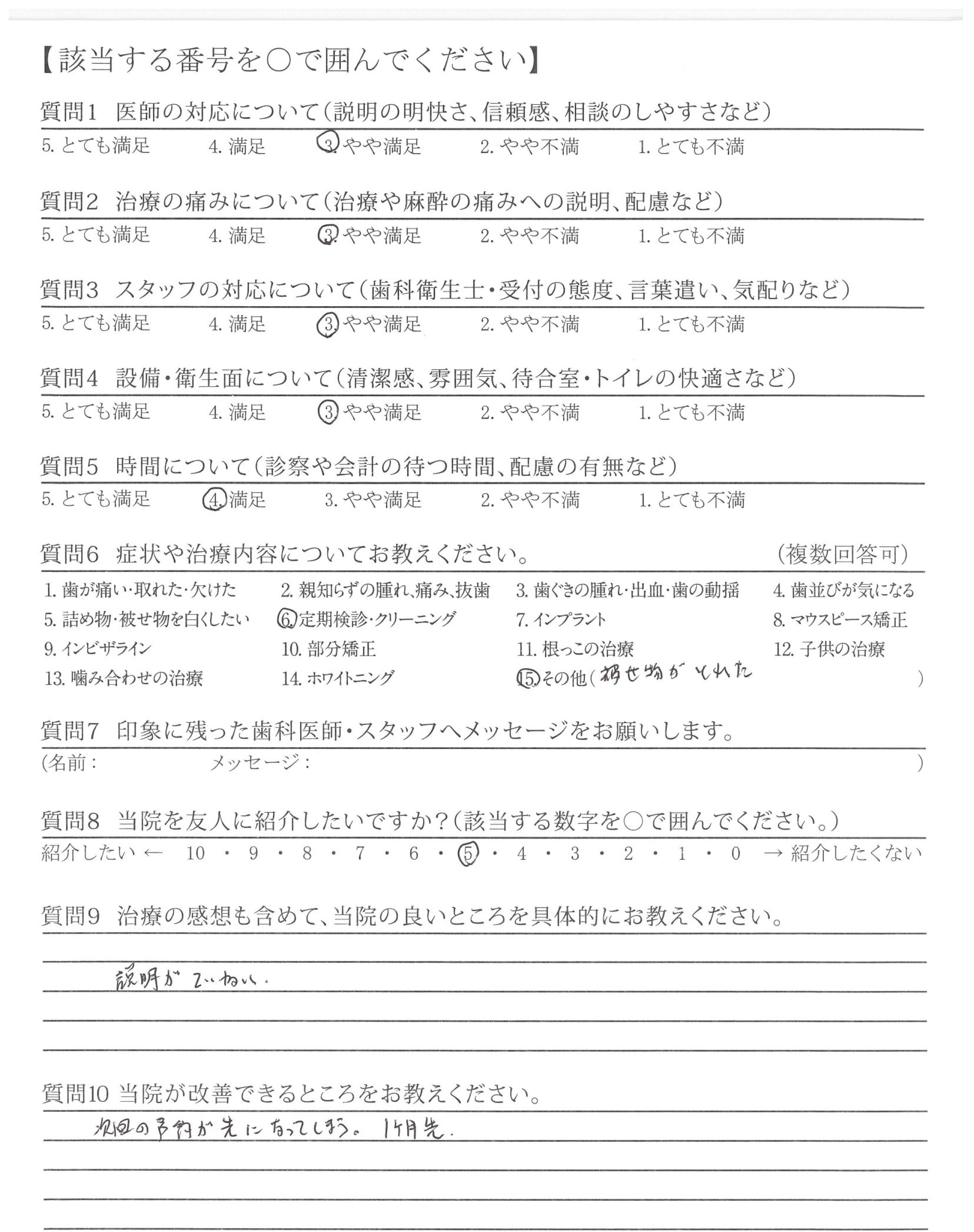 ・治療が的確で説明も的確ですが最後のかみ合わせや高さ、ひっかかりを聞いてほしい。
