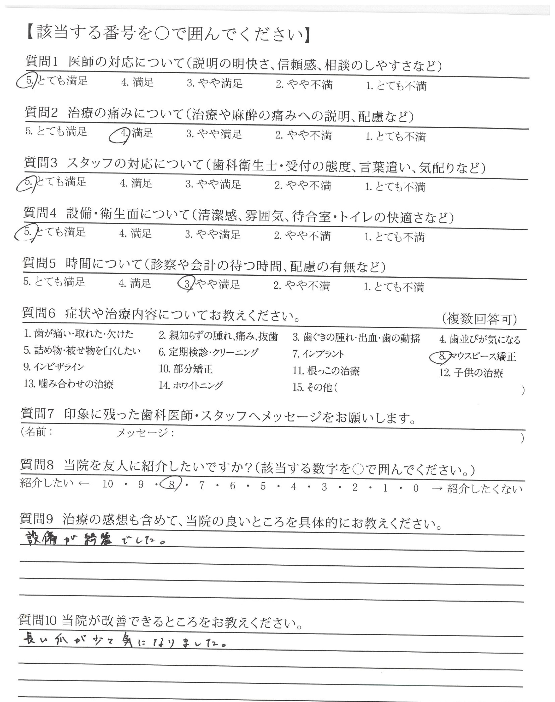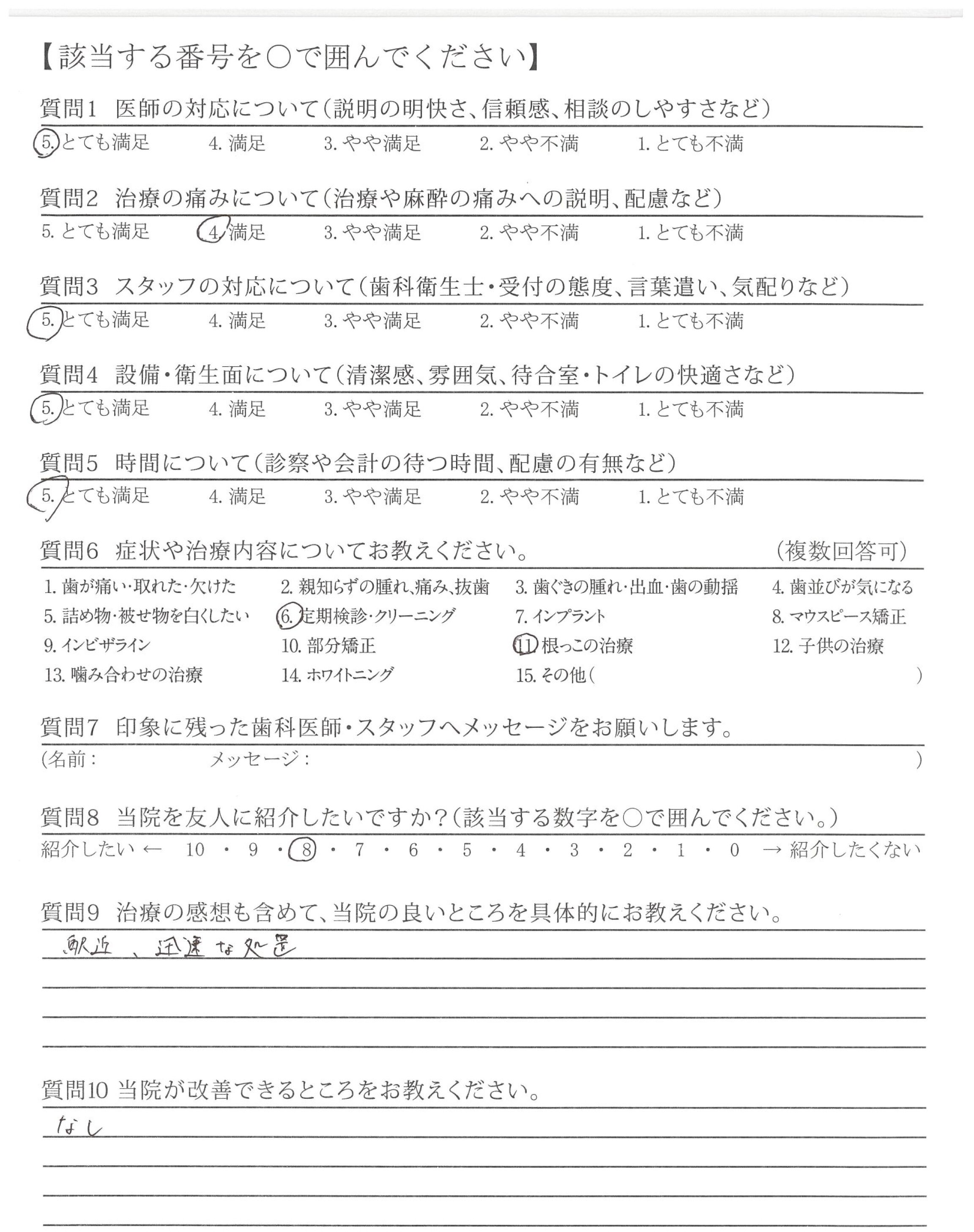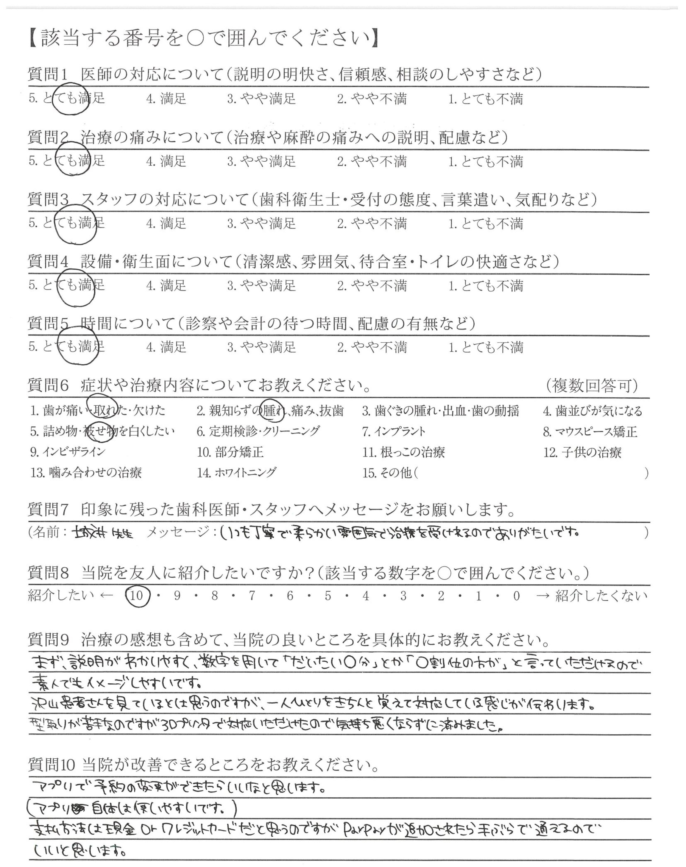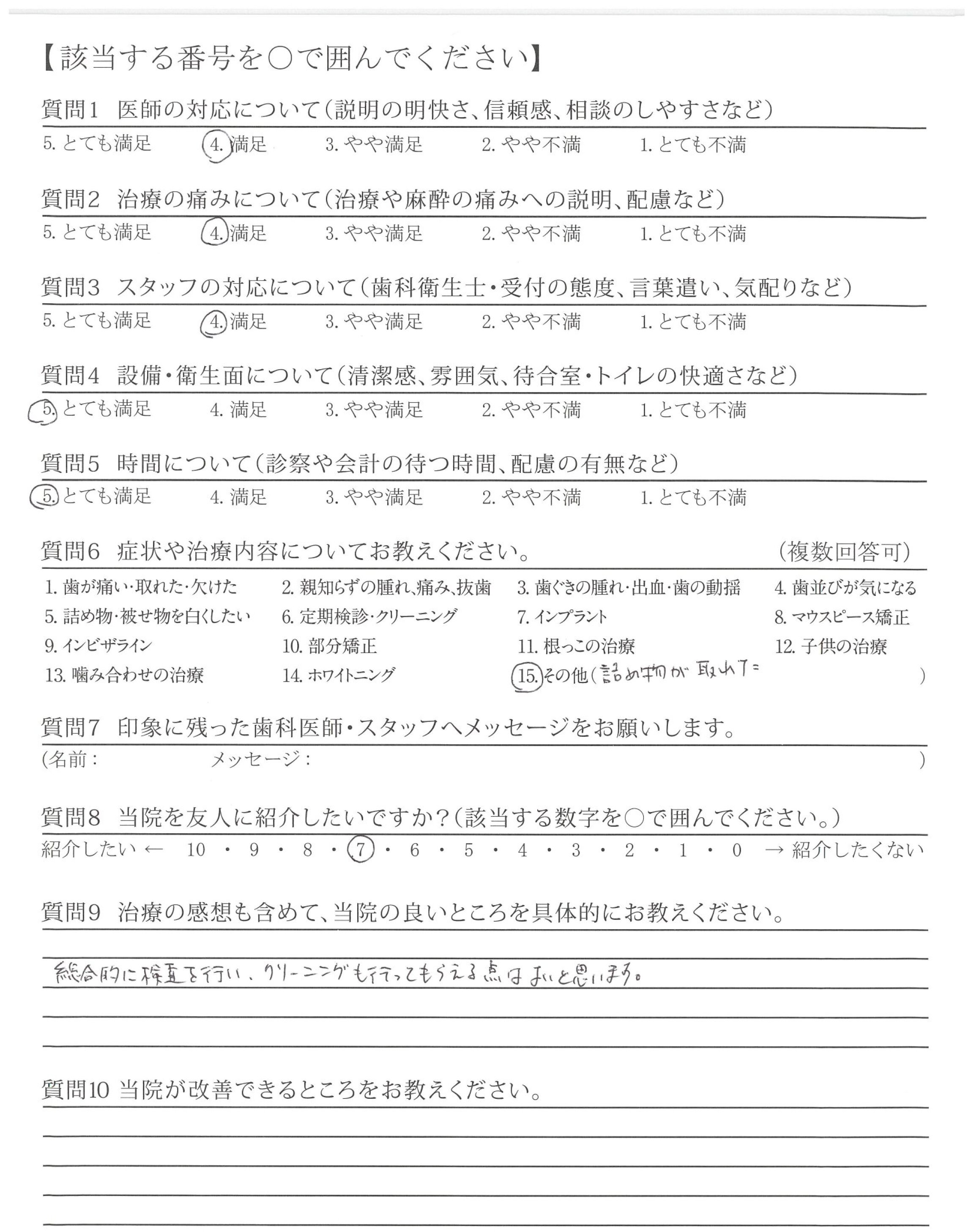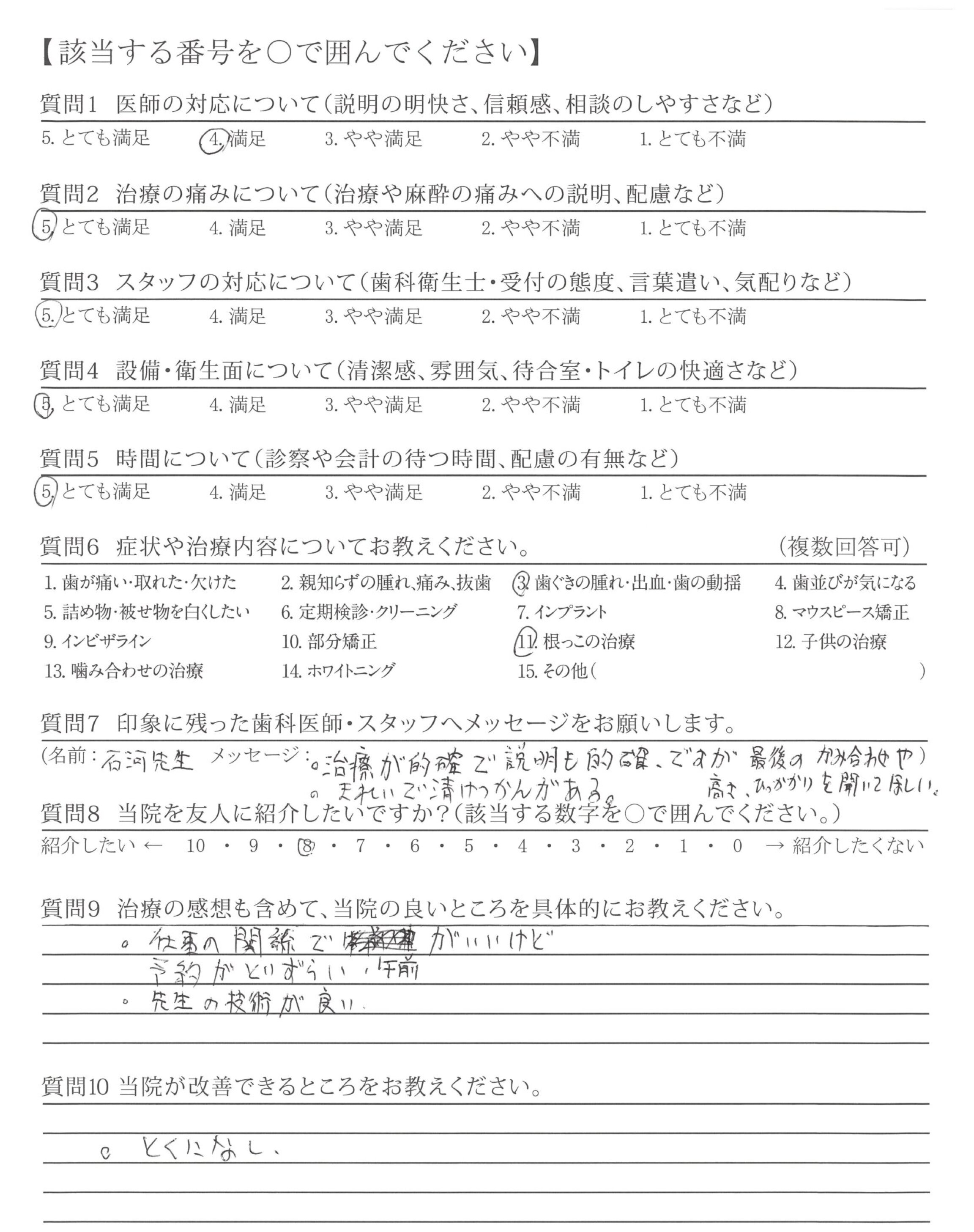 ・治療が的確で説明も的確ですが最後のかみ合わせや高さ、ひっかかりを聞いてほしい。