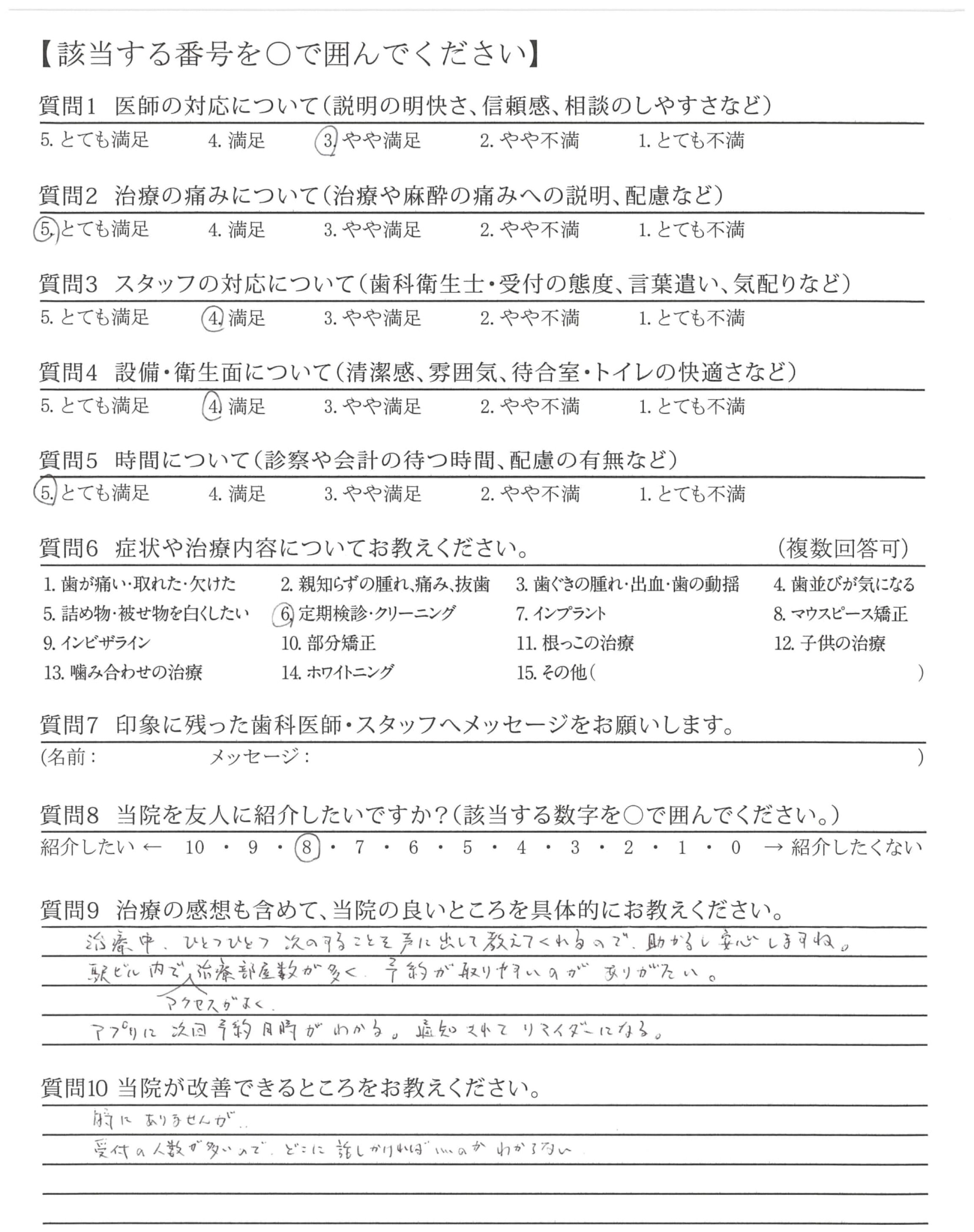 医師の方、衛生士の方に威圧感がなく、相談しやすい。