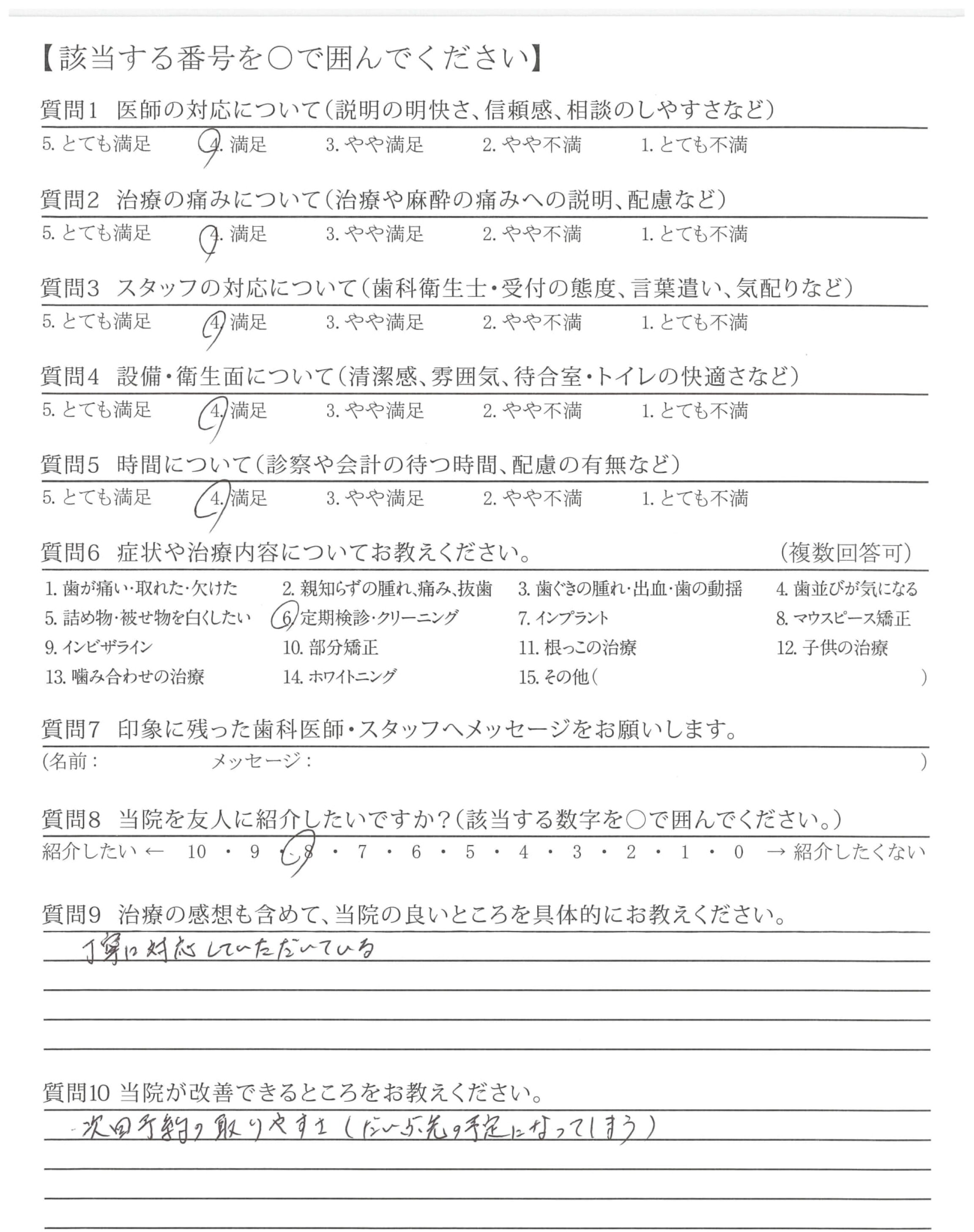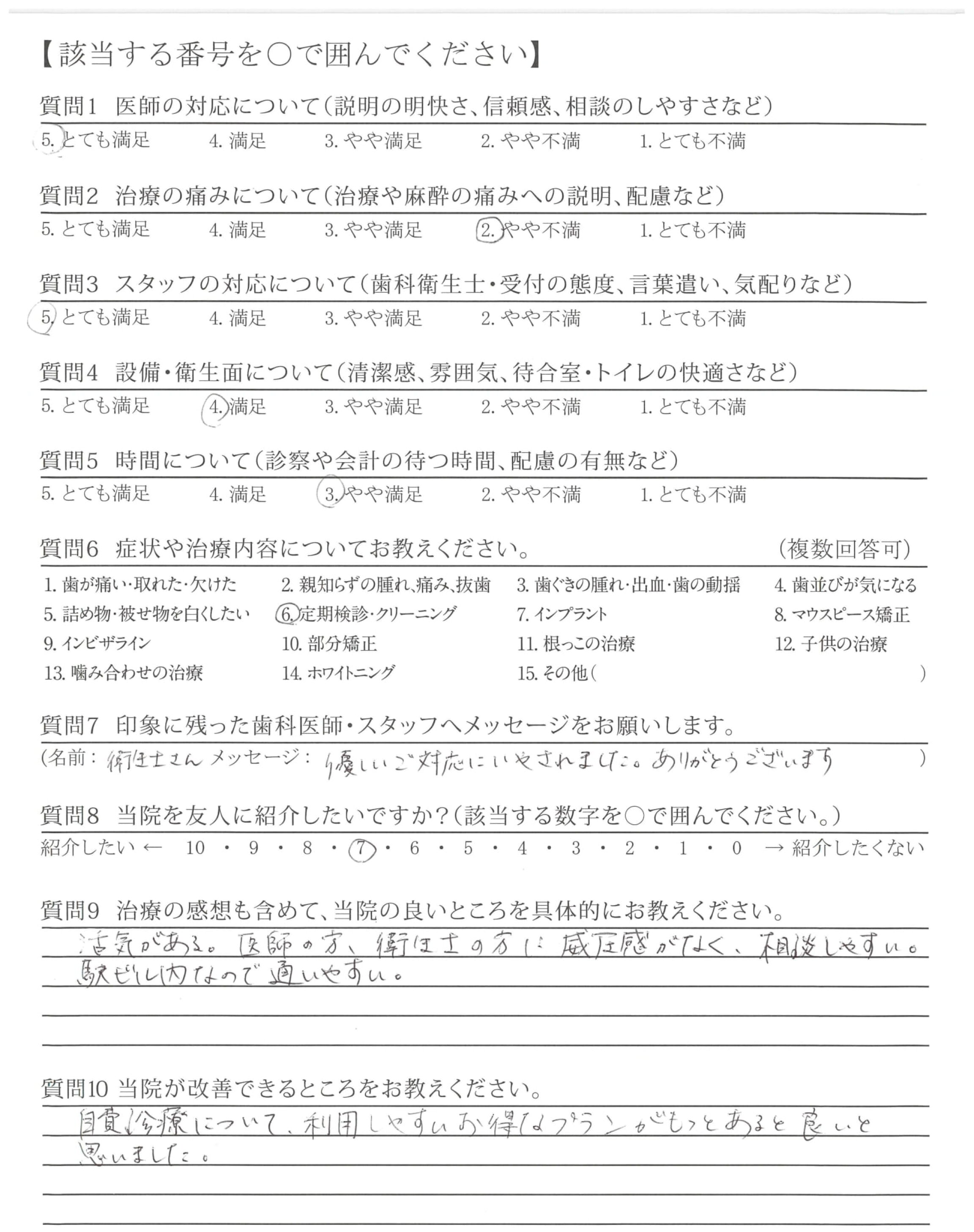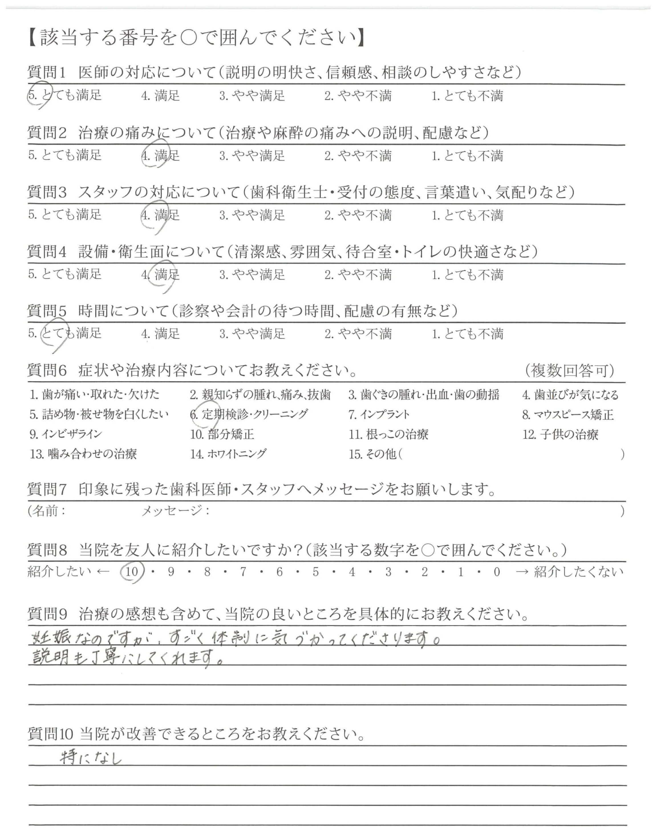 いつも丁寧に説明や治療をしてくれます。痛みがないようできるだけ優しくしてくれ今までの恐怖心が和らぎました。ありがとうございます。