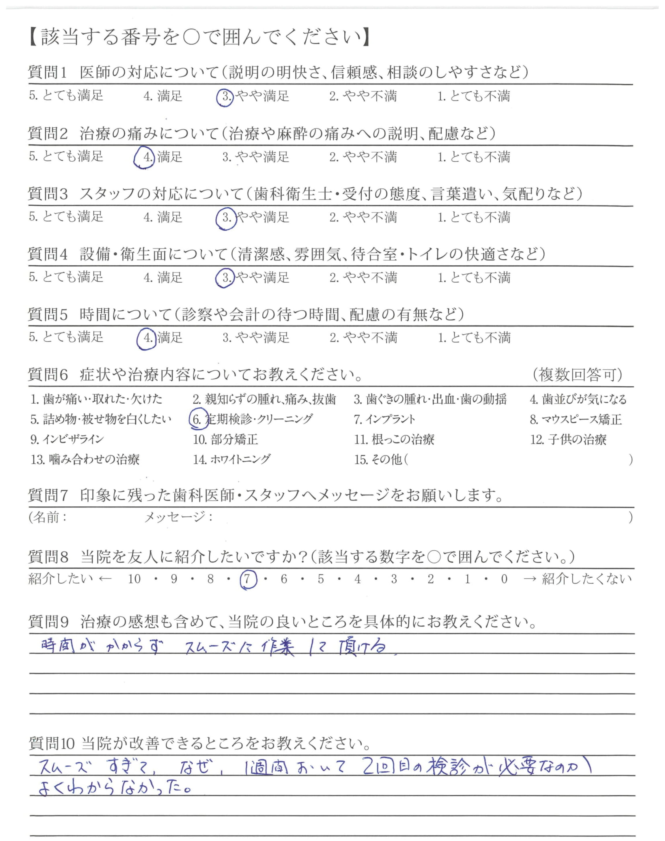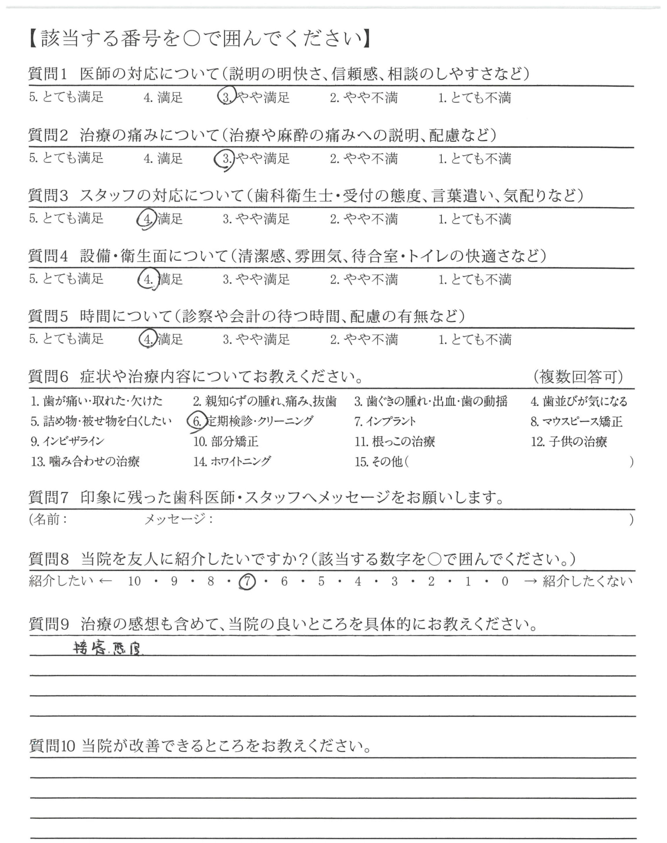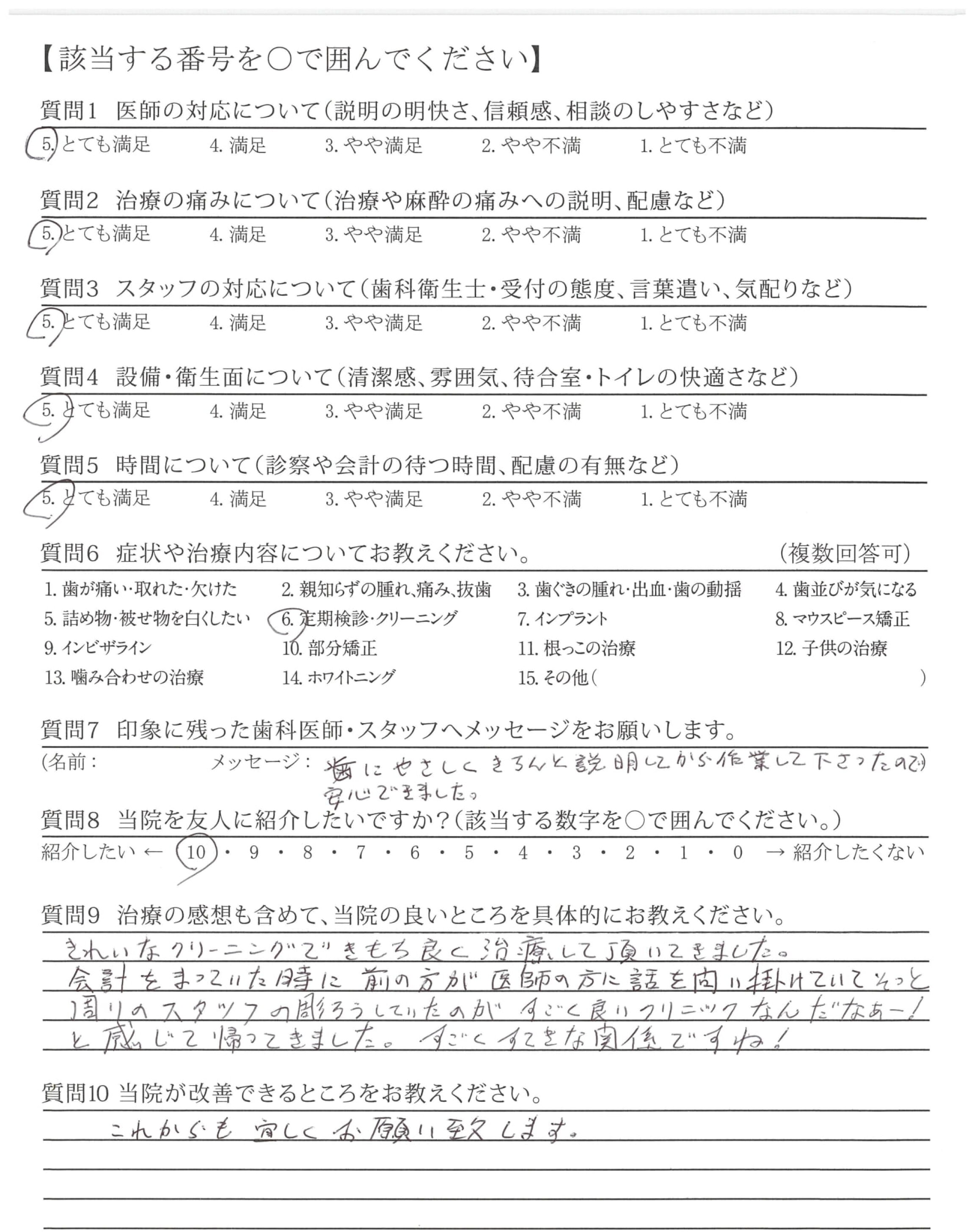 患者側からしたら自分の目で見えないので(治療中)信頼感が持てる様になるには少し時間がかかりますが、とても丁寧な治療をして頂き、安心できました。ありがとうございます。