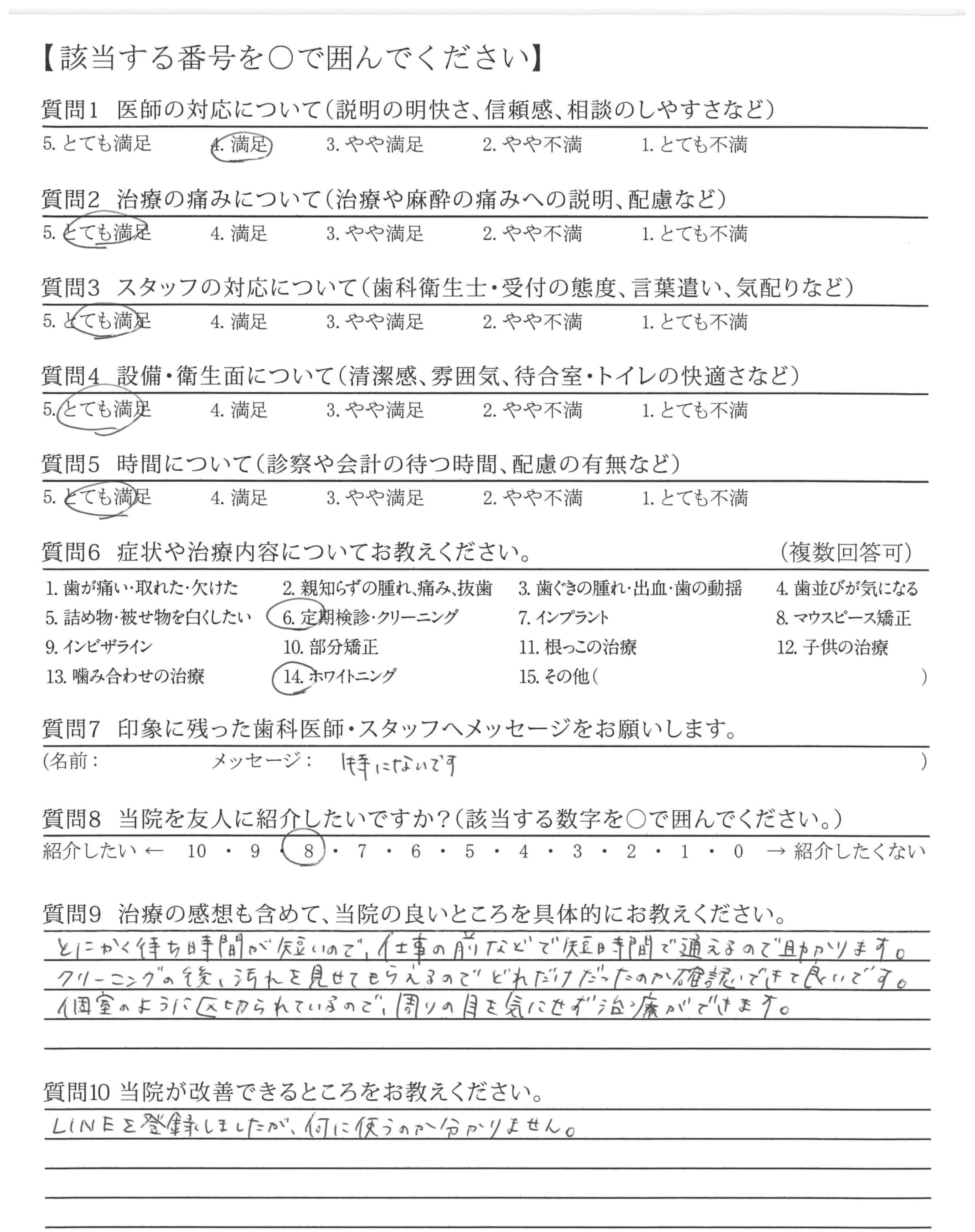 特に今回初めてホワイトニング(ホームクリーニング含め)を実施しました!周りからもキレイになったねとか、歯白いねとか言われるので、うれしかったです!他の人にもおススメしたいです。
