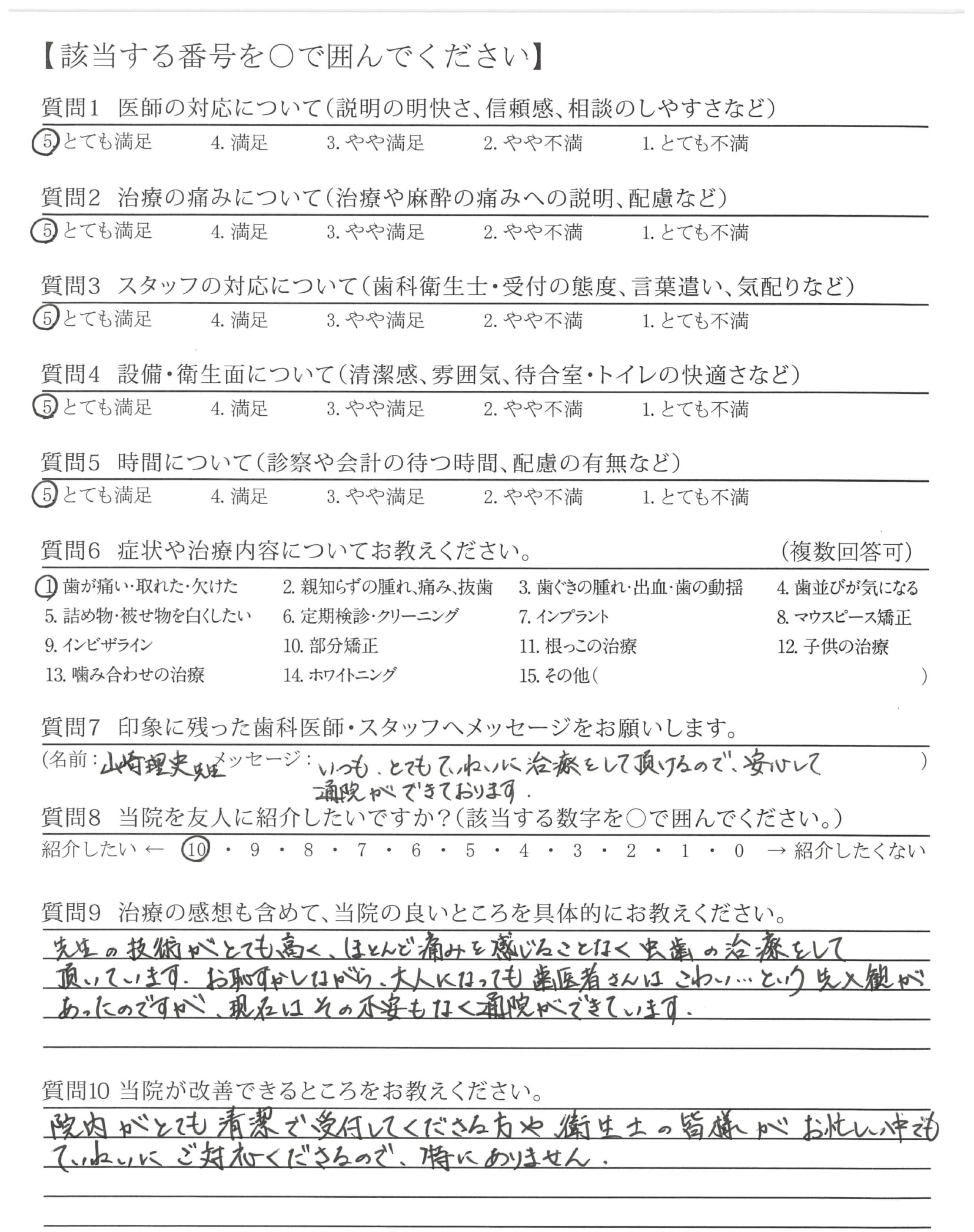 歯科治療時の痛みがこわかったのですが、丁寧な声掛けと適切な治療のおかげで、痛みをほとんど感じませんでした。