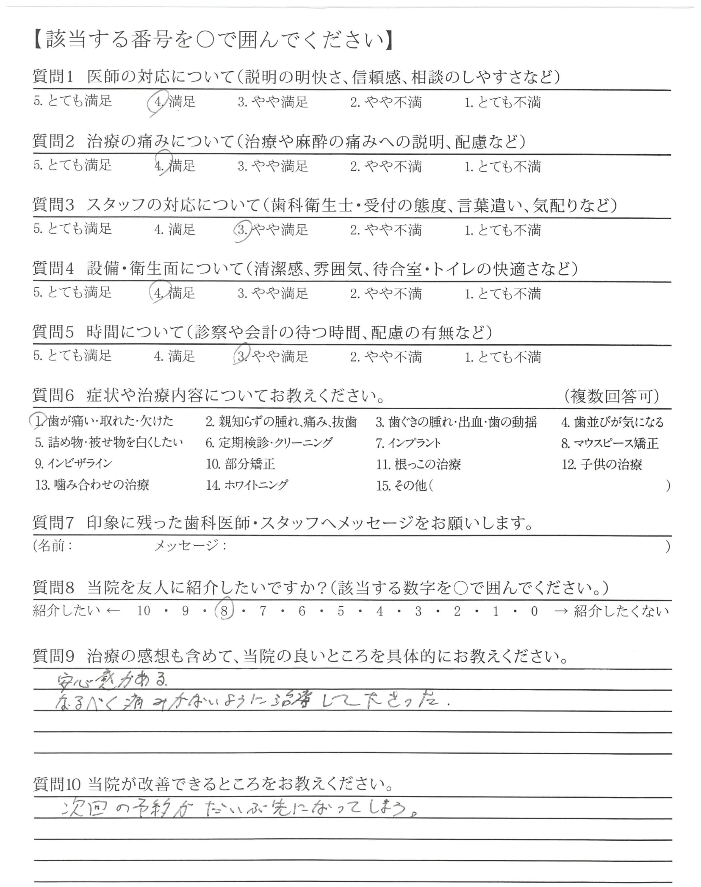 治療の進め方、麻酔のリスクなどを簡潔かつ丁寧に説明して下さり、また治療も最短の回数で終われるように、次回予約までの日数も少なく取れて、非常に親切だと思いました。(中には治療の期間や回数を多くしようとする歯科もあるので。)