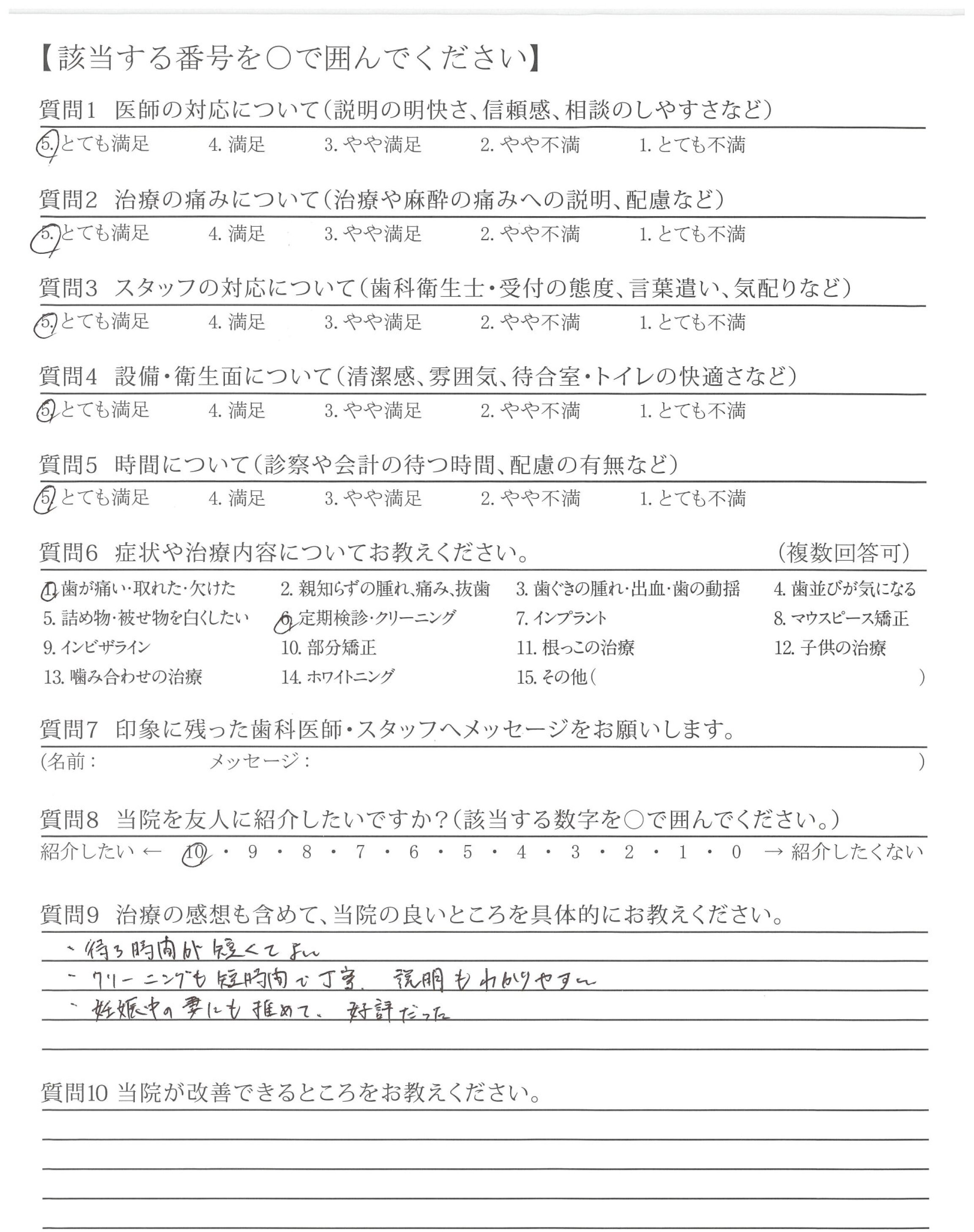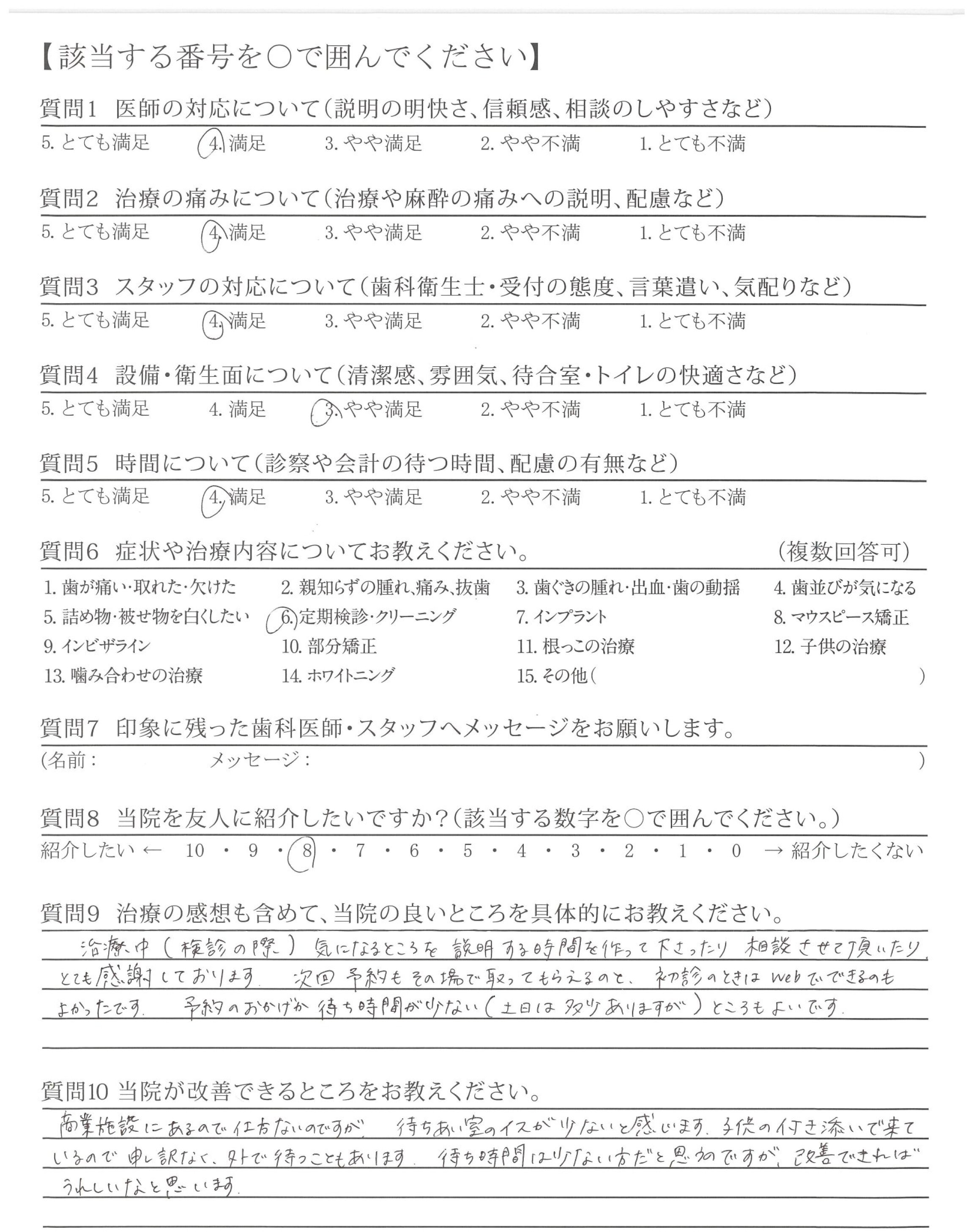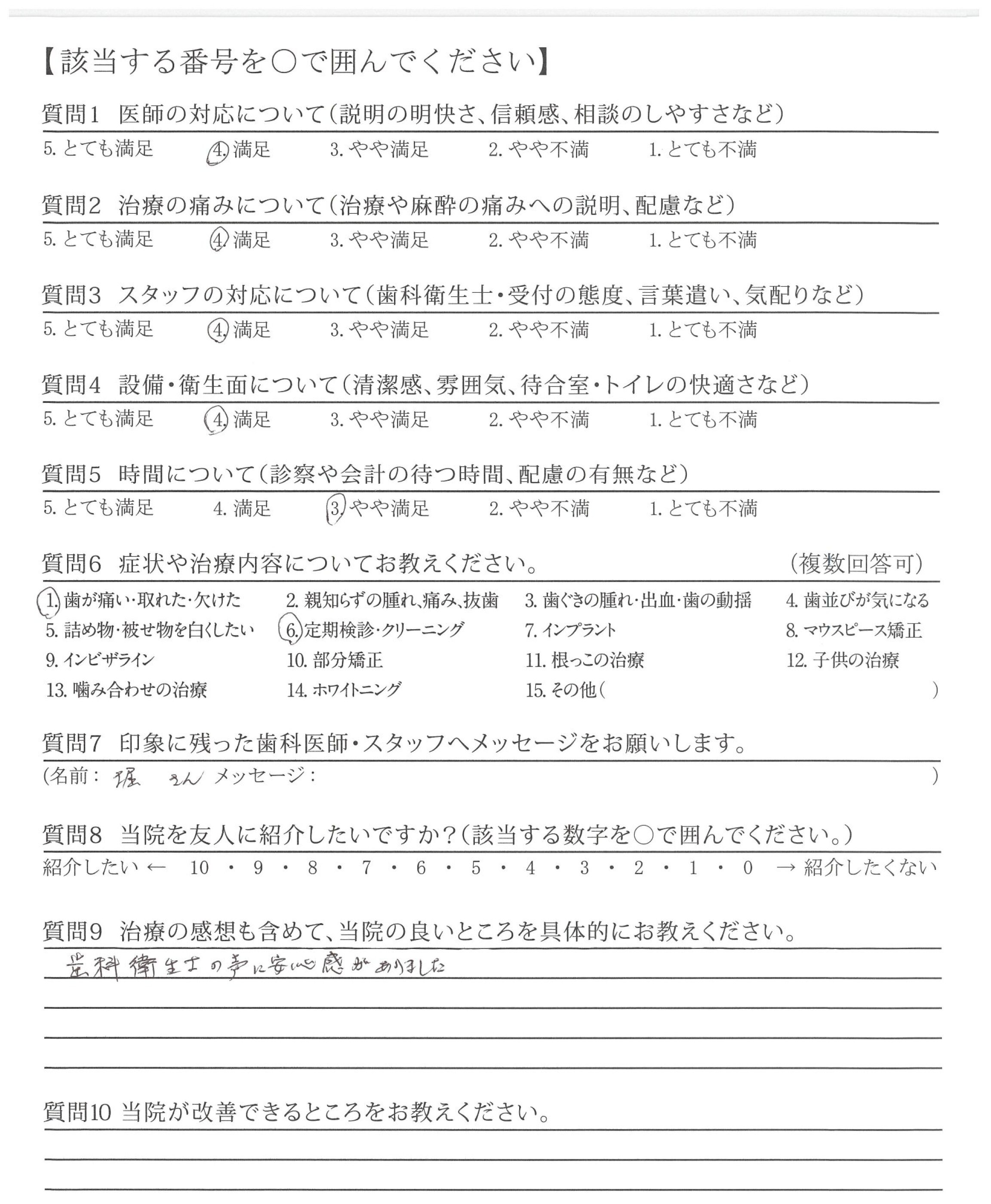 いつもとても丁寧にクリーニングしていただけるので歯医者に行った後はとても気持ちが良いです。また、丁寧に説明してくださるので安心してお任せできます。
